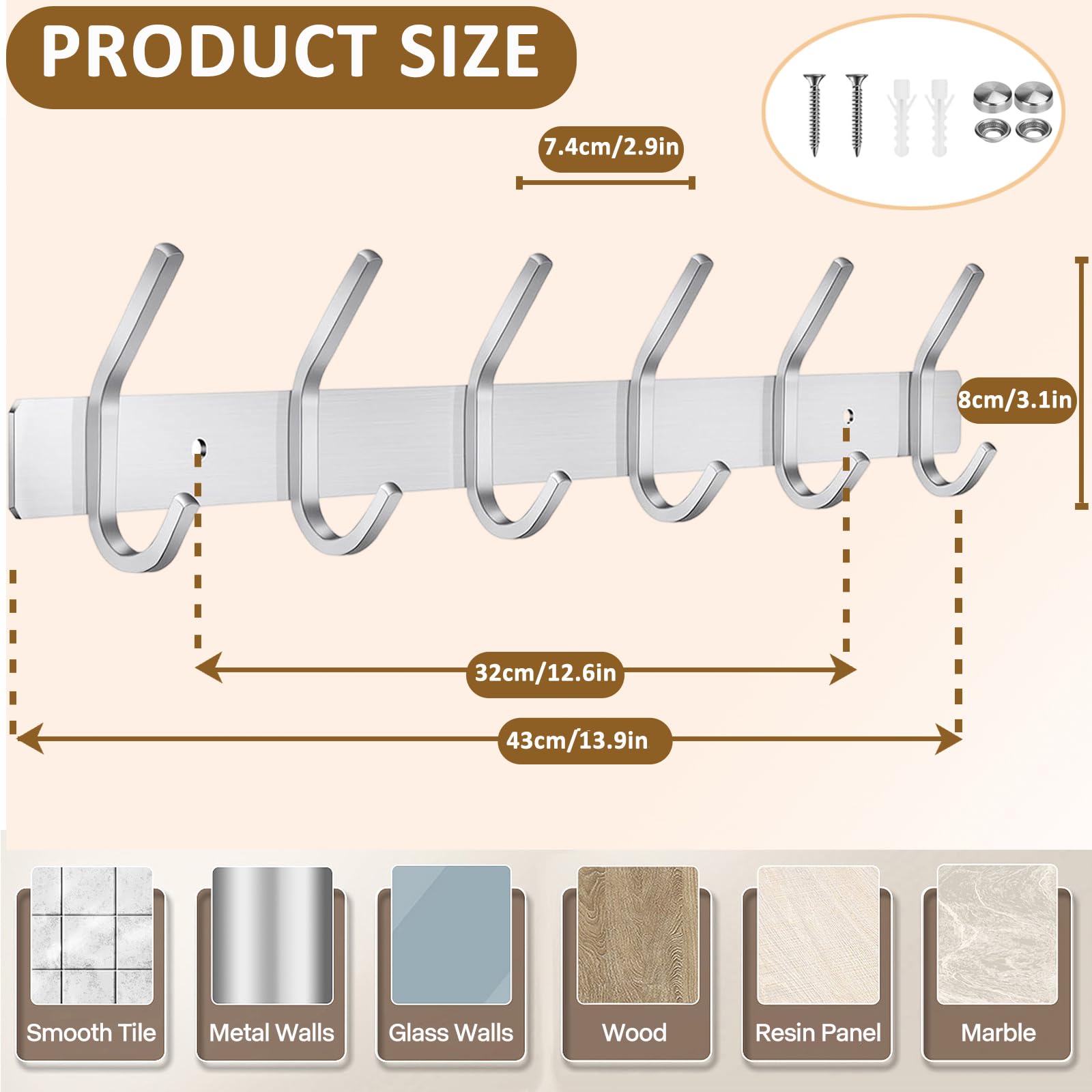JOLY FANG Wandgarderobe, Garderobenhaken aus Edelstahl, Wandhaken für Schlafzimmer, Badezimmer, Küche (6 Haken, 2 Stück, Silber)