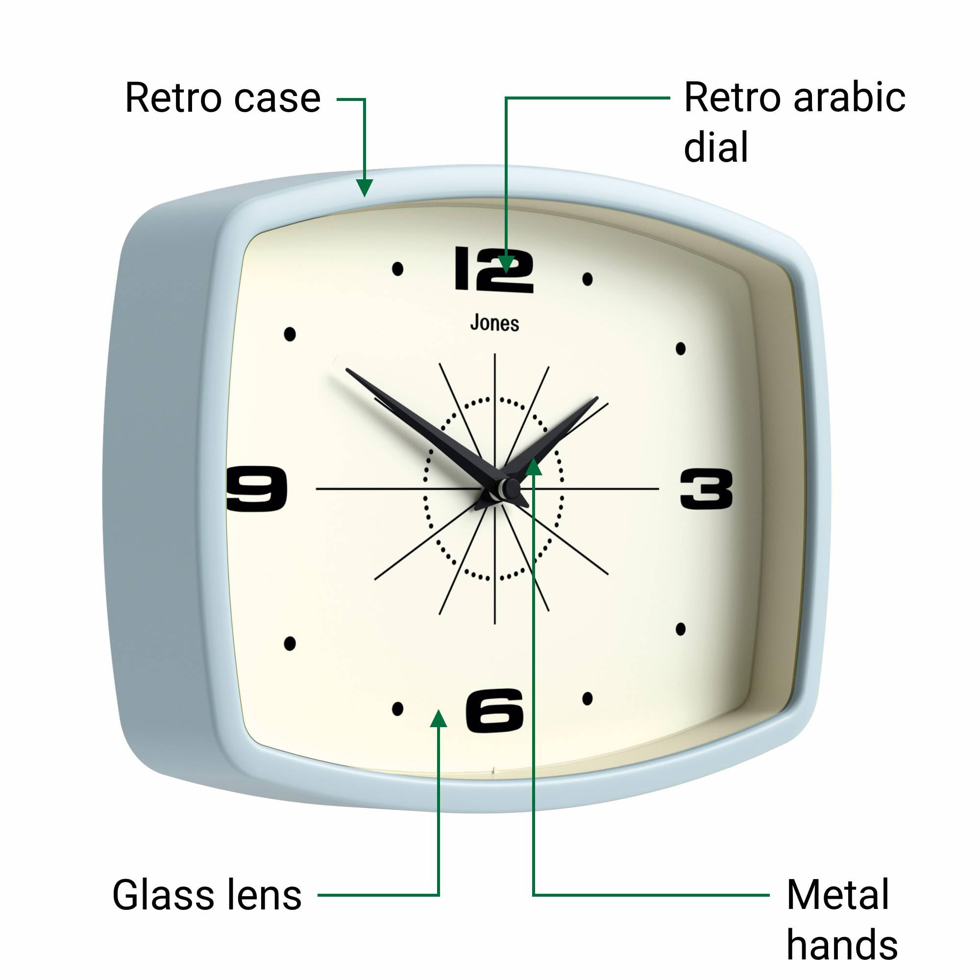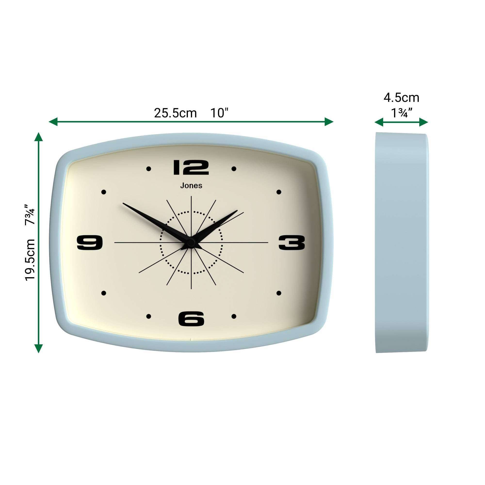 JONES CLOCKS® Movie wanduhr | Retro rechteckige Uhr | 25 cm | Hellblau | Cooler Designer-Look im mid-Century-Stil für küche, Wohnzimmer oder büro