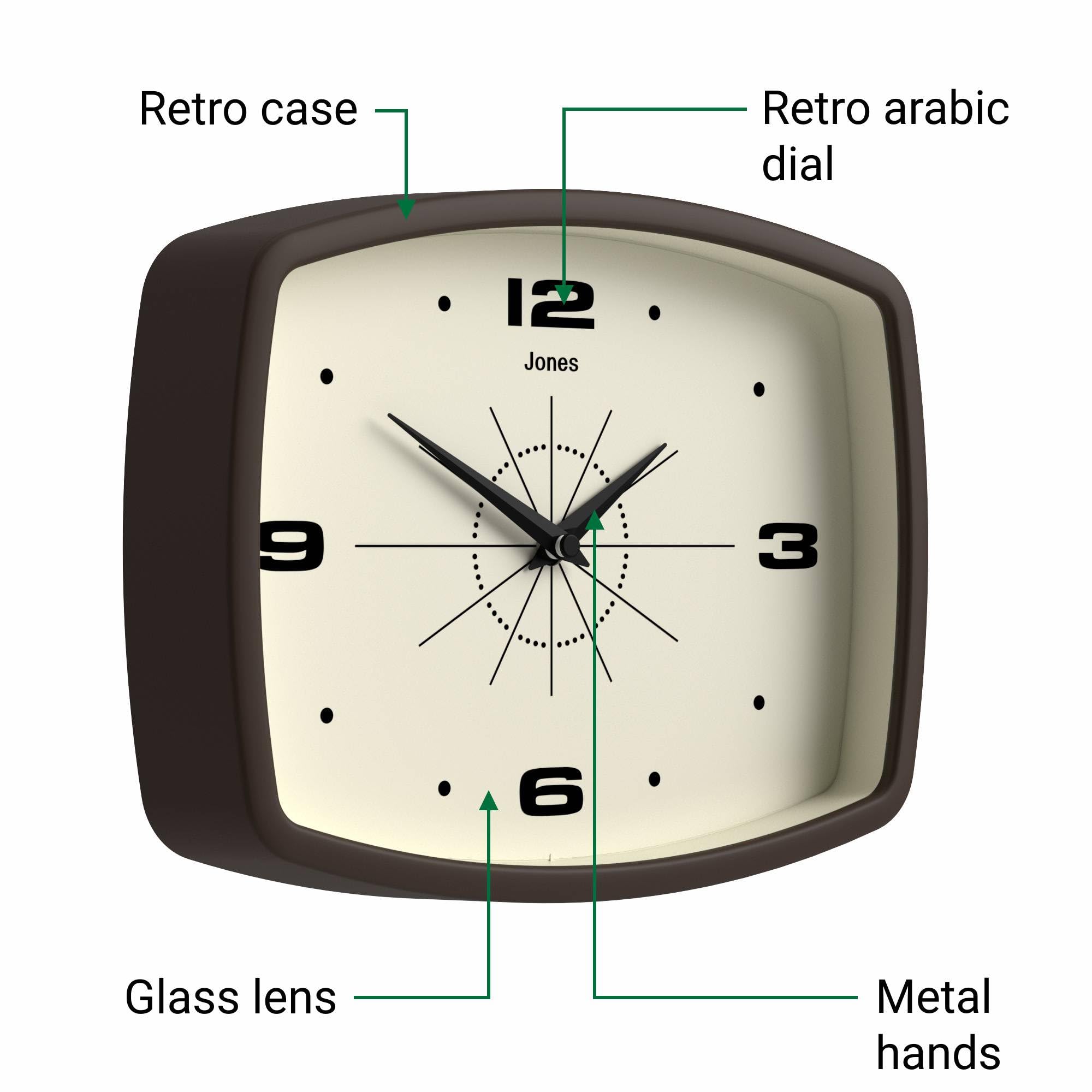 Jones Clocks® Movie wanduhr | Retro rechteckige Uhr | 25 cm | Mocha-Braun | Cooler Designer-Look im mid-Century-Stil für küche, Wohnzimmer oder büro