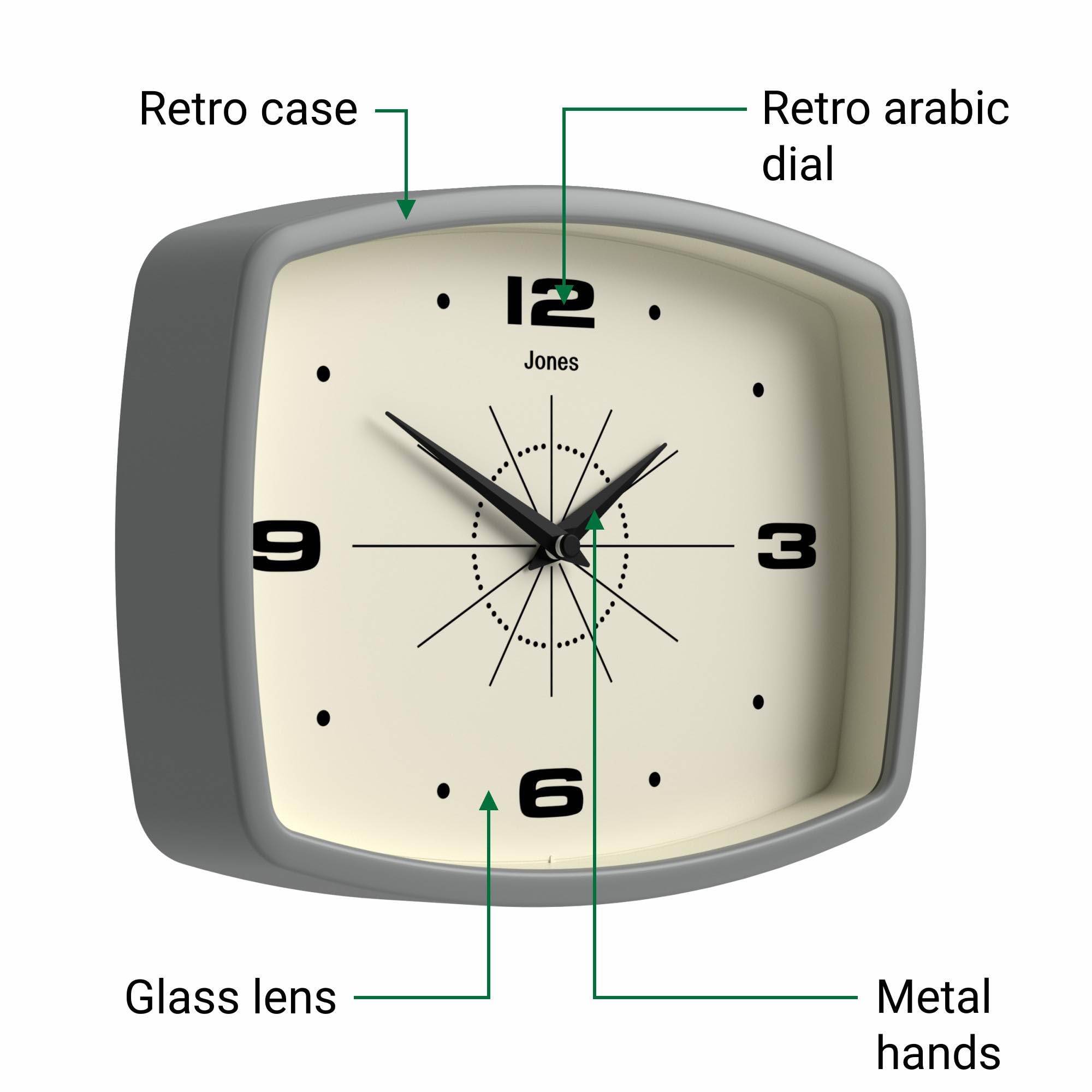 Jones Clocks® Movie wanduhr | Retro rechteckige uhr | 25 cm | Grau | Cooler designer-look im mid-century-stil für küche, wohnzimmer oder büro