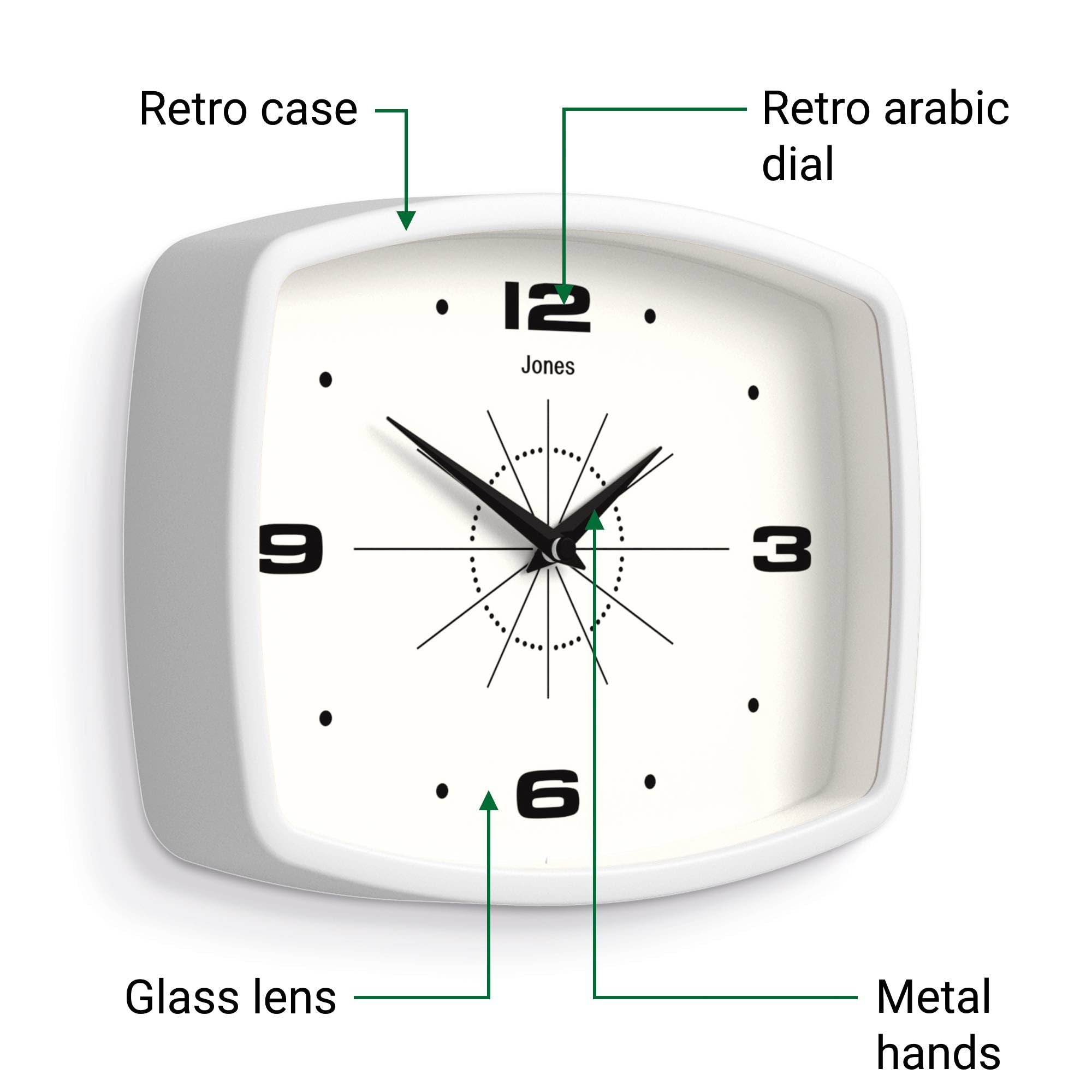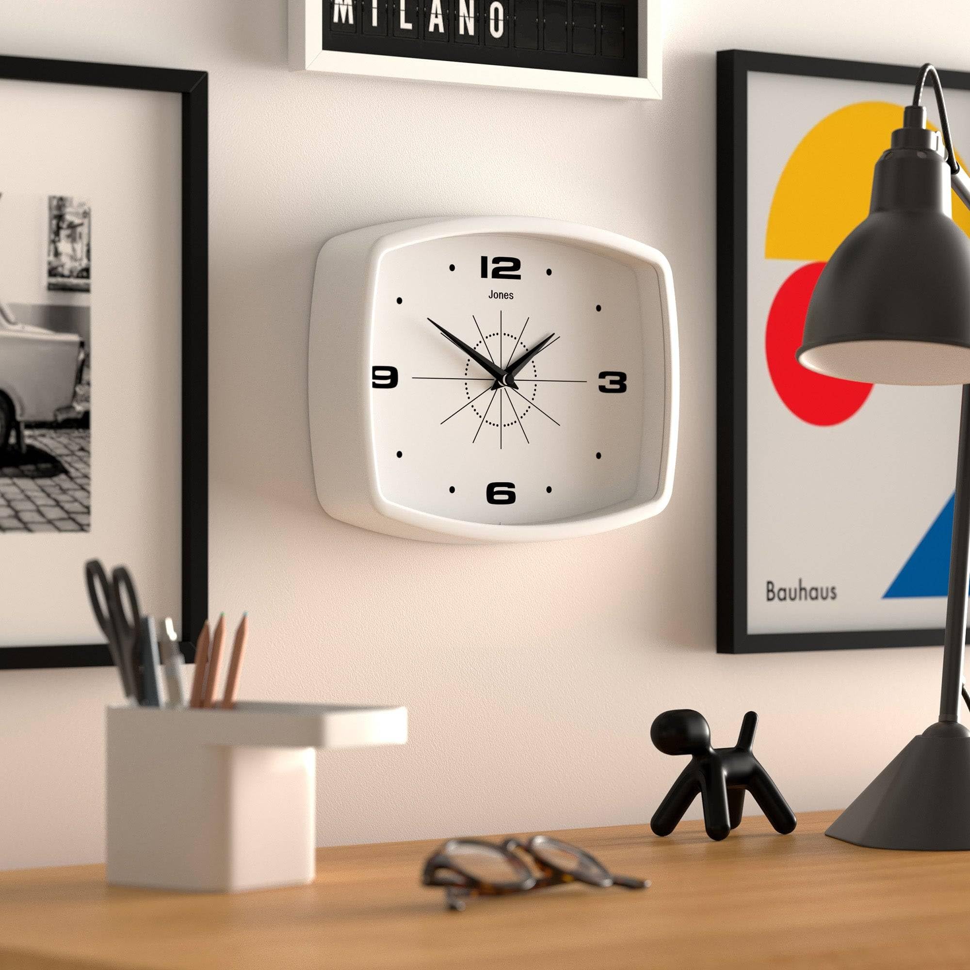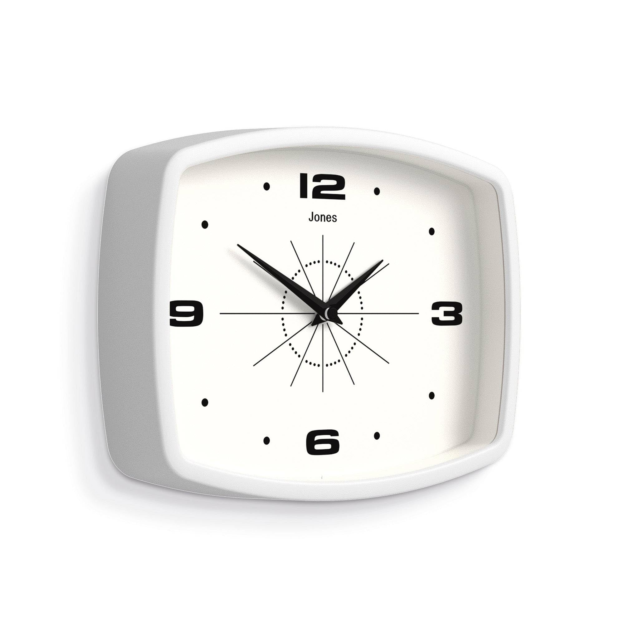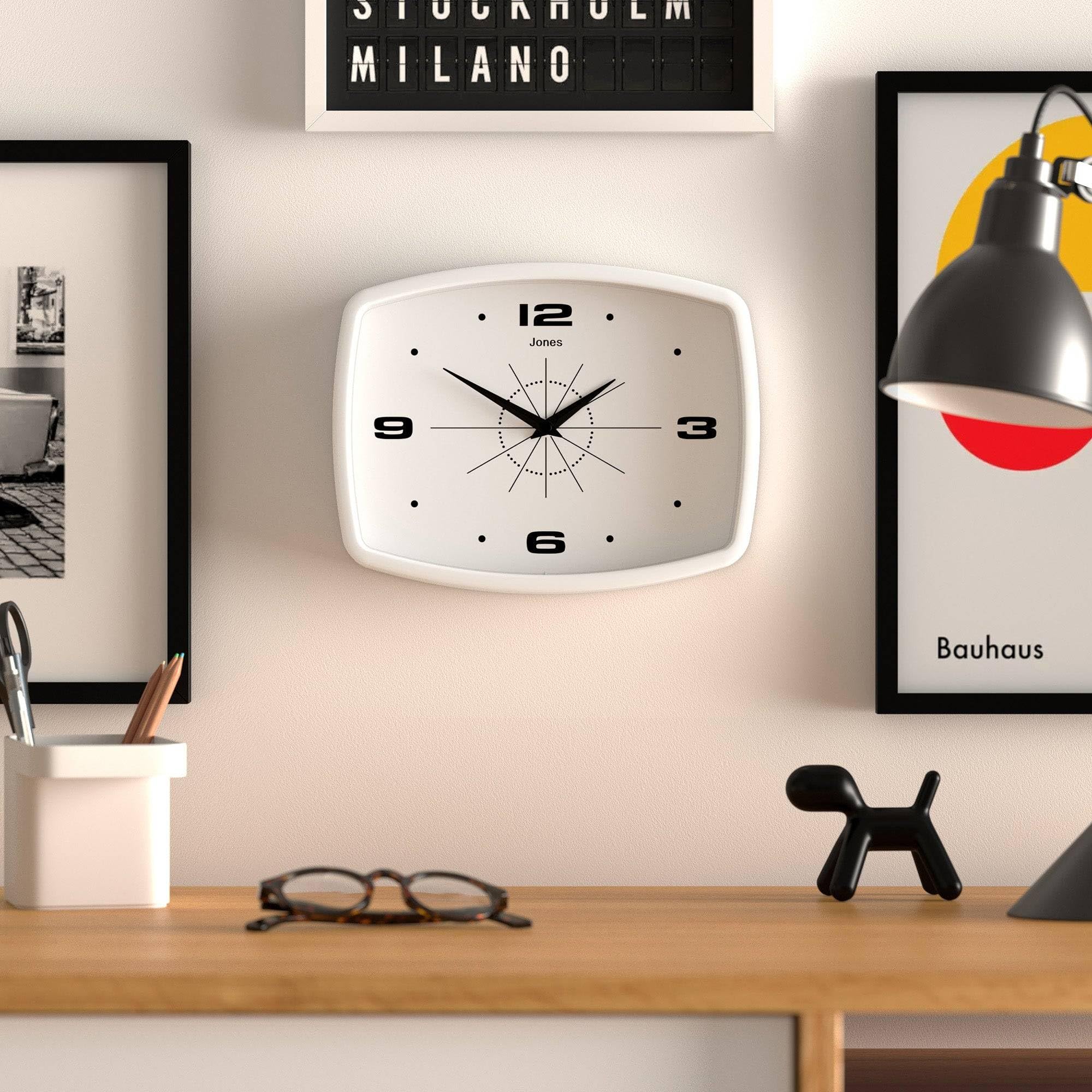 JONES CLOCKS® Movie wanduhr | Retro rechteckige Uhr | 25 cm | Weiss | Cooler Designer-Look im mid-Century-Stil für küche, Wohnzimmer oder büro