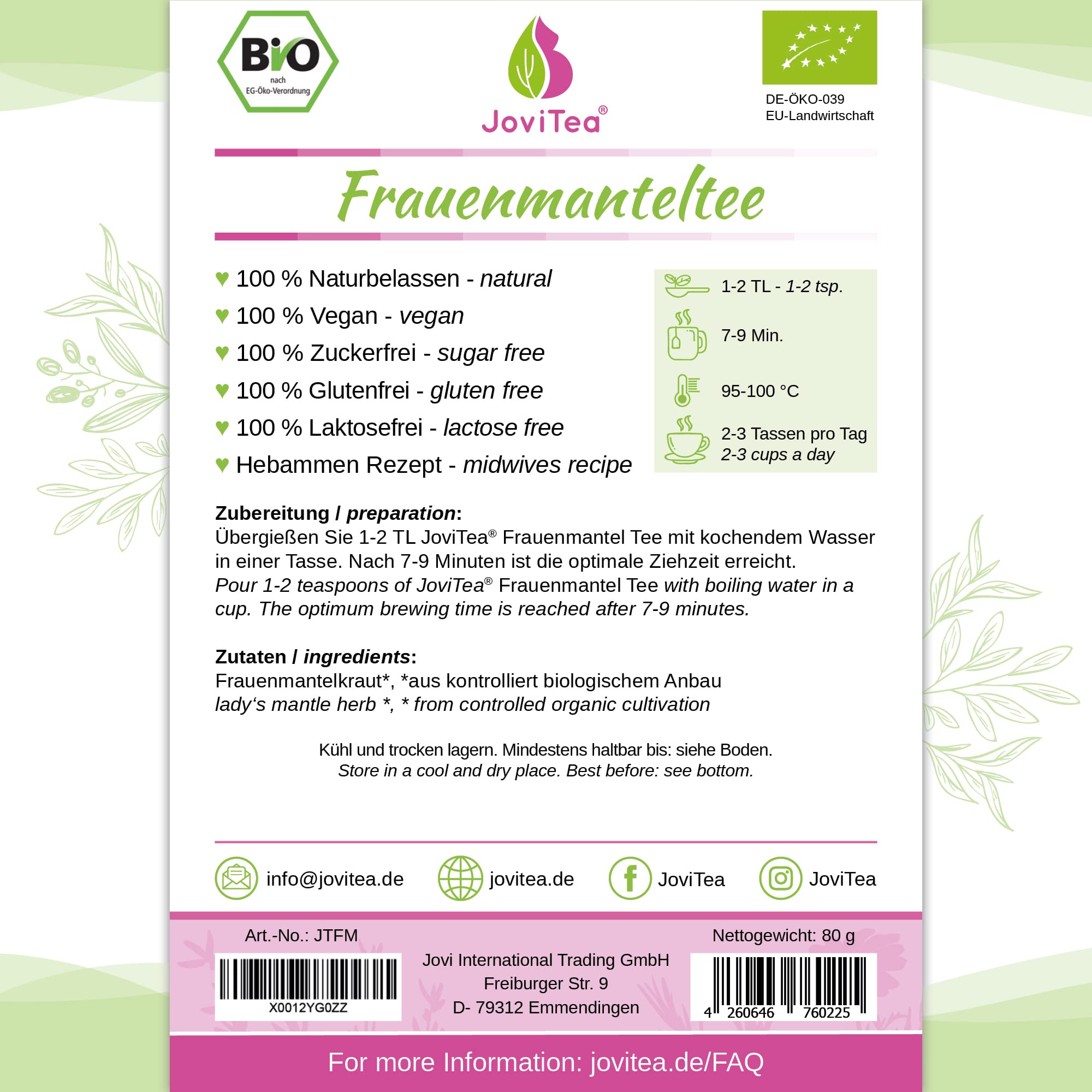 JoviTea® Frauenmanteltee BIO, geeignet vor der Schwangerschaft, wird meist in der 2. Zyklushälfte getrunken, geerntet in Deutschland, 100% natürlich und ohne Zusatz von Zucker - 80g