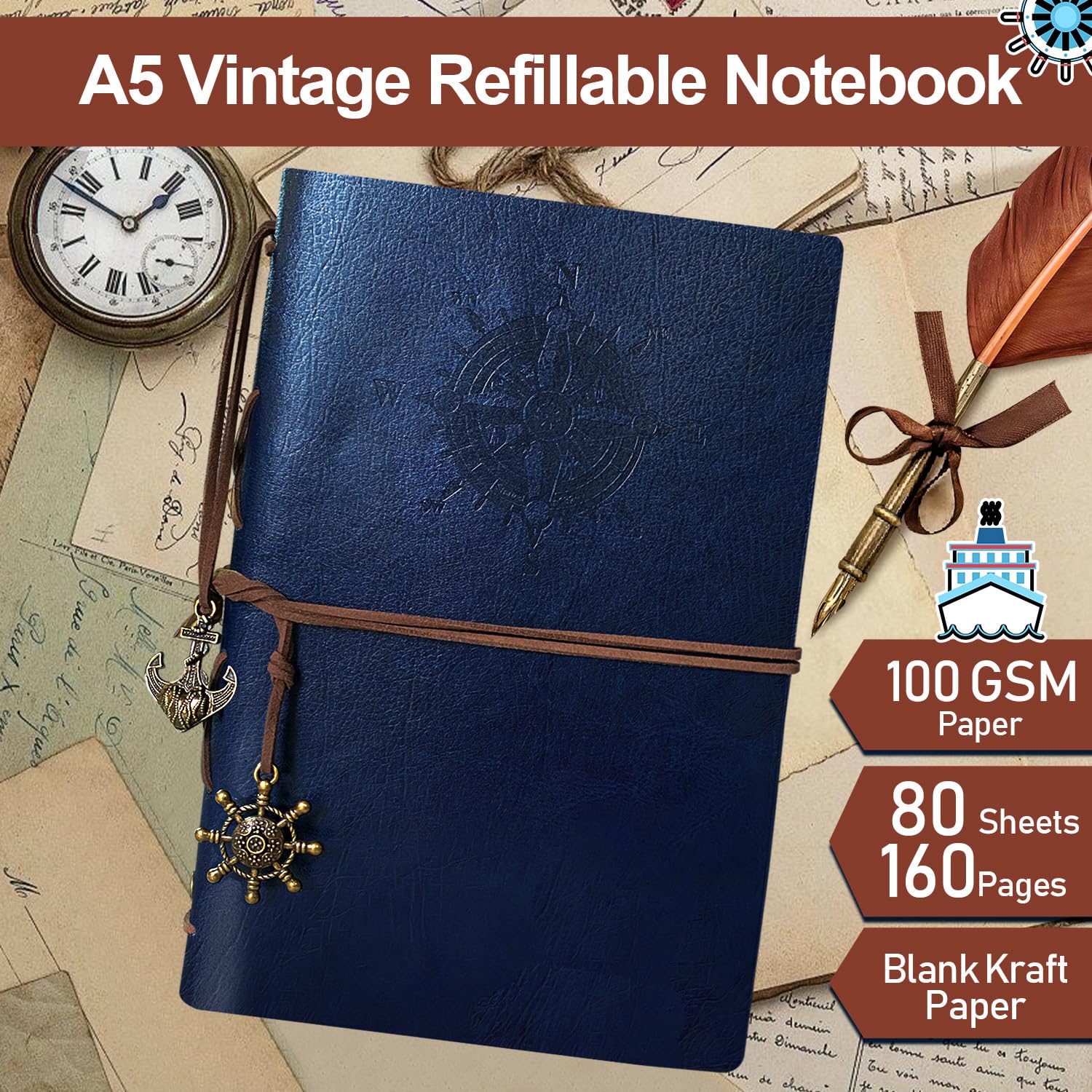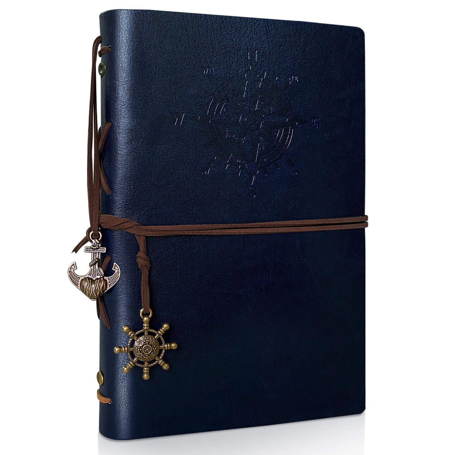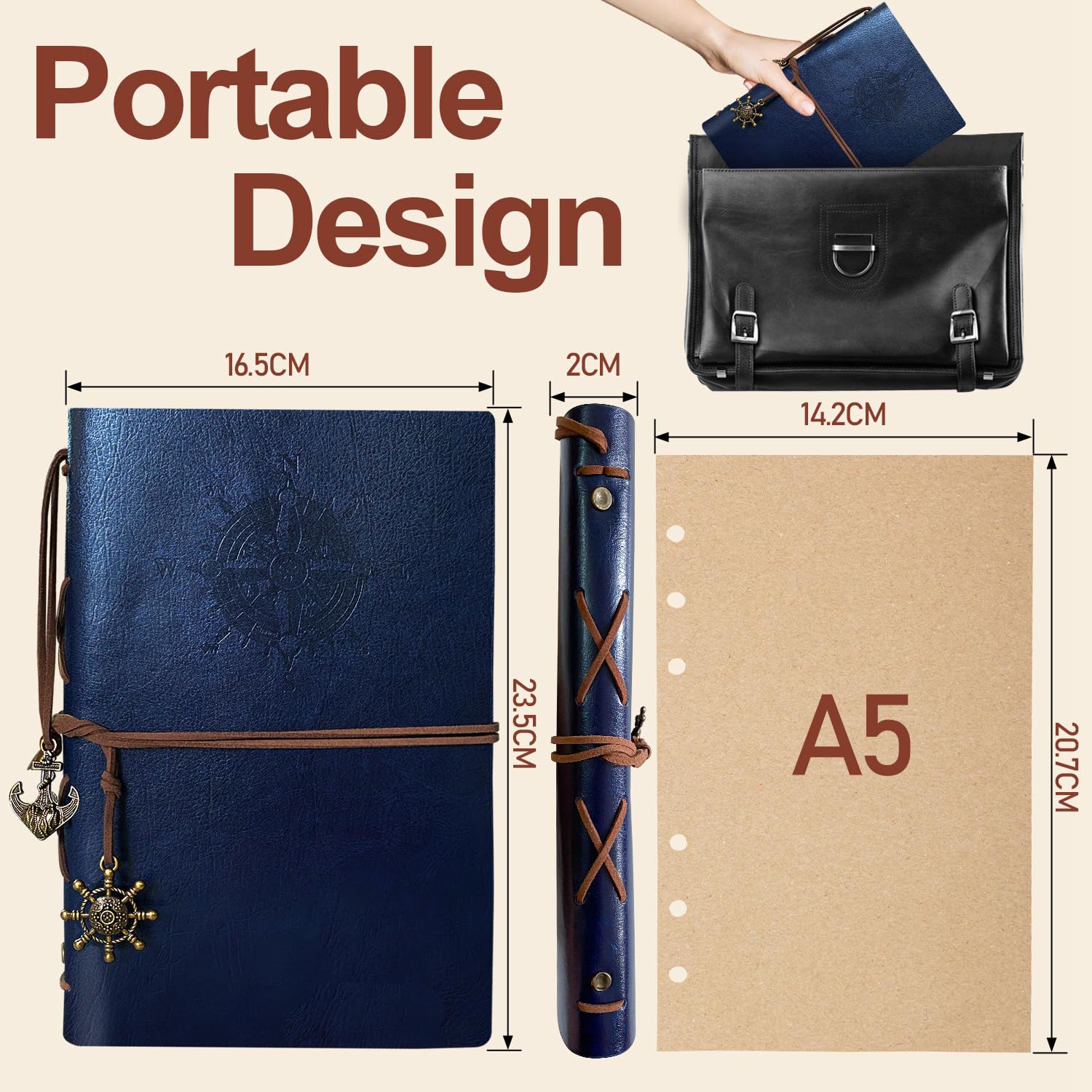Joy & Inspiration PU Leder Notizbuch A5 mit nachfüllbarem Kraftpapier Vintage Nachfüllbar Gebunden Schönes Reisetagebuch Tagebuch Ringbuch Skizzenbuch Vintage Notebook (A5 Dunkelblau)