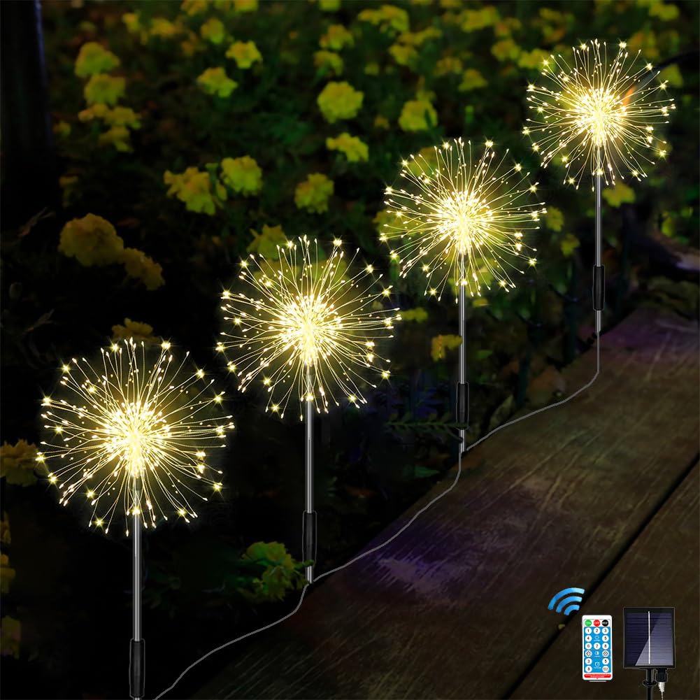 Joysing Gartendeko Solar Gartenleuchte Aussen, 4 x 120 LED Solar Feuerwerk Lichter mit Fernbedienung, 8 Modi Gartenstecker Solar Lichter Wasserdicht Solarlampen für Garten Terrasse Deko Warmweiss