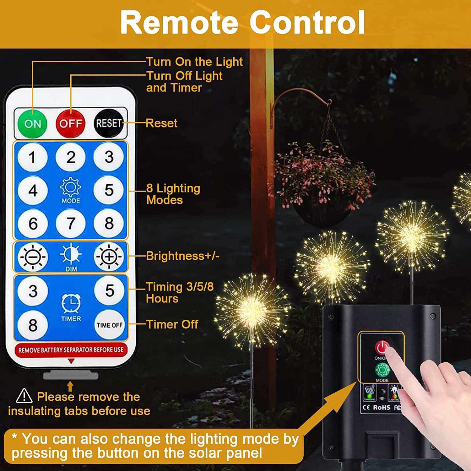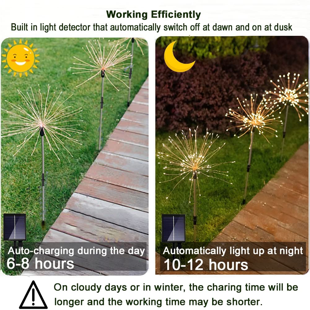 Das Solarpanel wird mit Sonnenenergie betrieben und nimmt tagsüber das Sonnenlicht auf, um die Batterie zu laden. Dann kann das Feuerwerk Licht für 10-12 Stunden in der Nacht arbeiten.Tipps:
