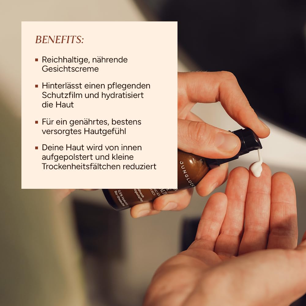 Während herkömmliche Cremes oft auf Wasser basieren, nutzt JUNGLÜCK wertvollen Bio-Aloe Vera Saft als Basis, um die Haut schon beim Auftragen zu beruhigen. Ein hochdosierter Hyaluron-Komplex sorgt zusammen mit Bio-Shea Butter für eine gestärkte Hautbarriere und ein seidig-weiches Hautgefühl – ohne zu beschweren.