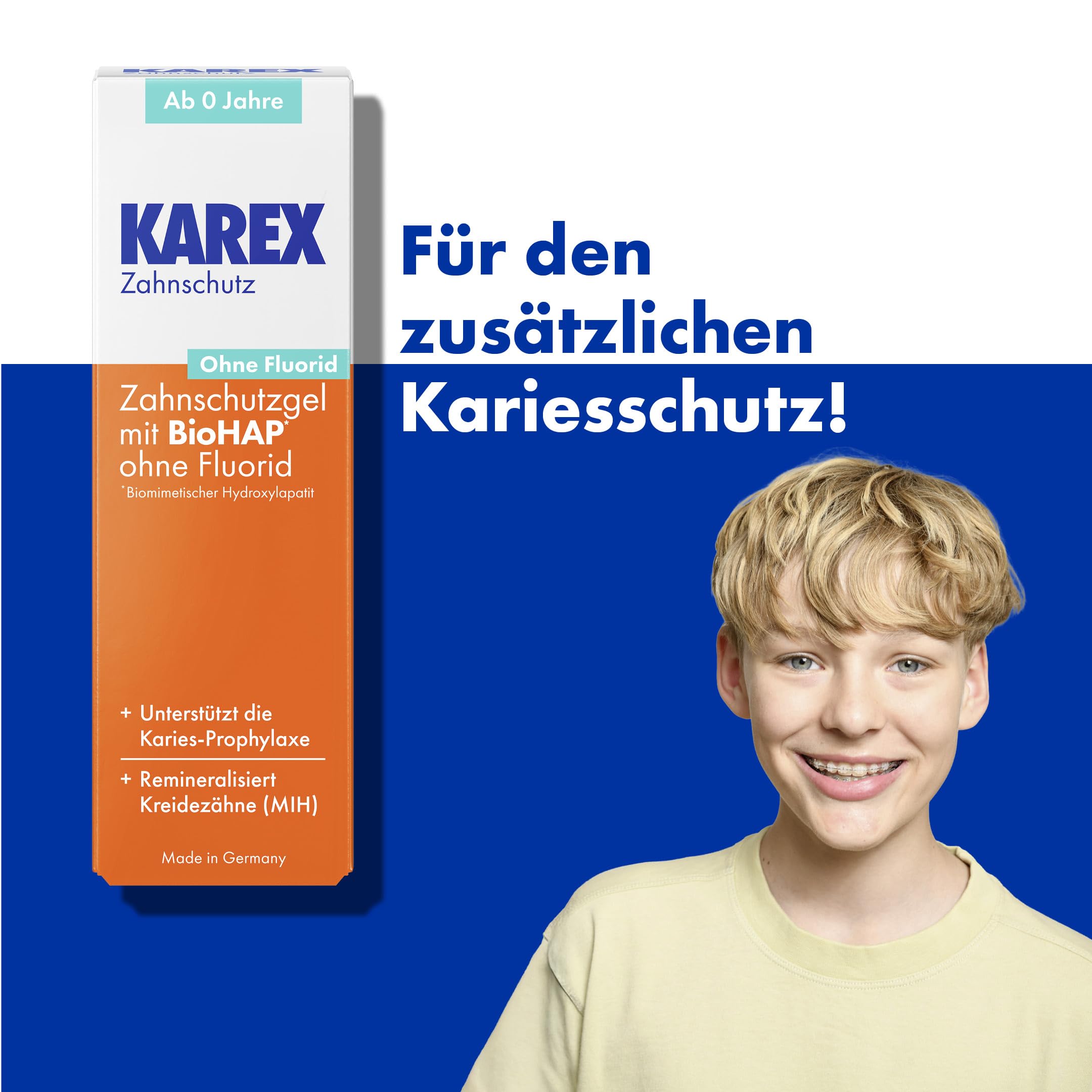 Die Junior Karex Zahnpasta ist auch für Kinder und Jugendliche mit Zahnspangen geeignet. Sie schützt effektiv vor Karies an schwer erreichbaren Stellen rund um Brackets, wo Zahnbelag oft nicht vollständig entfernt werden kann.
