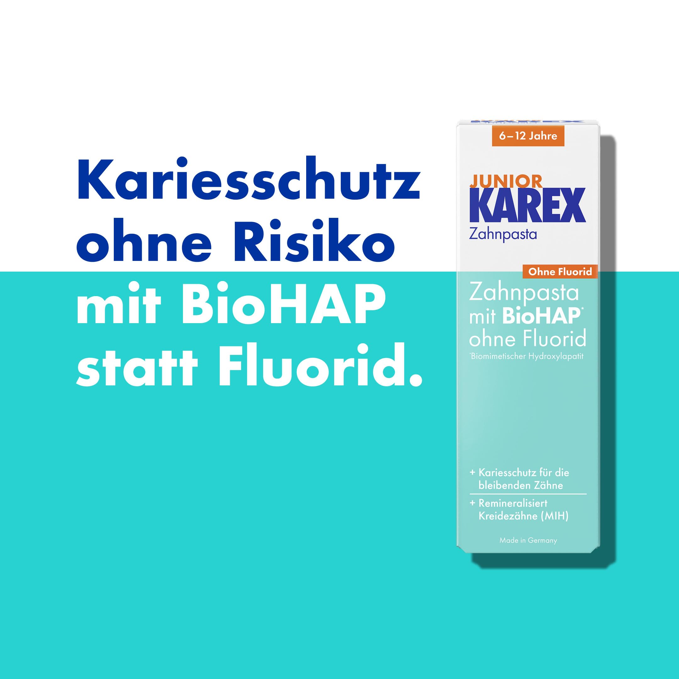 Die Junior Karex Zahnpasta ist massgeschneidert für Kinder ab 6 Jahren, um die besonderen Bedürfnisse des Wechselgebisses zu erfüllen. Sie bietet einen umfassenden Schutz für Milchzähne und die neu durchbrechenden bleibenden Zähne.