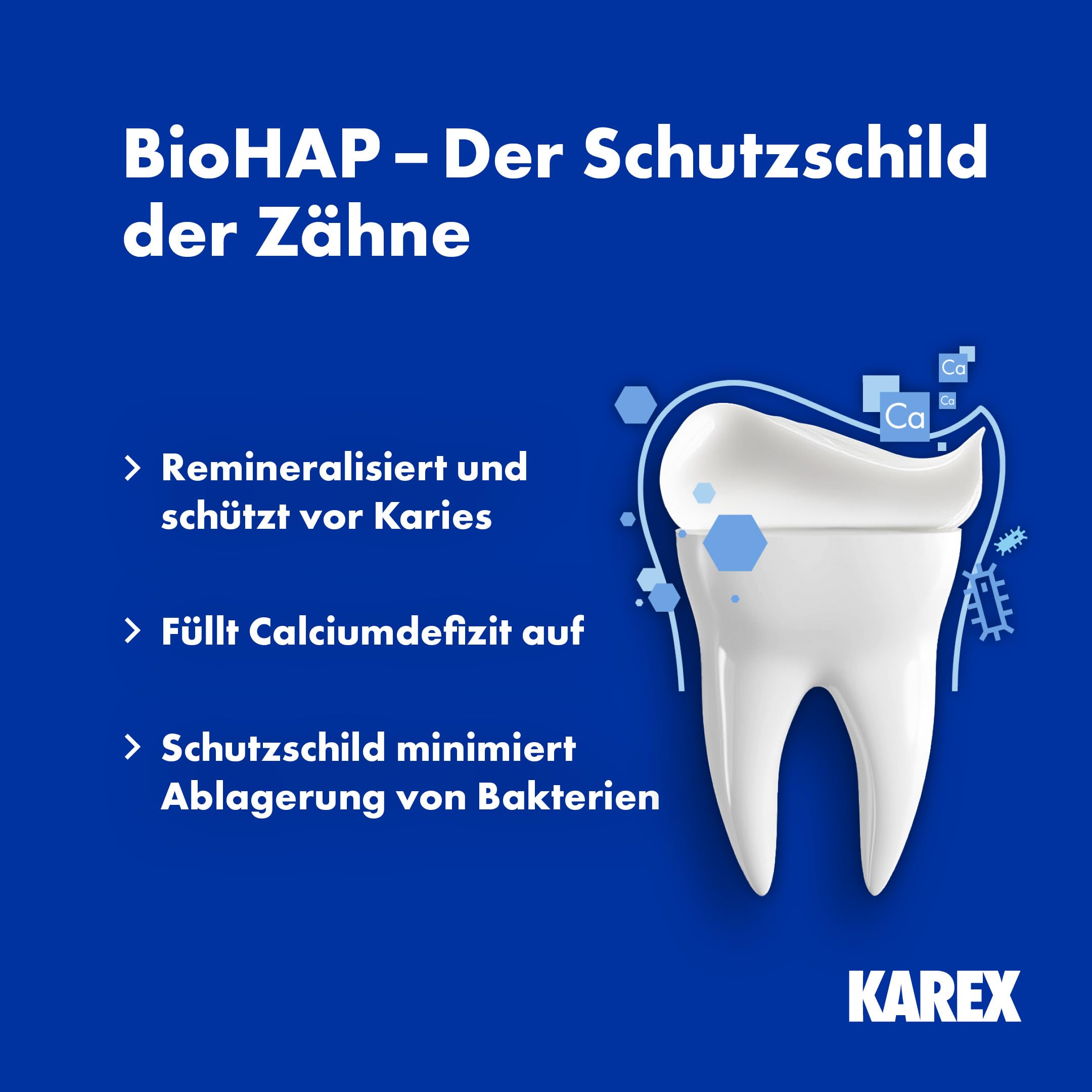 Die tägliche Anwendung hilft, den Zahnschmelz gegen Säureangriffe zu stärken. Bei einem Säureangriff wird Calcium freigesetzt, das den Zahn remineralisiert und vor Karies-Bakterien schützt.