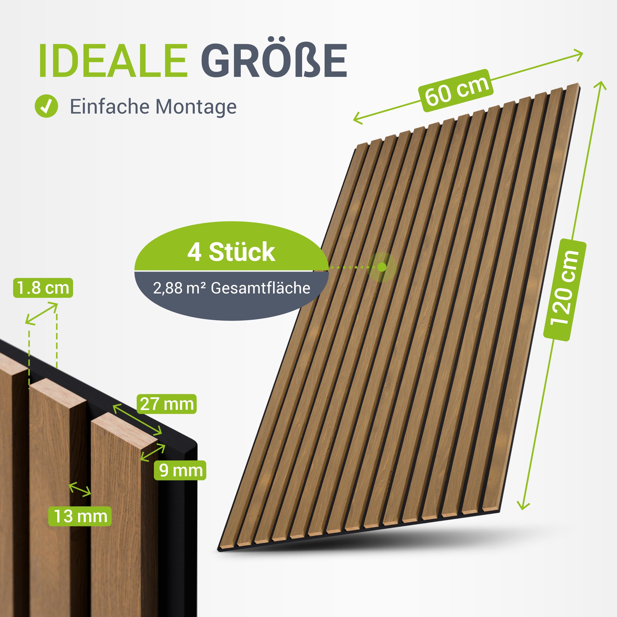 Verleihen Sie Ihren Räumen eine stilvolle und funktionale Note mit unserem Akustikpaneelen im 4er Set (2,88 qm) in dunkler Natur Eiche. Diese hochwertigen Holzpaneele bieten nicht nur ein elegantes Design mit edlem Holzfurnier, sondern auch eine herausragende Schallabsorption gemäss EN ISO 11654. Dank der Akustik-Baumwolle reduzieren sie effektiv Hall und Lärm in Innenräumen und schaffen so eine angenehmere Atmosphäre. Die flammhemmende Eigenschaft nach EN 13501-1 sorgt zudem für zusätzliche Sicherheit. Perfekt als Wandverkleidung, um sowohl Ästhetik als auch Akustik zu optimieren!Produktmerkmale: