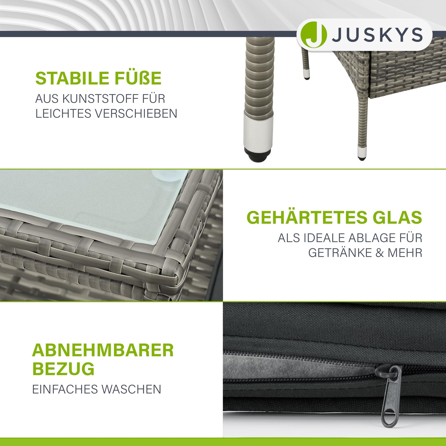 - Material Balkonmöbel : Polyrattan, Stahl, Glas, Schaumstoff, Polyester