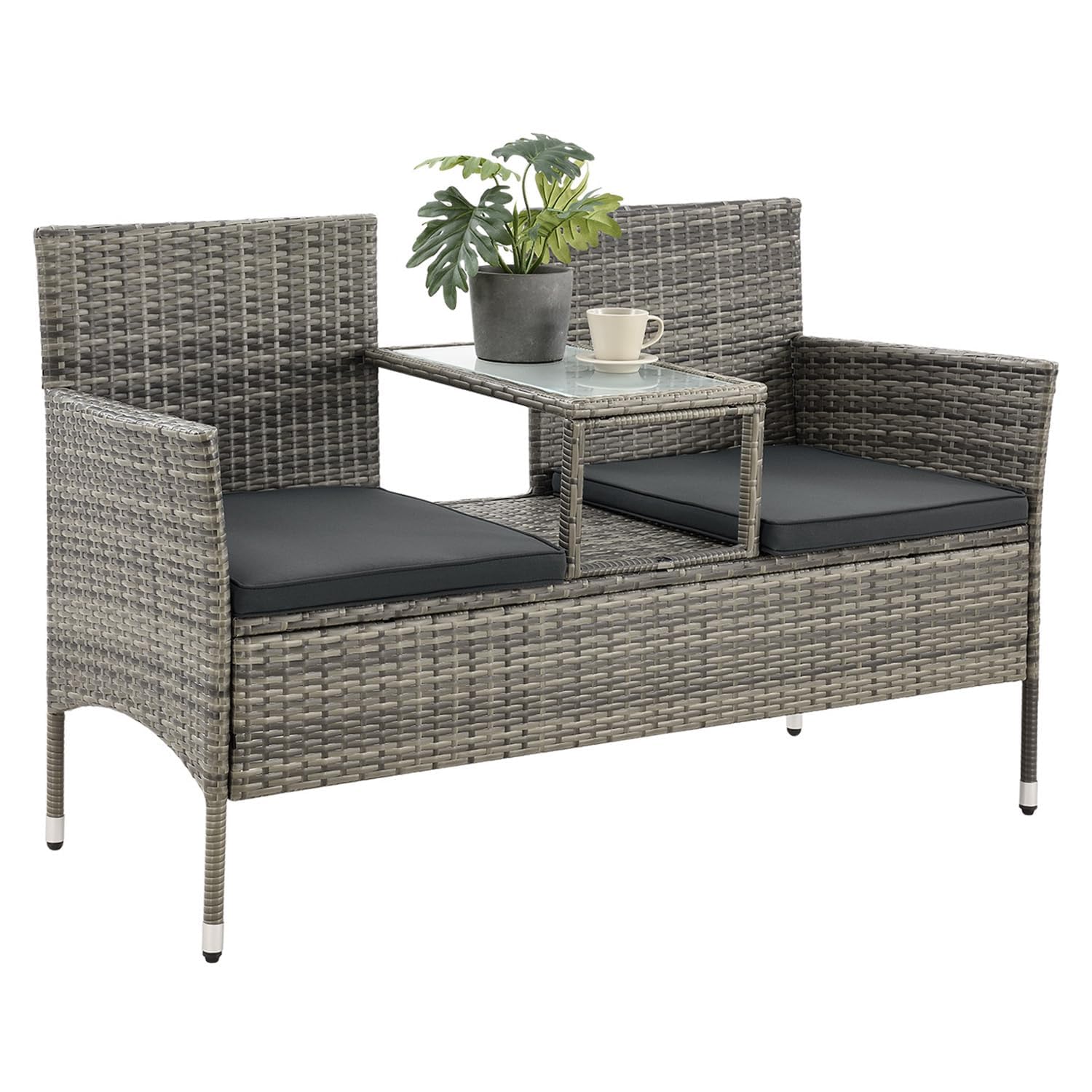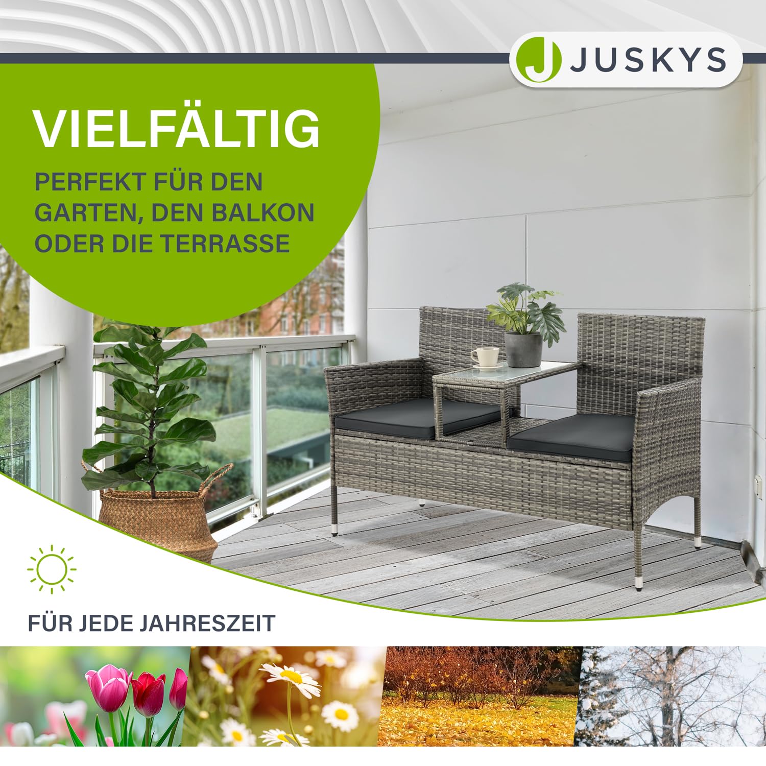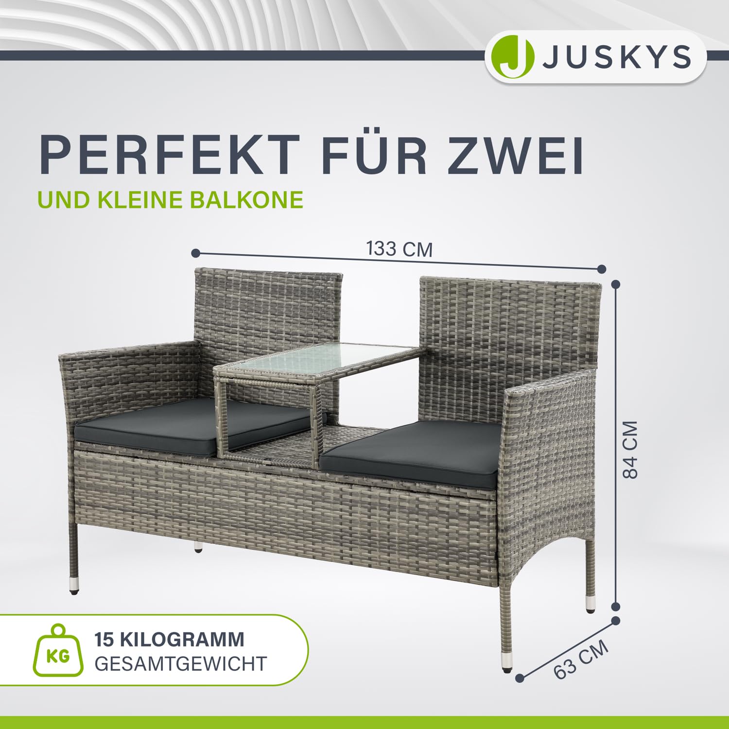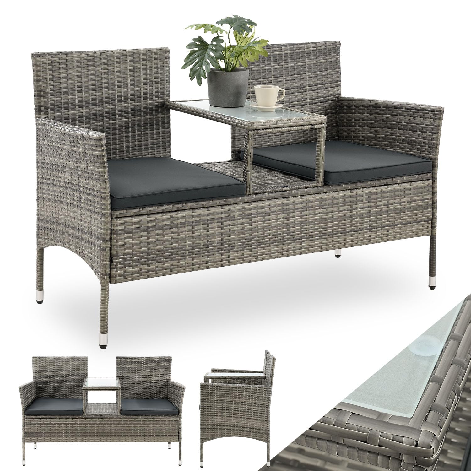 2er-Sitzbank mit Tisch aus Polyrattan mit Polsterauflagen Die 133 × 63 × 84 cm grosse Gartenbank Monaco aus Polyrattan mit integriertem Abstelltisch aus Sicherheitsglas eignet sich perfekt für den Einsatz in Garten, Balkon, Terrasse, Wintergarten oder Lounge. Die stabile Sitzbank bietet 2 Personen ausreichend Platz und dennoch sind die Terrassenmöbel platzsparend. Die kleine Garnitur bietet dank grau-melierter Rattan-Optik und grauen 5 cm dicken Sitzkissen mit Polyester-Bezug eine zeitlose Optik, sowie ein äusserst bequemes Sitzvergnügen. Die Sitzbezüge der Schaumstoff-Auflagen können Sie dank Reissverschluss einfach abziehen und bei 30 Grad per Hand waschen. Dank wetterfestem und UV-beständigem Polyrattan ist die Bank leicht zu pflegen. Diese Balkonmöbel werden Ihnen noch lange Freude bereiten. Produktmerkmale Gartenbank: