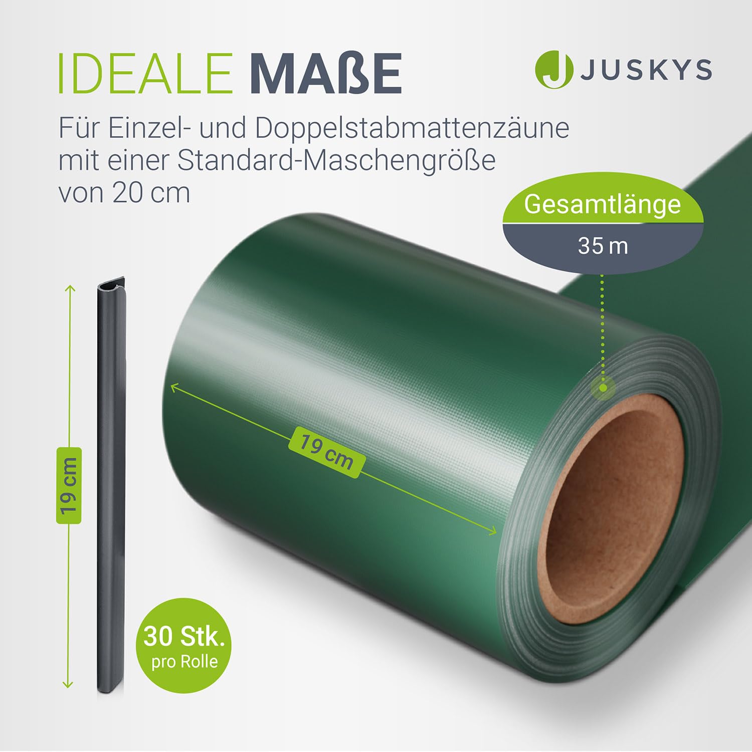 Juskys PVC Sichtschutzstreifen Doppelstabmatten Zaun - 35m x 19 cm - 30 Befestigungsclips - grün - Zaunfolie Sichtschutz Windschutz Garten Gartenzaun