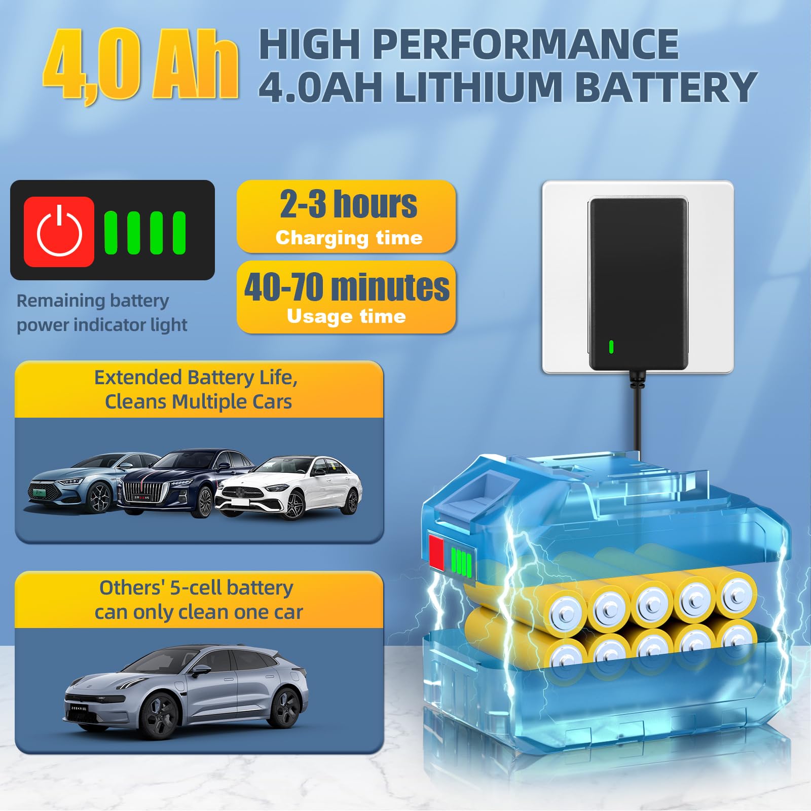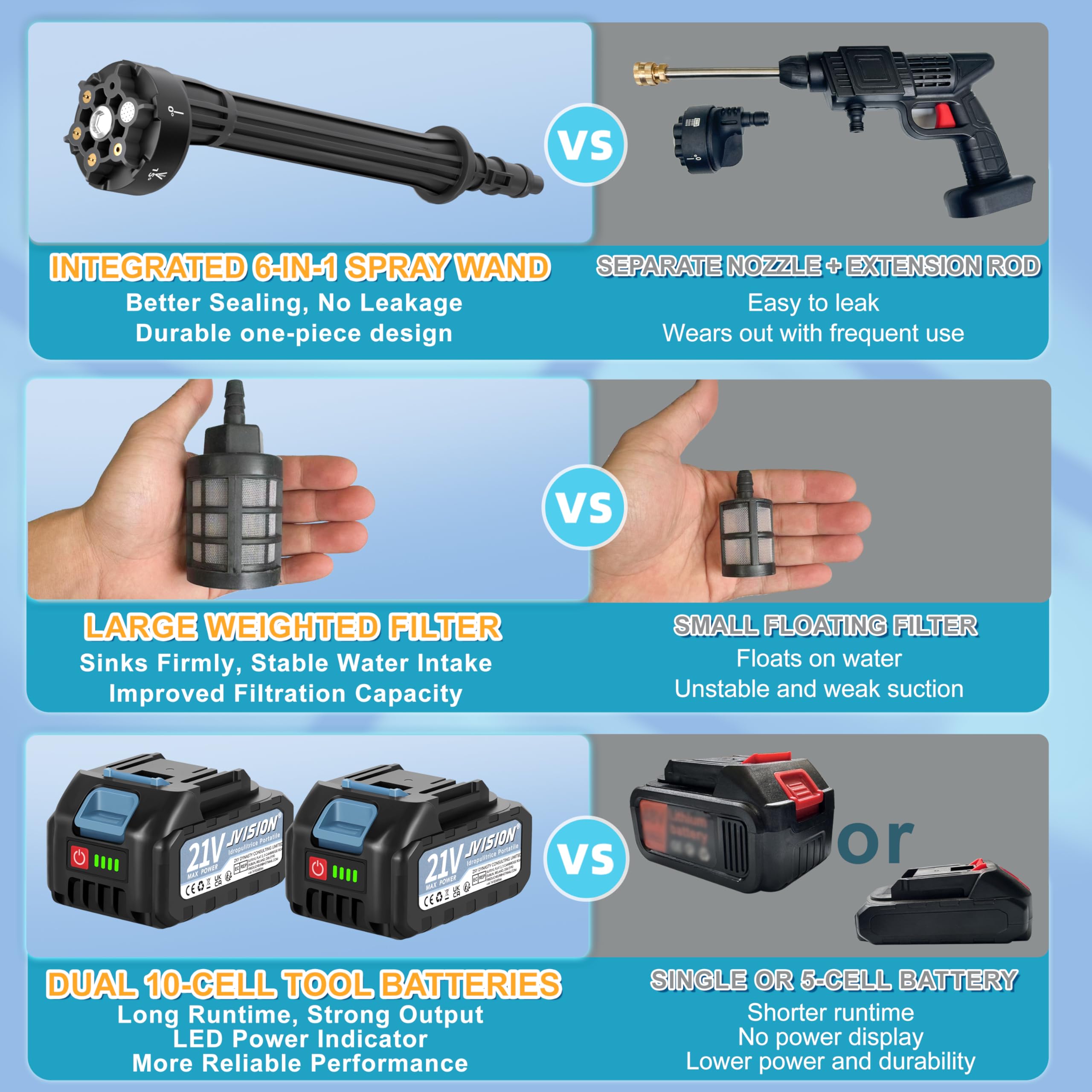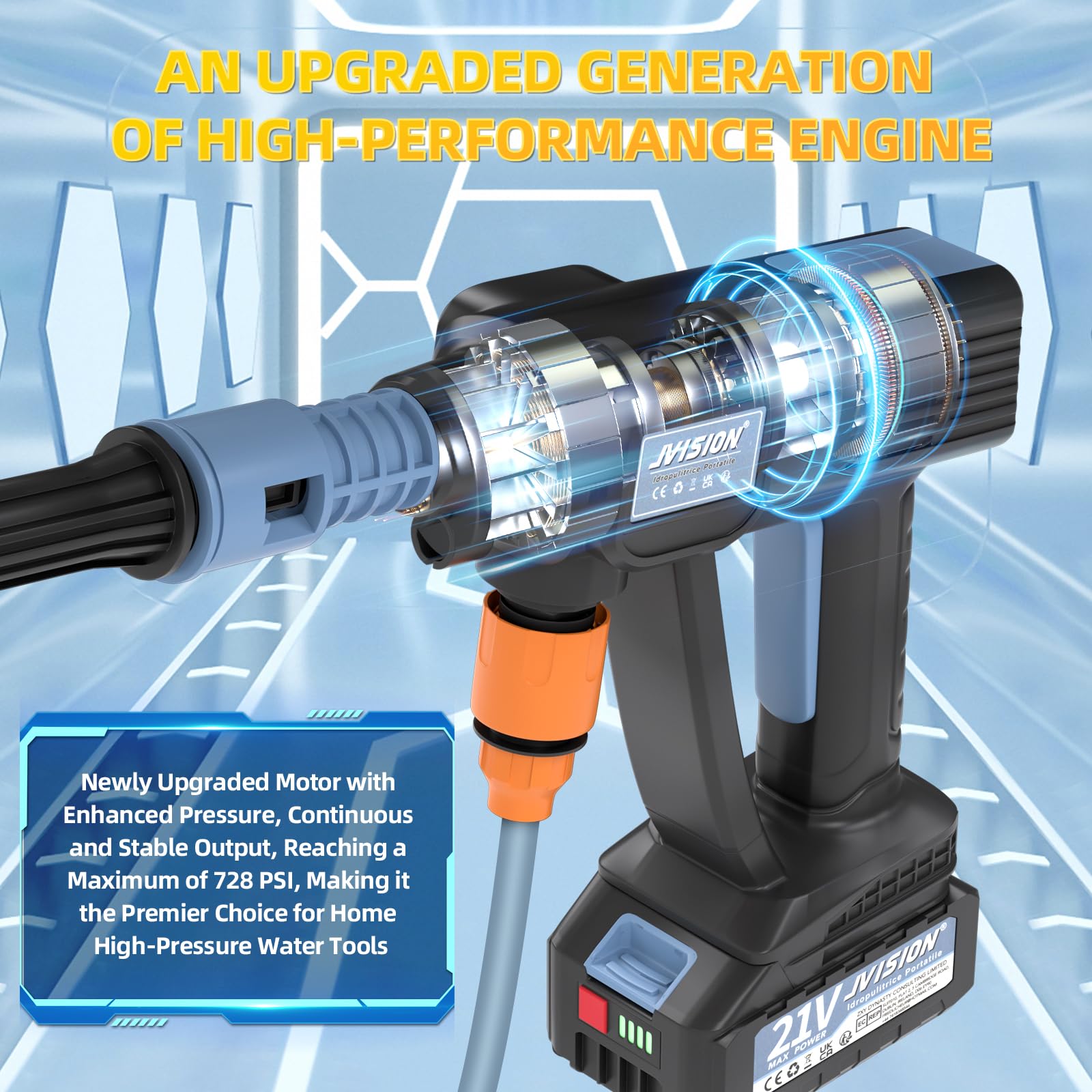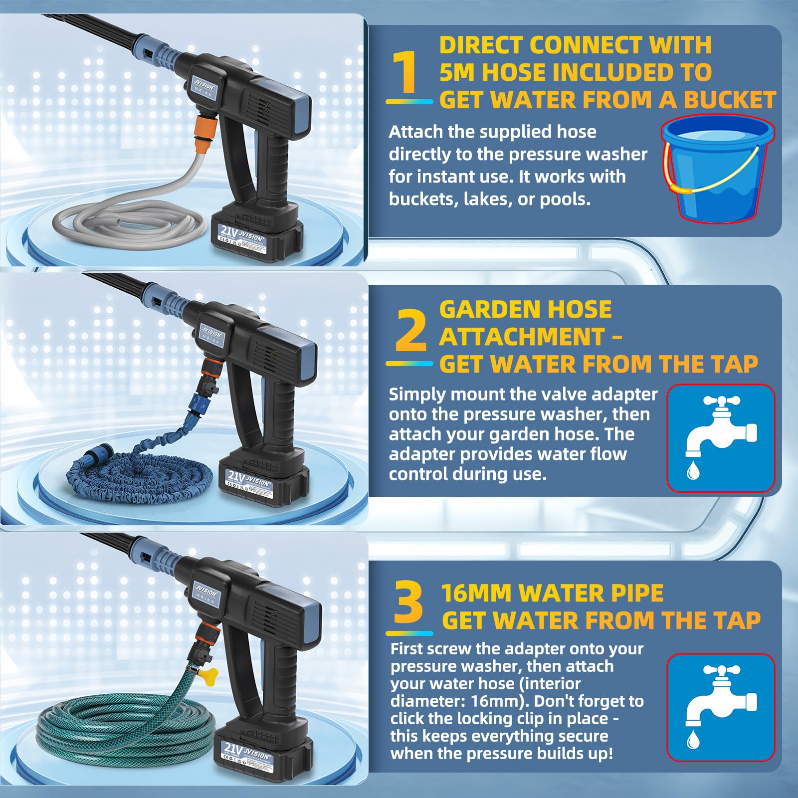 JVISION Akku Hochdruckreiniger Mobiler mit Wasserhahnanschluss & 2X 4000mAh Akku, Kabelloser Pressure Wascher mit 6-in-1 Düse für Auto, Terrasse, Hausreinigung