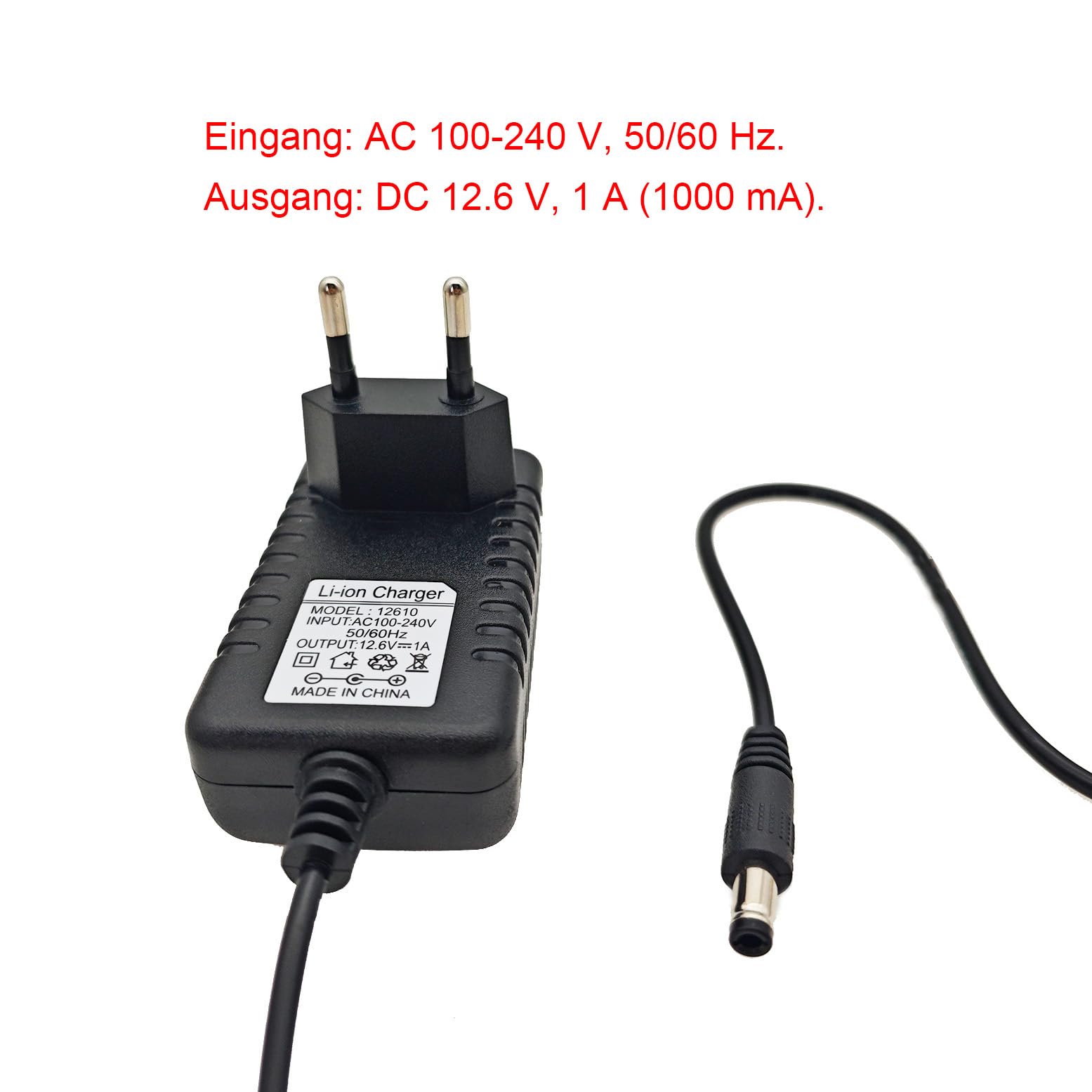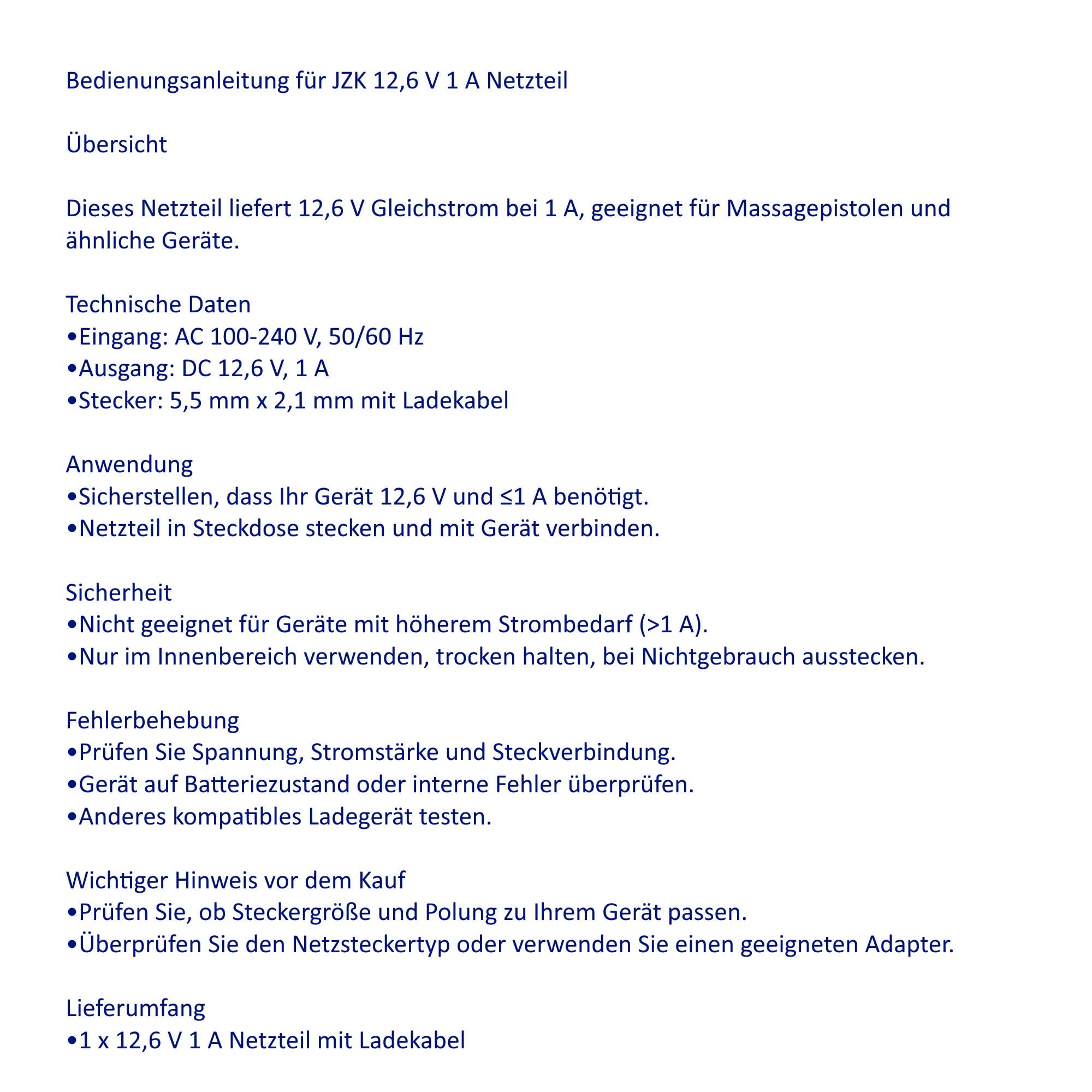 JZK 12.6 V 1 A Netzteil für Massagepistole, 12.6 V Massagepistole Ladegerät-Adapter Ersatz, 12.6 Volt 1 Ampere AC zu DC Konverter Netzteil Ladegerät mit Ladekabel