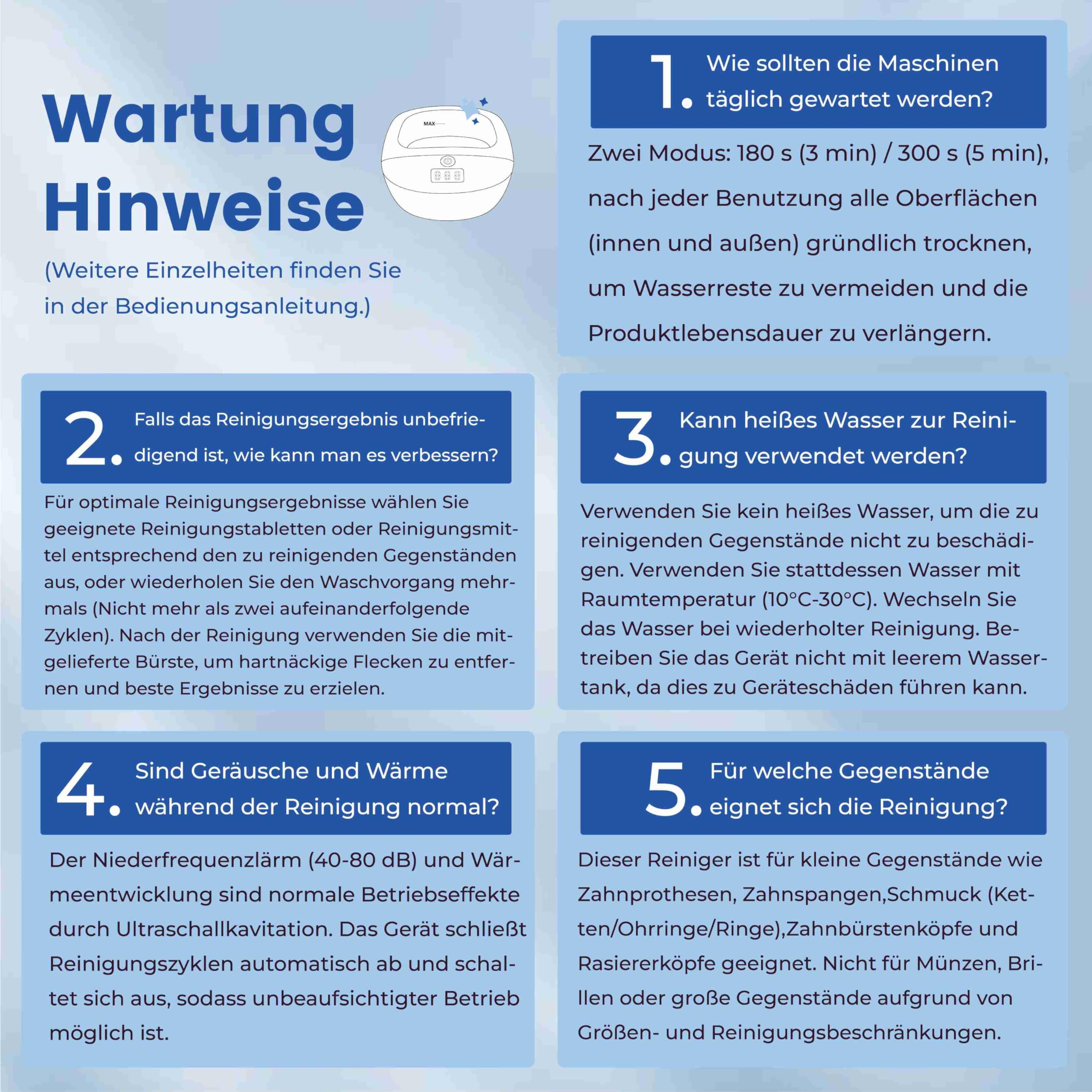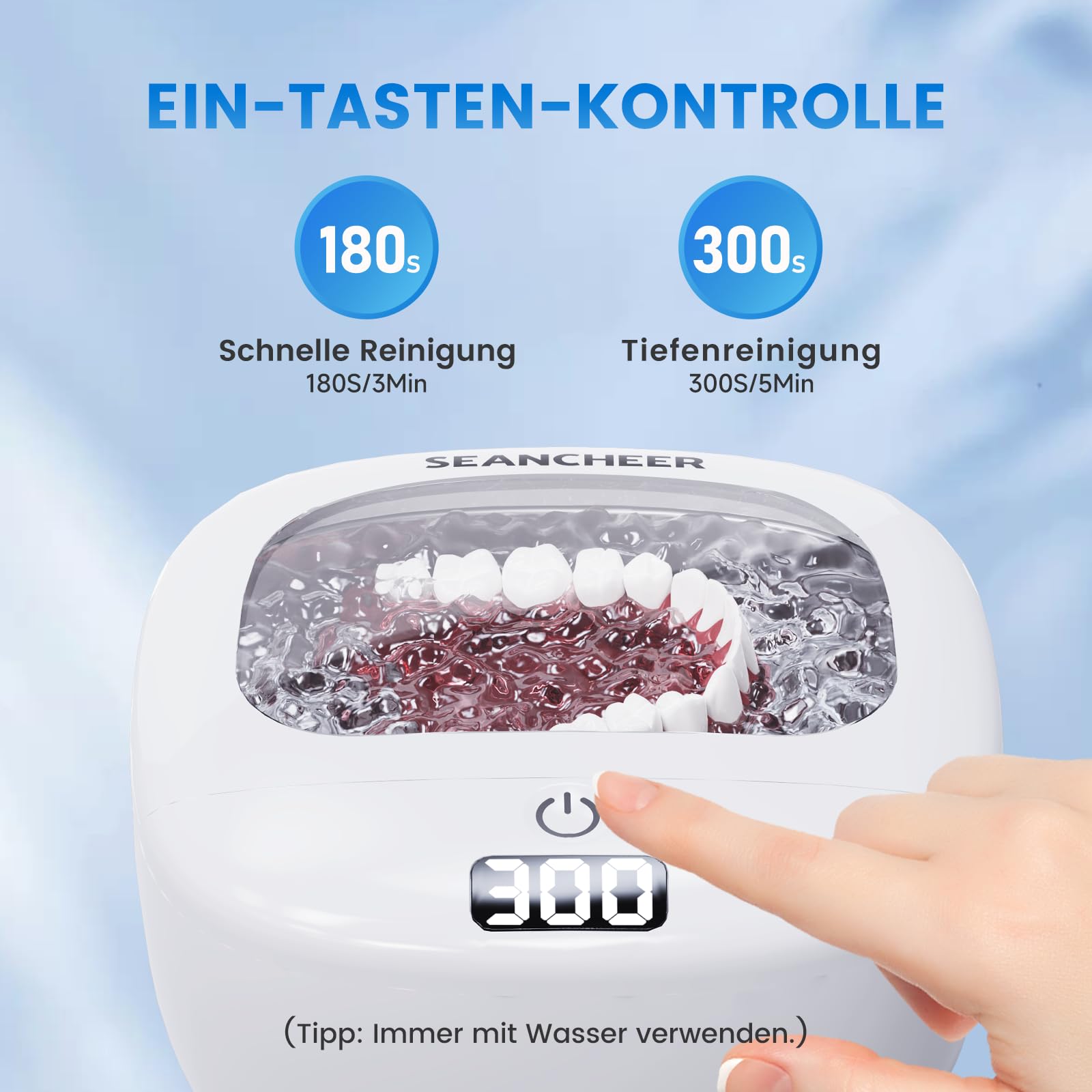 Die moderne Ultraschalltechnologie erzeugt hochfrequente Mikrovibrationen, die Plaque, Ablagerungen, Speisereste und Rueckstaende zuverlaessig loesen, ohne empfindliche Oberflaechen zu beschaedigen. Dadurch eignet sich der Ultrasonic Cleaner ideal fuer Dentalprodukte, die taeglich im Mund verwendet werden, sowie fuer filigrane Schmuckstuecke.