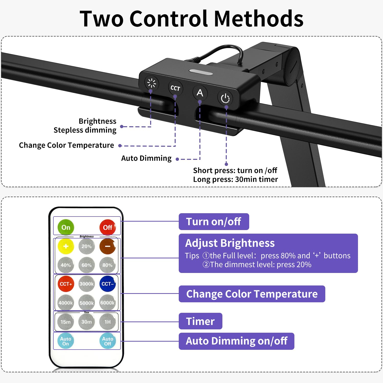 - ????【Platzsparende Metallklammer & Timer Funktion】Mit stabiler Metallklemme, Die Schreibtischlampe tageslicht für das Heimbüro benötigt nur wenig Platz, um auf den Schreibtisch geklemmt zu werden, und unterstützt eine maximale Schreibtischbreite von 5.5 cm. Drücken Sie lange auf die Einschalttaste, bis die Lampe einmal blinkt, um die 30-minütige automatische Abschaltfunktion zu aktivieren, oder Sie können die Timerfunktion 15min / 30min / 1 Stunde auf der Fernbedienung wählen.