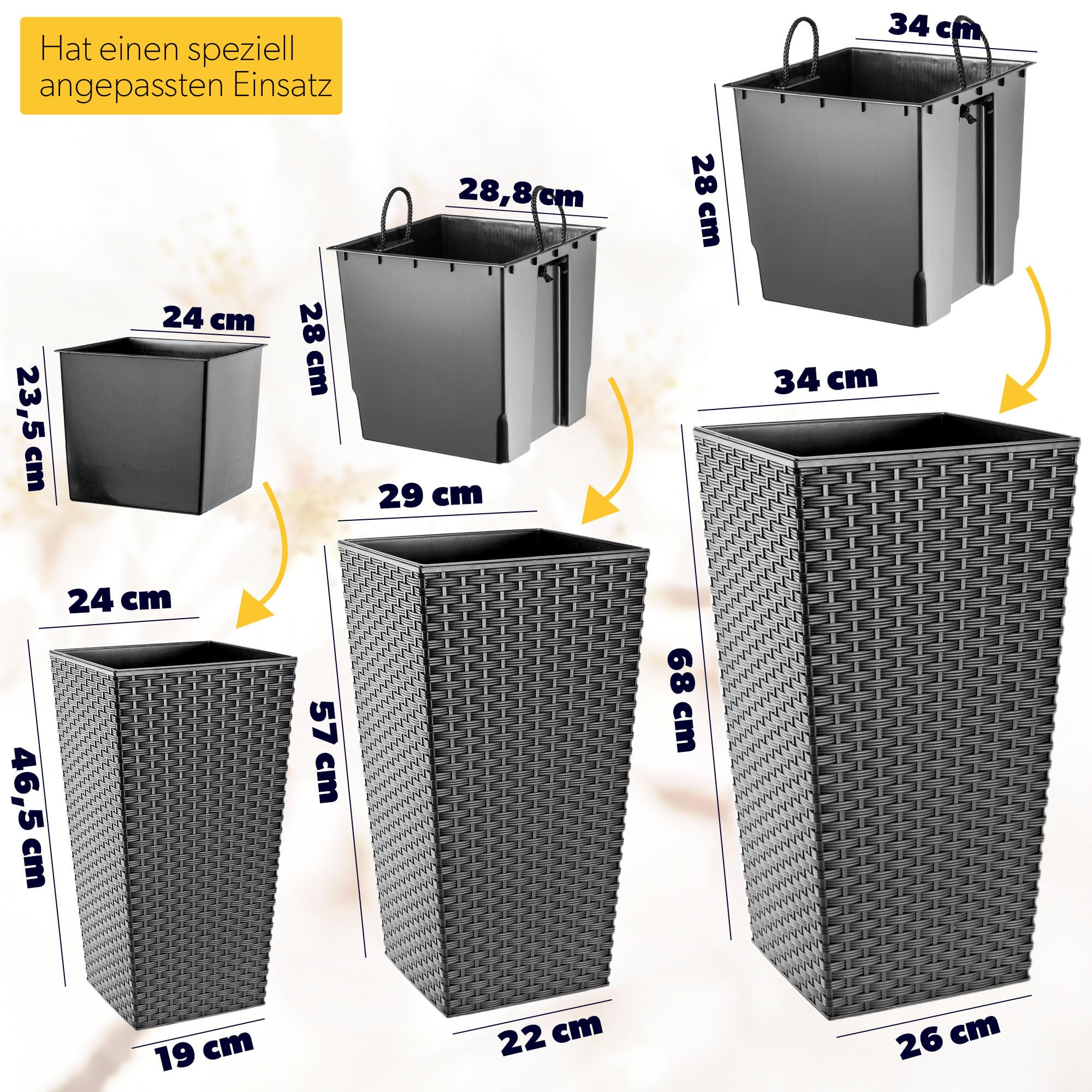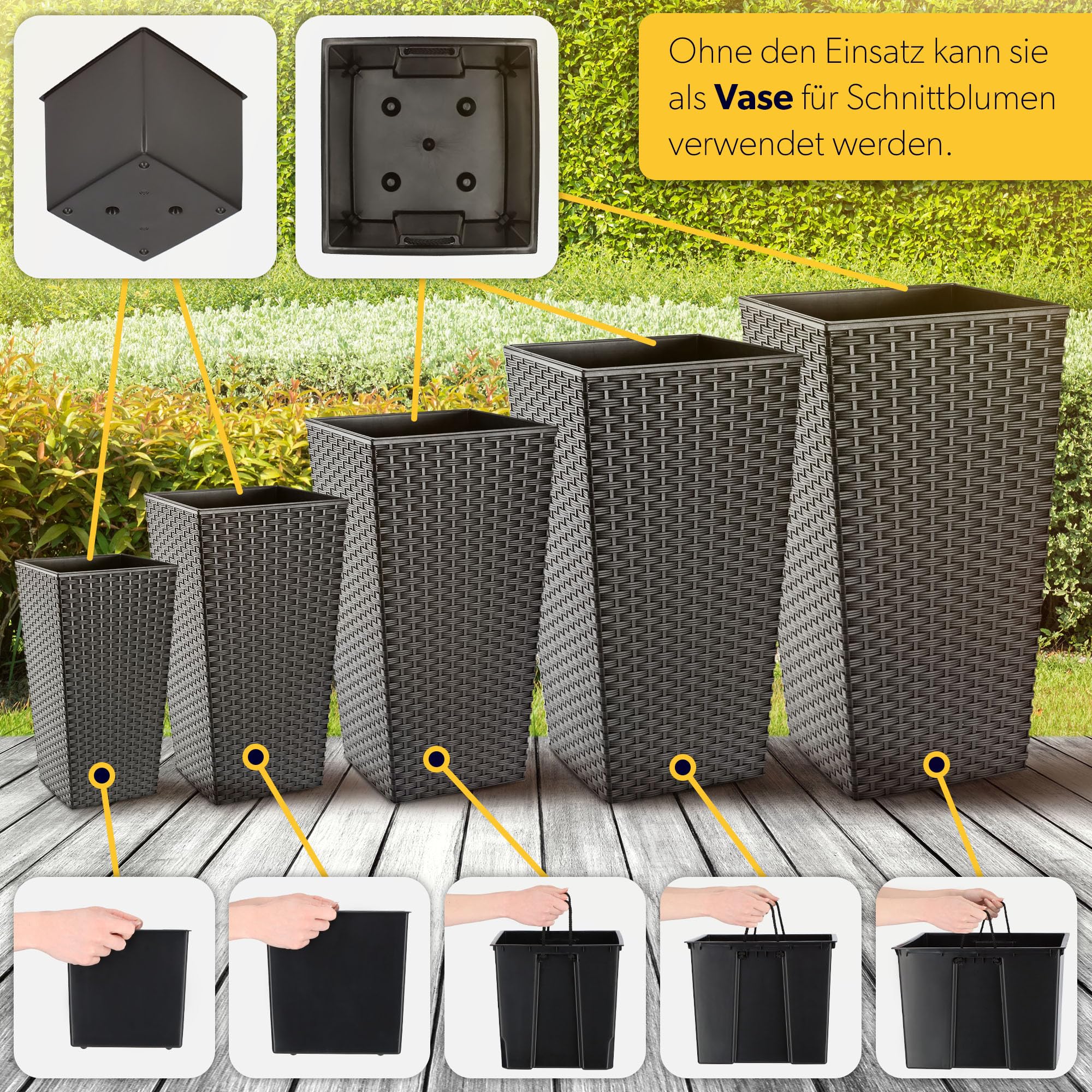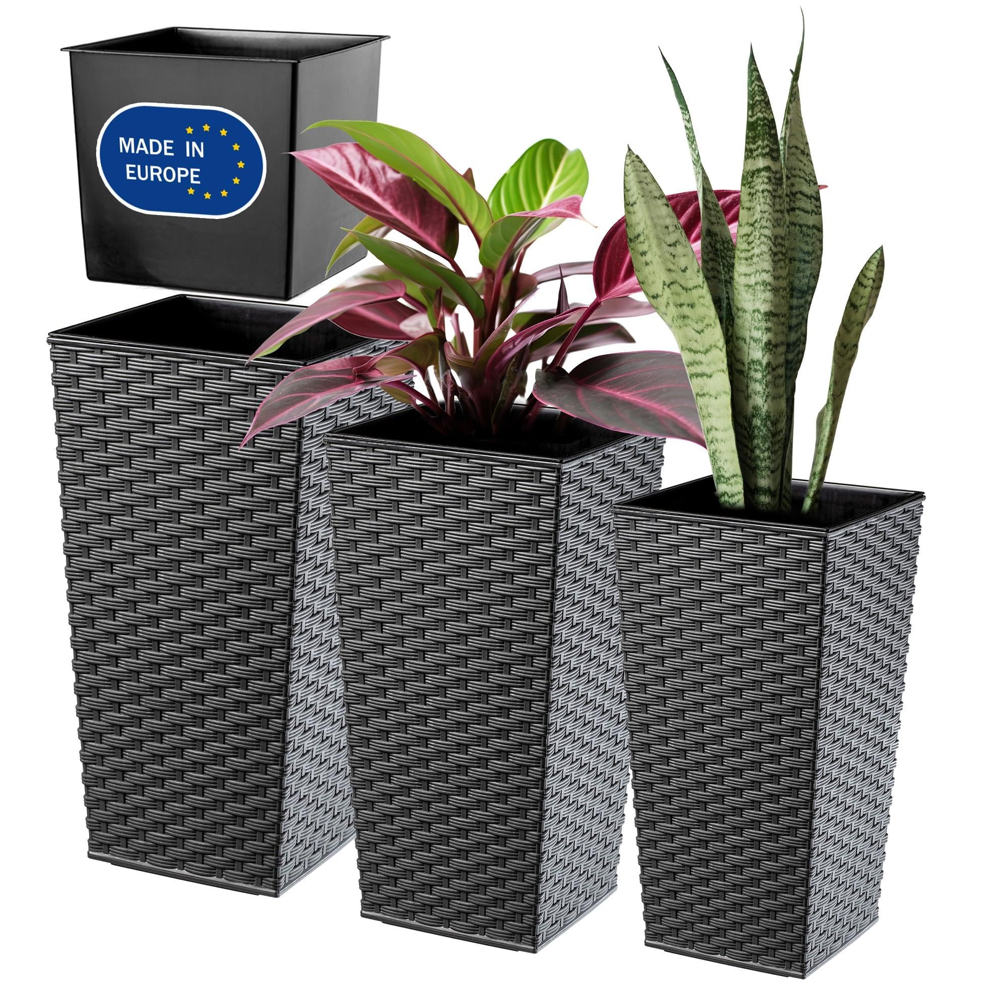 KADAX 3er Set Pflanzkübel mit Innentopf 46,5/57,5/68 cm Höhe, Grafit Rattan – wetterfeste & robuste Blumenkübel aus Kunststoff, Blumentöpfe für Innen- & Aussenbereich