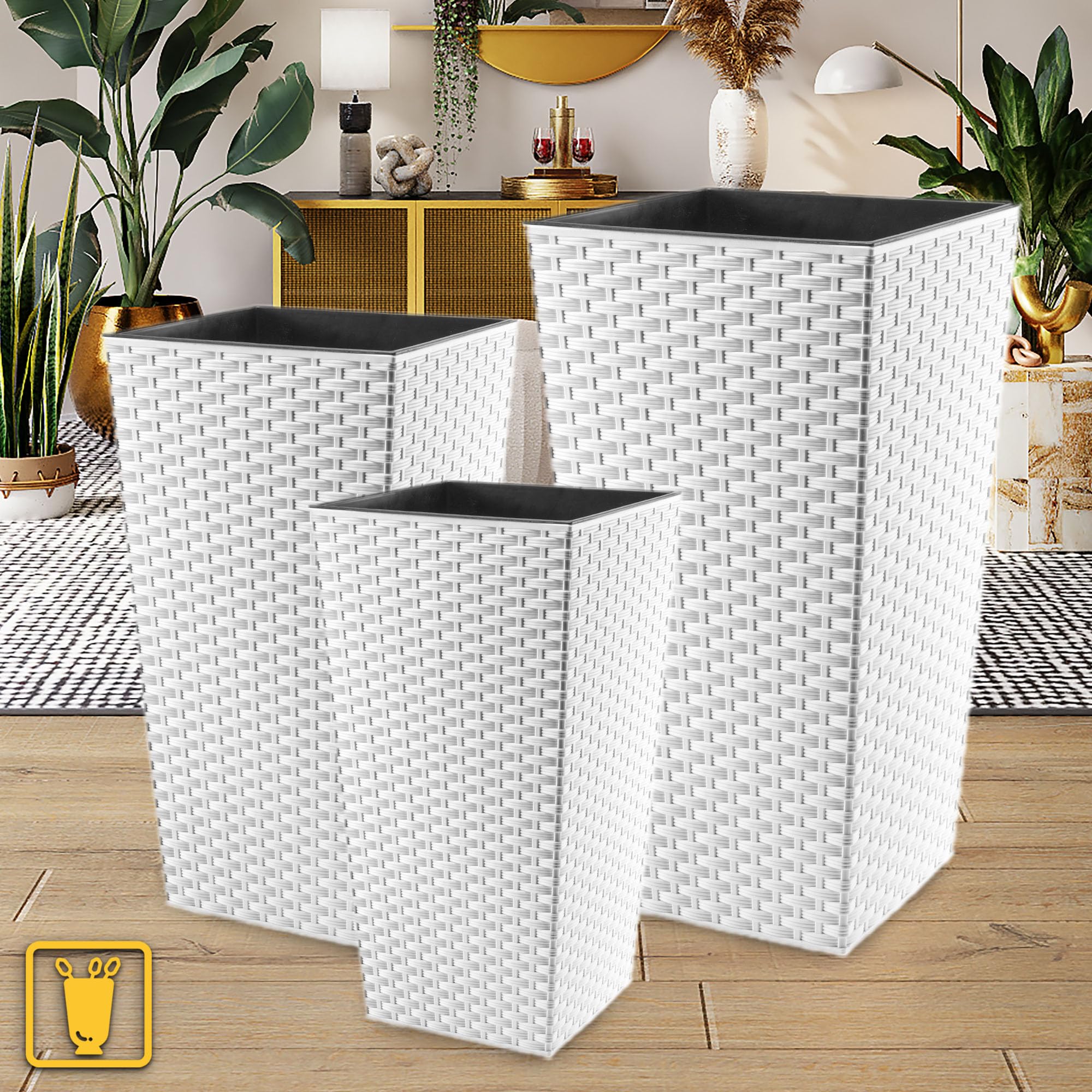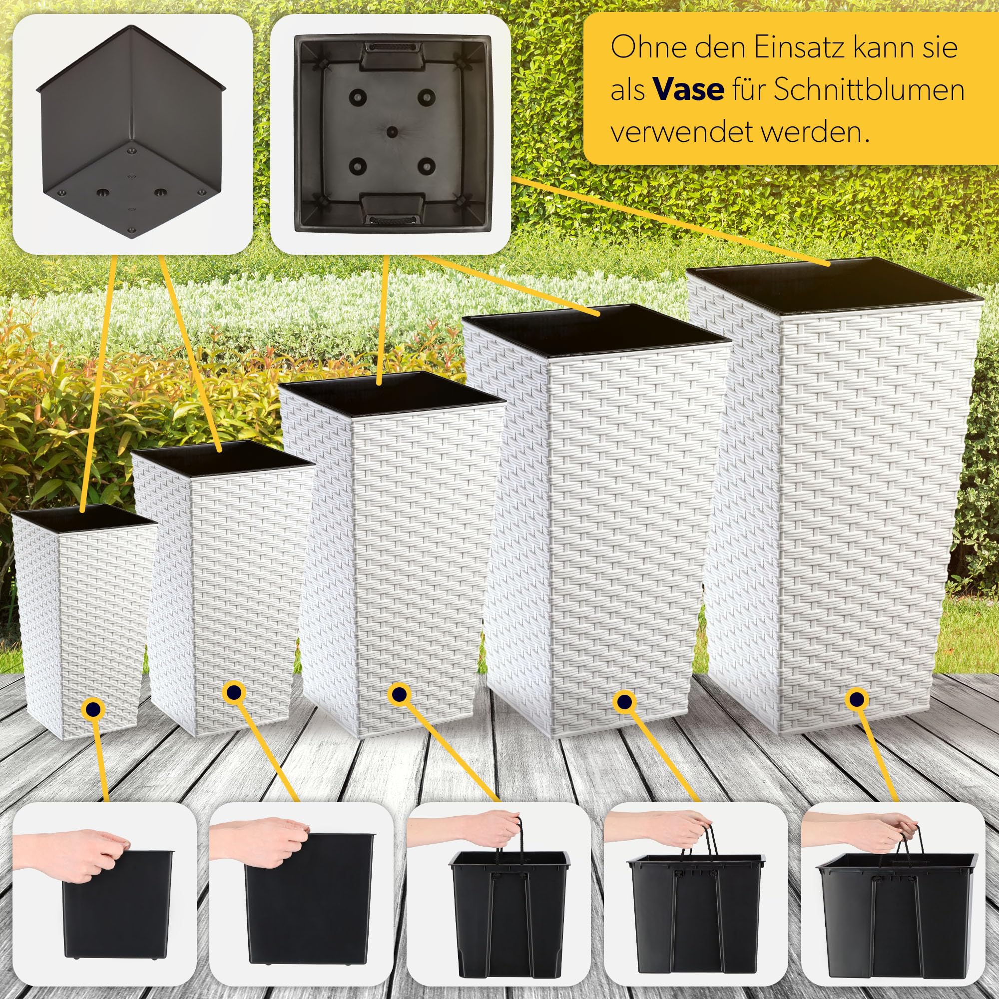 KADAX 3er Set Pflanzkübel mit Innentopf 46,5/57,5/68 cm Höhe, Weiss Rattan – wetterfeste & robuste Blumenkübel aus Kunststoff, Blumentöpfe für Innen- & Aussenbereich