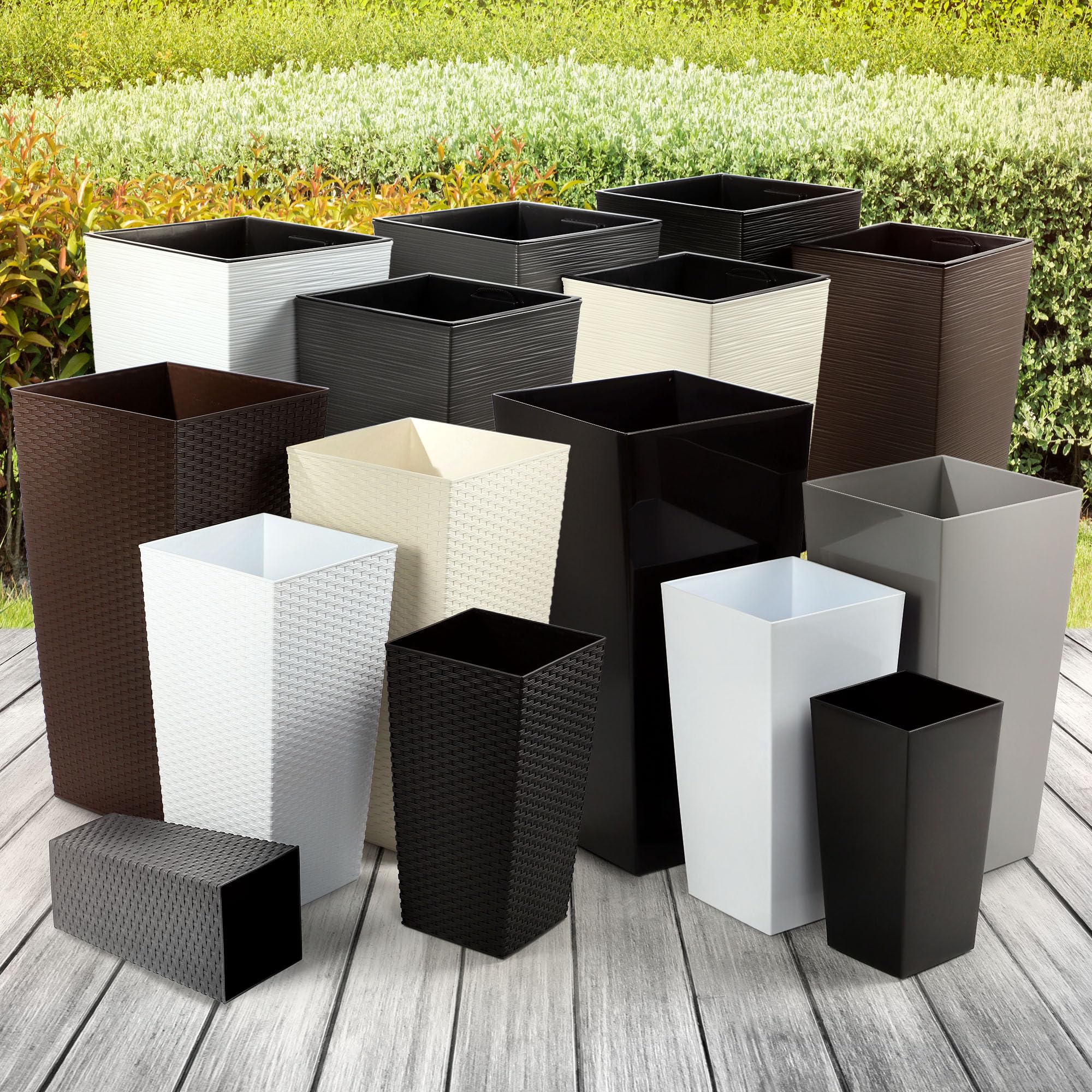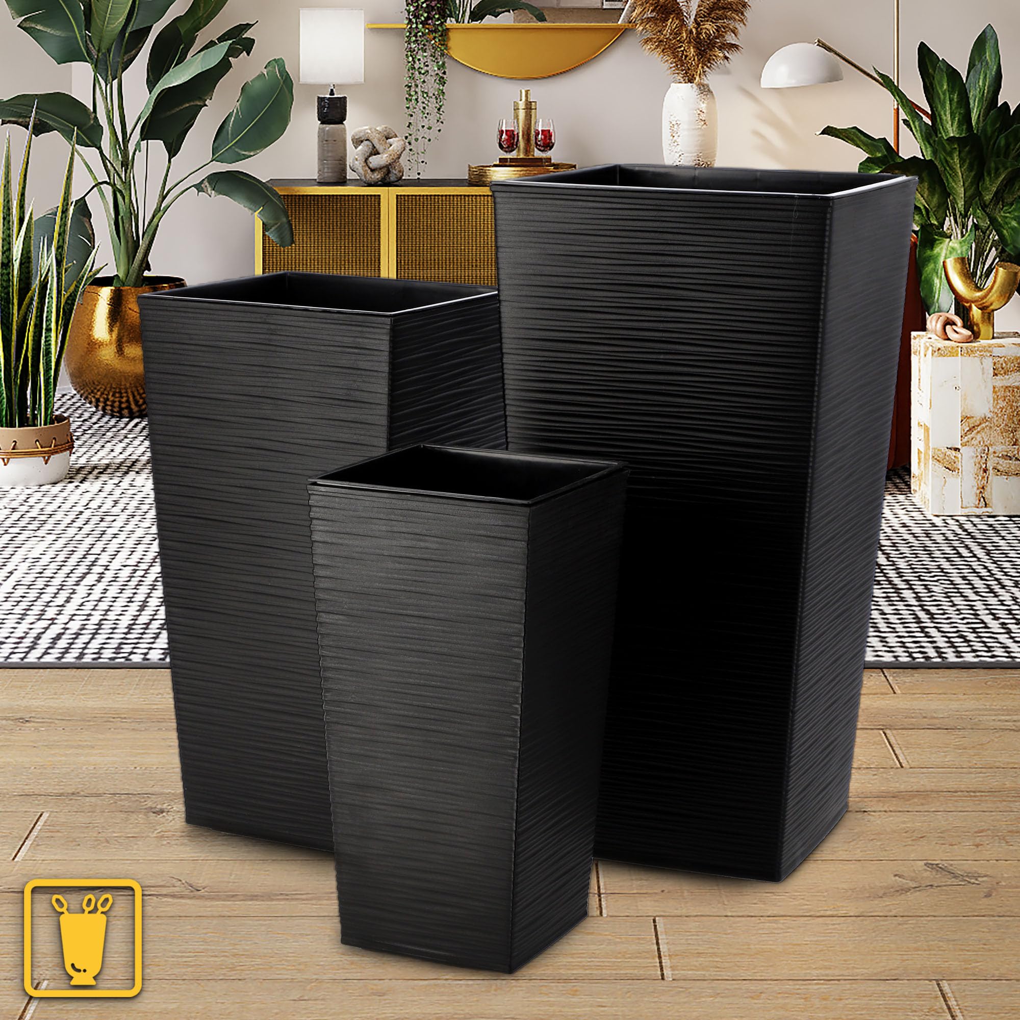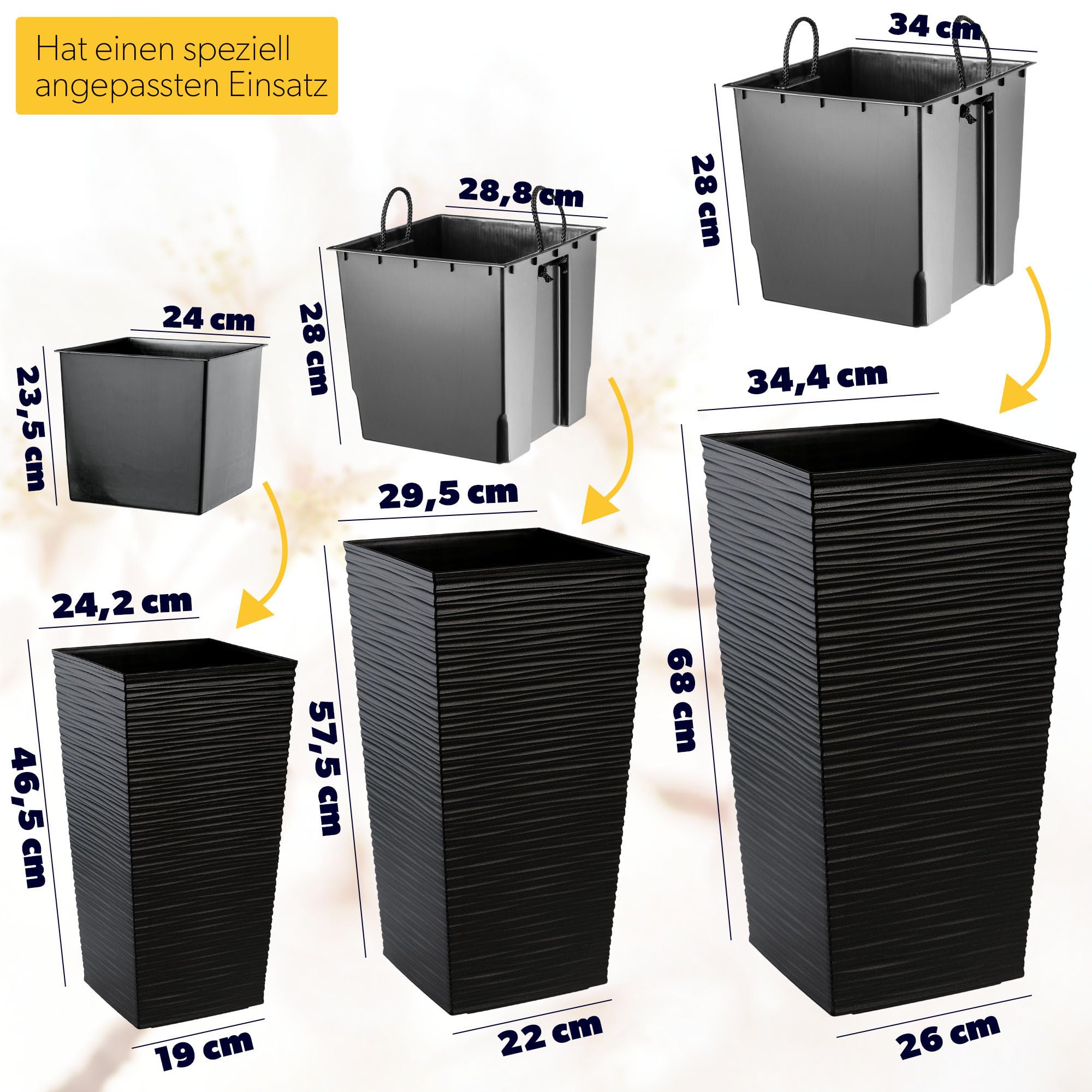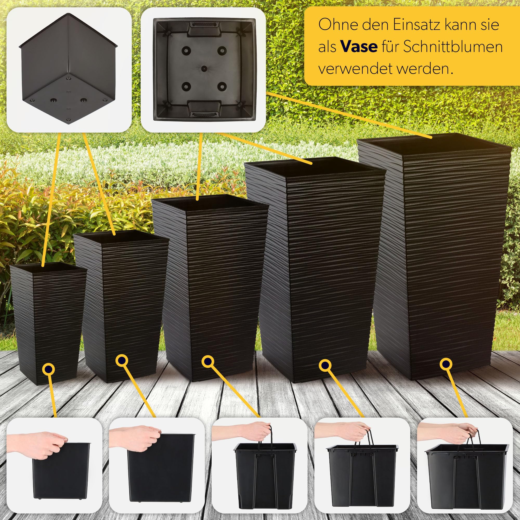 KADAX 3er Set Pflanzkübel mit Innentopf 46,5/57,5/68 cm Höhe, Schwarz – wetterfeste & robuste Blumenkübel aus Kunststoff, Blumentöpfe für Innen- & Aussenbereich