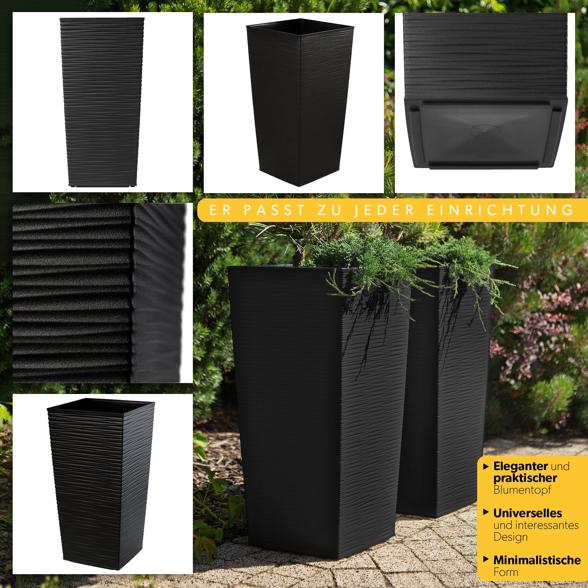Der elegante und praktische Blumentopf der Marke KADAX, der sich ausgezeichnet im jedem Garten bewährt. Er zeichnet sich durch Vielseitigkeit und interessantes Desing aus, die dem Artikel moderne und künstlerische Elemente verleihen. Man kann ihn sowohl im Garten, auf der Terrasse und auf dem Balkon als auch zu Hause platzieren. Er sieht auch nur mit einer Pflanze toll aus und bringt verschiedene Blumen, nicht nur grüne, sondern auch geschnittene und künstliche gut zur Geltung. Den Blumentopf kann man leicht putzen, was beim Erde umschütten und Blumen umpflanzen nicht ohne Bedeutung ist. Durch sein interessantes Design fällt er sowohl beim Grillen als auch auf einer Familienfeier auf. Ausserdem ist er stabil gefertigt, was beim Aufräumen des Gartens oder neuer Pflanzung die Sicherheit garantiert. Den Topf kann man problemlos im Winter draussen lassen, weil er frostresistent ist. Besonders auffallend ist das geschmackvolle und ausgefallene Design, welches das Produkt wie aus Keramik wirken lässt. Der Topf hat eine minimalistische Form, die seine Nützlichkeit betont. Der Artikel ist leicht und unzerbrechlich; man kann ihn einfach tragen, hinstellen, die Erde rein- und ausschütten, ohne Befürchtungen, dass der Topf beschädigt wird. Das ist ein unerlässliches Produkt bei Ihrem Gartenprojekt und eine grosse Erleichterung bei der Arbeit mit Lieblingspflanzen. Er passt zu jeder Einrichtung: klassisch, modern, skandinavisch und maritim. Das Blumengefäss verfügt über eine speziell angepasste schwarze Einlage, die dem Produkt hohe Funktionalität verleiht. Die Einlage schützt den Topf und ausserdem ist sie so gross, dass sie ohne Probleme Platz für eine Pflanze oder eine andere Blume hat. Zwischen dem Topf und dem Schutz befindet sich Raum, der vor Übergiessen schützt und gleichzeitig für die richtige Feuchtigkeit der Wurzeln sorgt. Die Einlage kann man nach dem Herausnehmen als Blumenvase für Schnittblumen benutzen.
