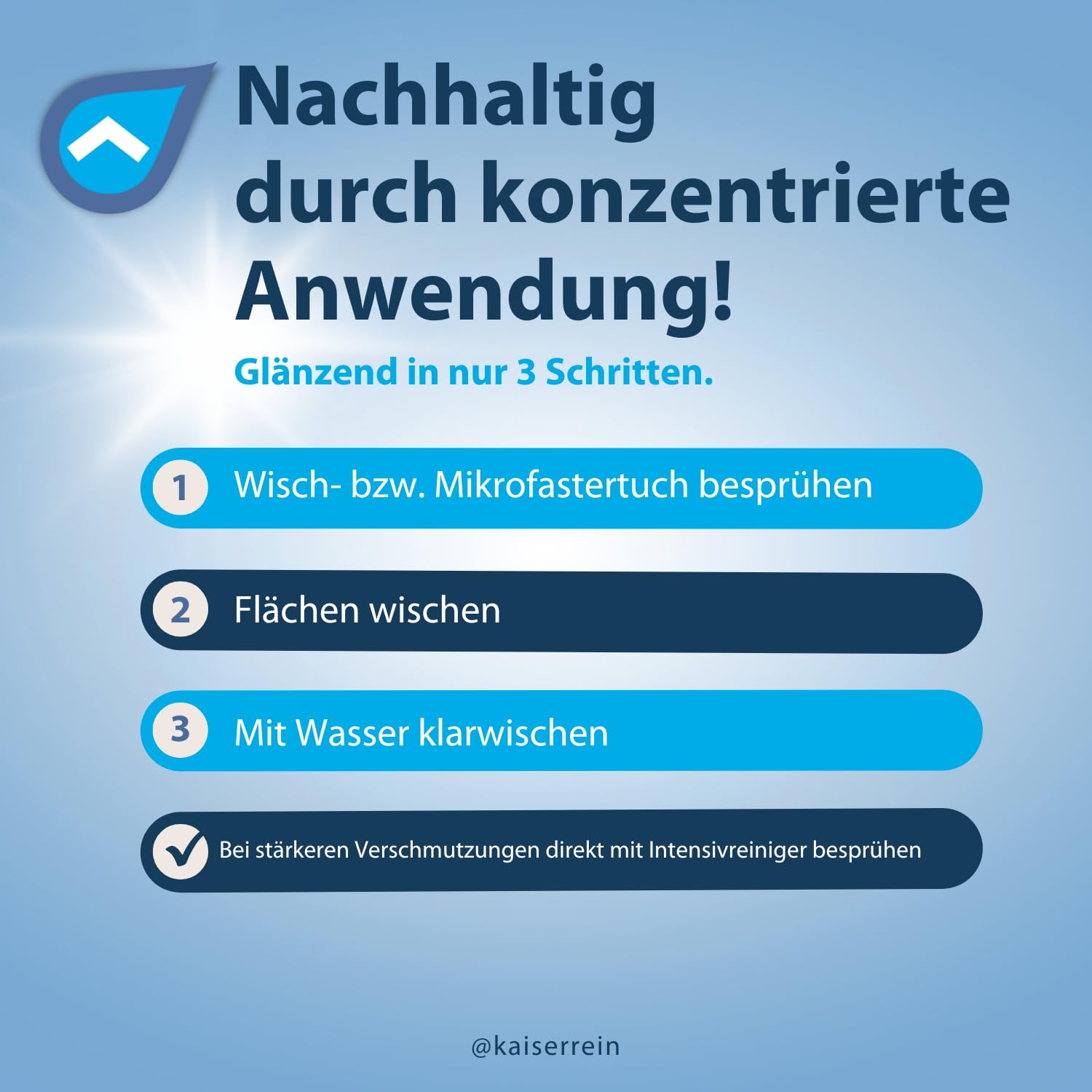 KaiserRein Intensivreiniger Profi ist ein Oberflächenreiniger der Spitzenklasse für wasserfesteoberflächen und anderen technischen Einrichtungen.Kraftvoller Sprühreiniger mit ausgeprägtem Lösevermögen für alle Verschmutzungen z,B. Fett, Öl, Nikotin, Harz, Tee, Kaffee... Er ist für den Härte Einsatz in Gastronomie, Gastro, Haushalt, Industrie und vieles mehr. Er überzeugt durch seine enorme Leistungskraft auf auf allen Flächen ganz besonders auf Edelstahl und Kunststoffflächen. Fläche oder feuchtes Wisch- bzw. Mikrofasertuch ansprühen und wischen. Verschmutztes Tuch in Wasser spülen.Fläche oder feuchtes Wisch- bzw. Mikrofasertuch ansprühen und wischen. Verschmutztes Tuch in Wasser spülen. Flächen feucht klar wischen. Glasflächen trocken nachwischen. Bei starker Verschmutzung Fläche ansprühen, mit Tuch verteilen, einwirken lassen, klar wischen. Auf Oberflächen, Kunststoff, Gummi, Edelstahl, Fliesen, Kunststoff, Lack, Glas, Keramik, Porzellan, Marmor, Kunststein, Feinsteinzeug, Metall, Hochglanz und matt Küchen Grillreiniger Backofenreiniger Küchenfronten-Reiniger Unser Fettlöser Reiniger für Gastronomie, Haushalt, Küche. Entfernt selbst eingebranntes von Küchen, Edelstahl, Grill, und Herdplatten.
