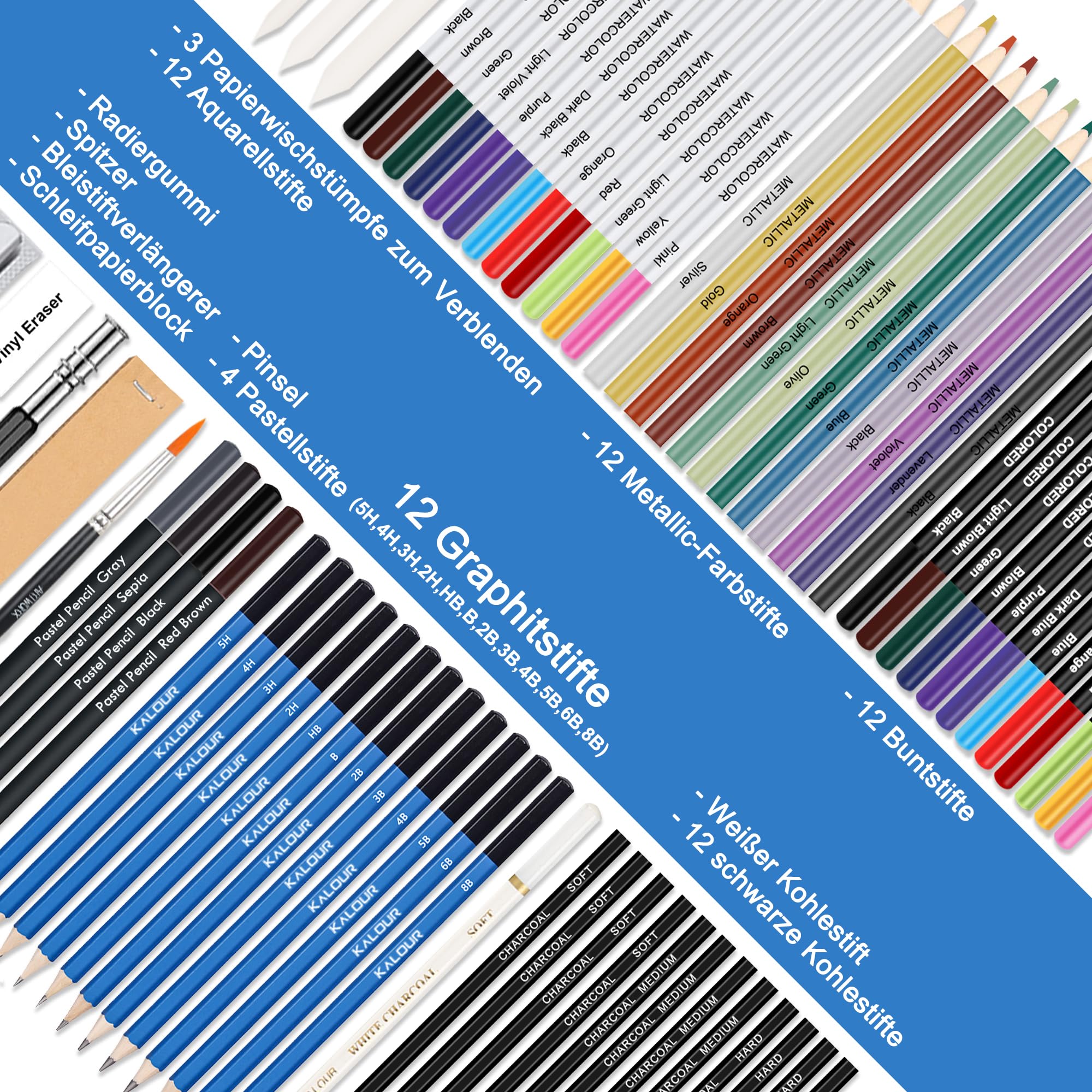 KALOUR 76-teiliges Zeichen- und Skizzierkit-Set: Künstlerbedarf mit Skizzenbuch, Aquarellpapier, Anleitung, Buntstiften, Aquarellfarben, Graphit-, Pastell- und Kohlebleistiften für Künstler,Anfänger