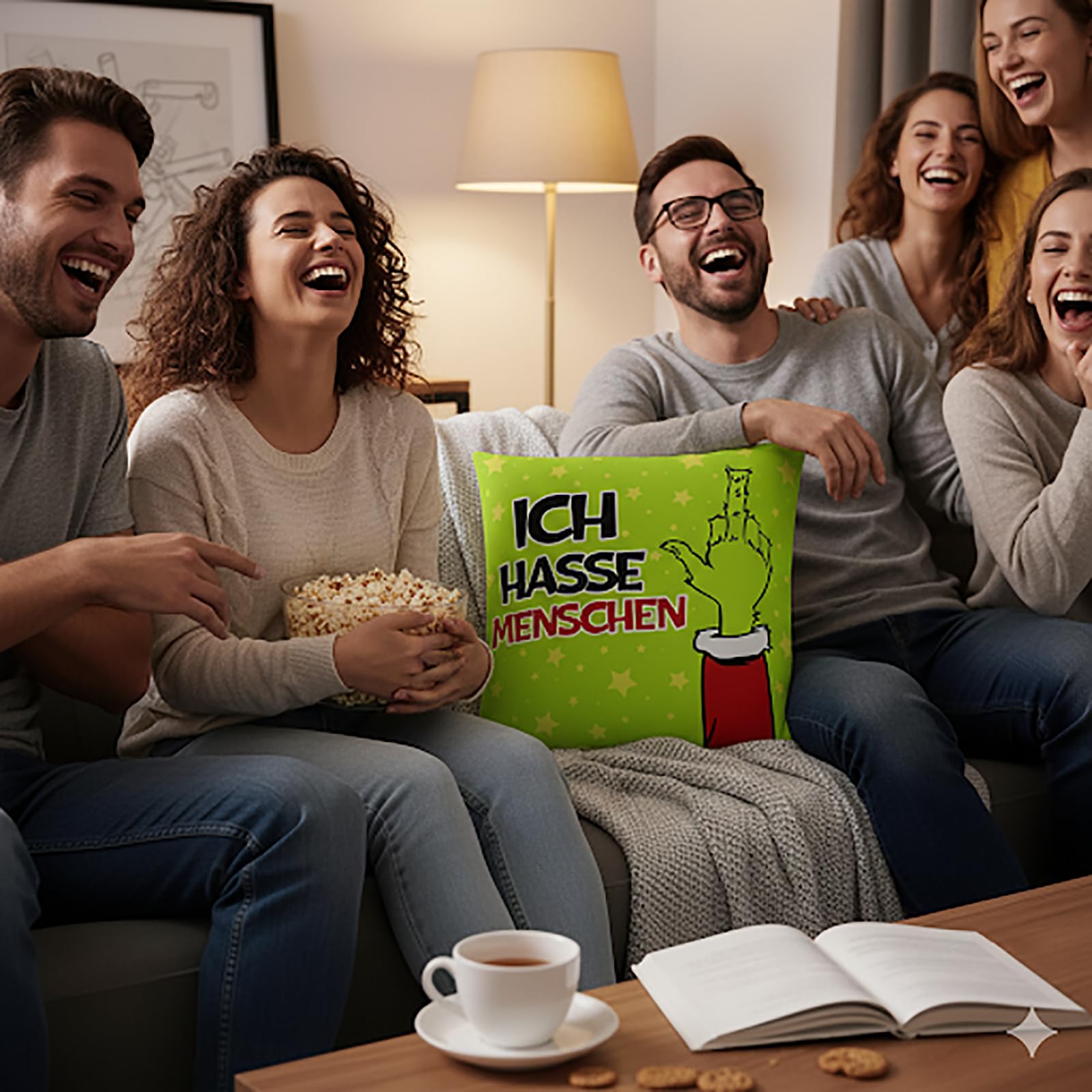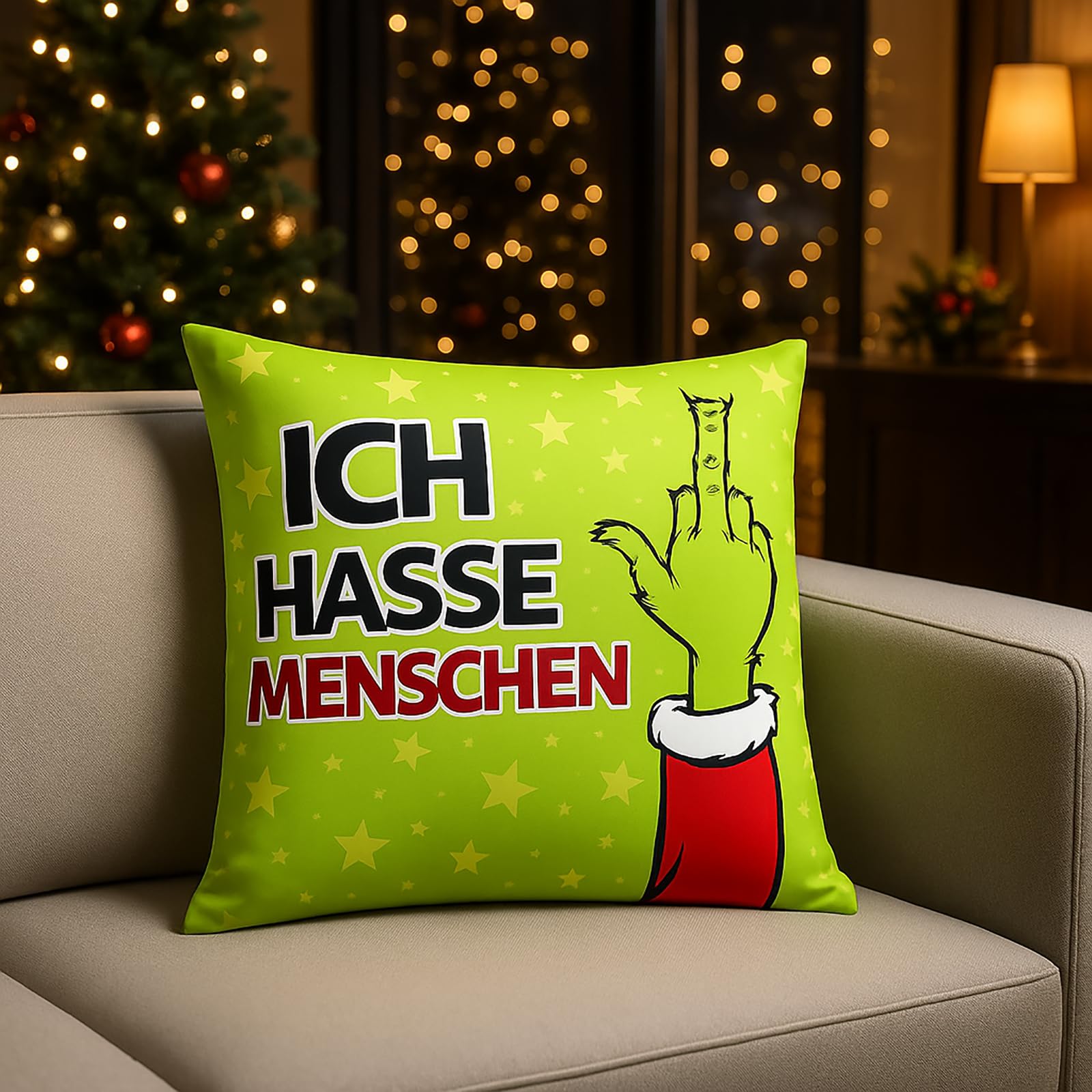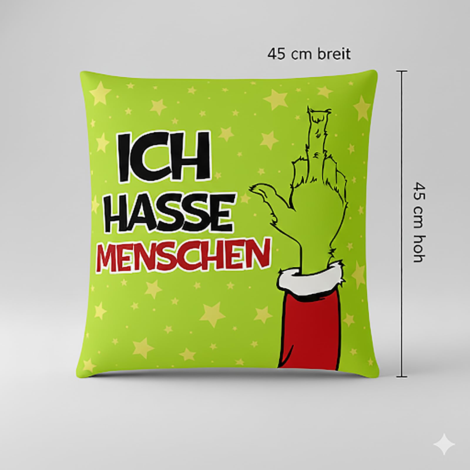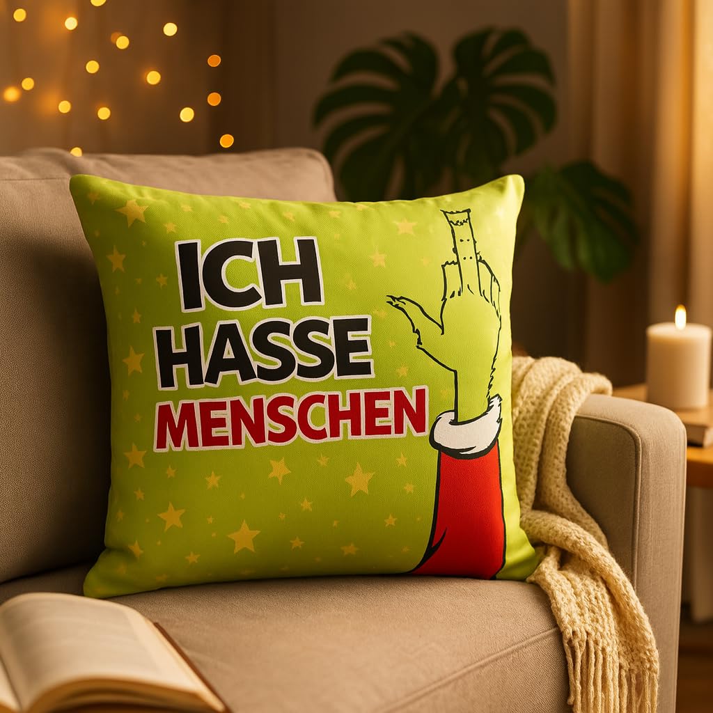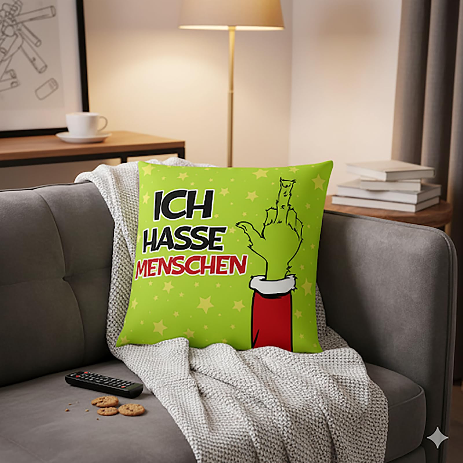 KAMACA Humorvolles Kissen mit provokantem Spruch Geschenk für Zyniker und alle, die EIN Lächeln brauchen Inklusive Füllung flauschig frech für Sofa Büro Weihnachten (Muffel - Ich Hasse Menschen)
