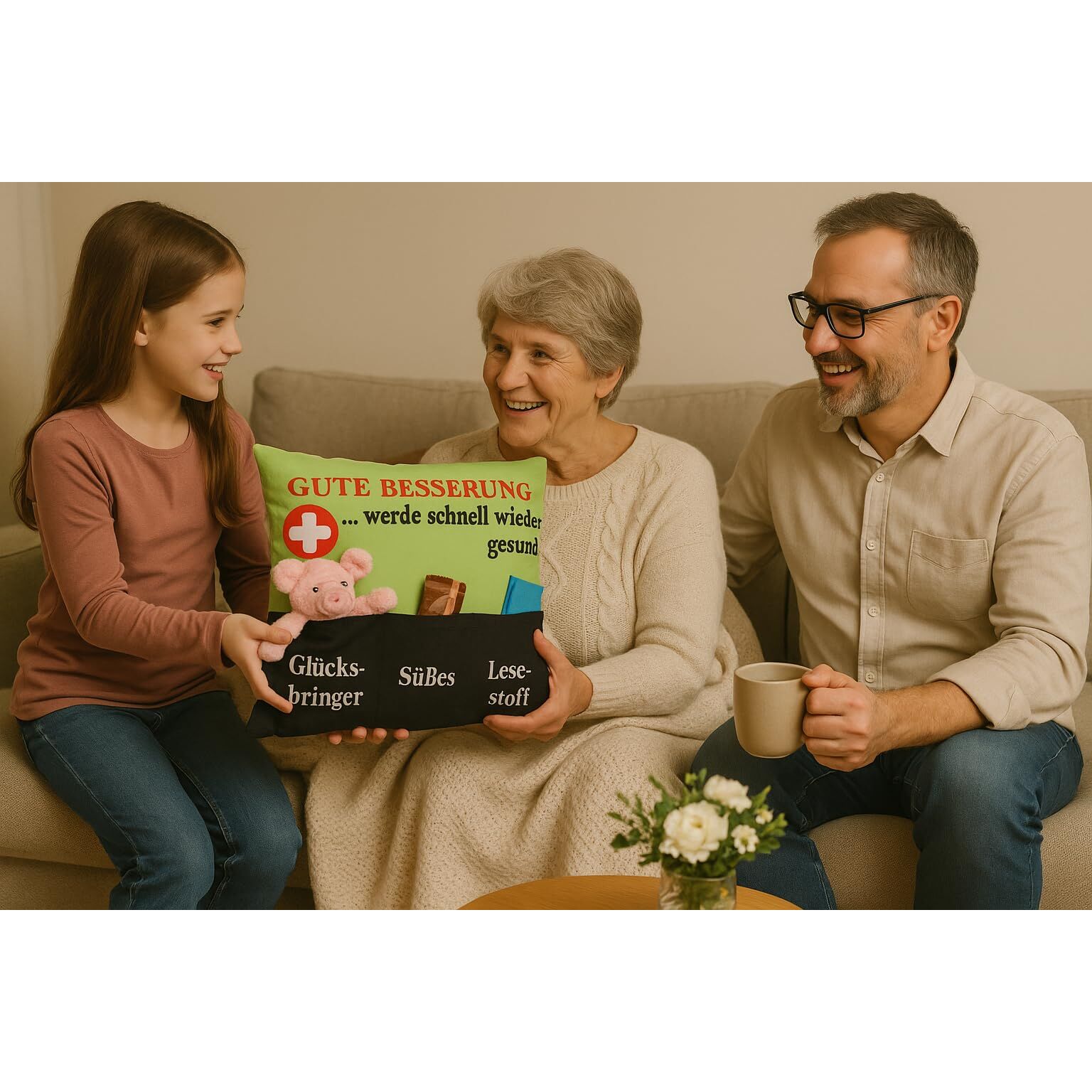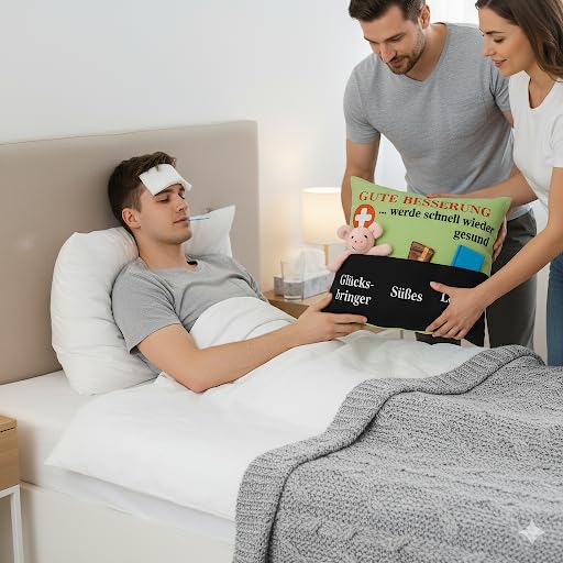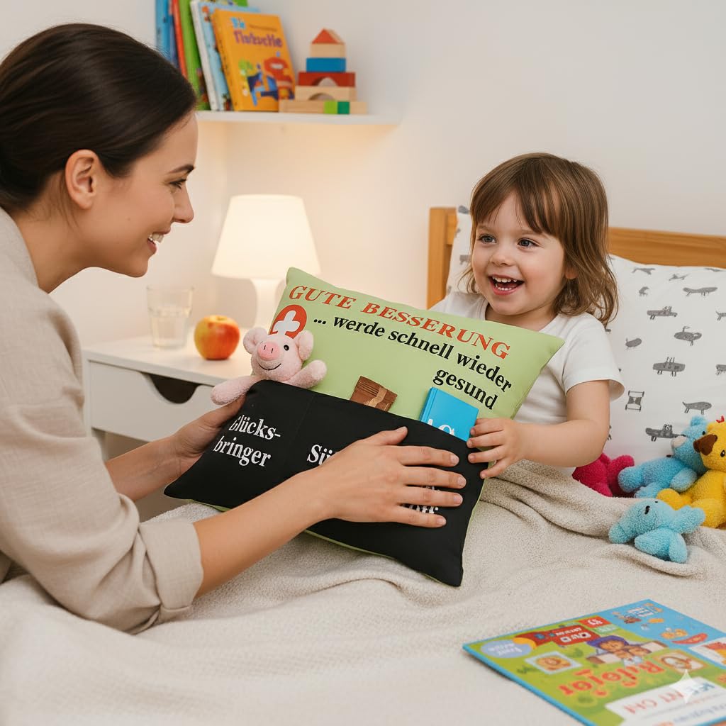 Dieses kuschelige Gute-Besserung-Kissen von KAMACA ist das ideale Geschenk für jemanden, der krank ist, Ruhe braucht oder einfach eine kleine Aufmunterung verdient. Im Gegensatz zu einem einfachen Kissenbezug wird es inklusive Kissenfüllung (Inlet) geliefert – sofort einsatzbereit und kuschelweich. Besonders originell sind die drei separaten Taschen, die individuell befüllt werden können: mit Taschentüchern, einer kleinen Tafel Schokolade, einem Glücksbringer, Snacks oder einem Buch. So kannst du das Kissen ganz persönlich gestalten und auf die Bedürfnisse des Beschenkten abstimmen. Ob für ein krankes Kind, für Oma und Opa, für die beste Freundin oder den Partner – dieses Kissen bringt nicht nur praktische Hilfe, sondern auch eine liebevolle Botschaft: „Werde schnell wieder gesund.“ Es ist ein Geschenk, das lange in Erinnerung bleibt und immer wieder Geborgenheit schenkt. Gefertigt aus 100 % Polyester, ist das Kissen angenehm weich, pflegeleicht und bei 40 °C waschbar. Mit einer Grösse von 43 x 43 cm eignet es sich perfekt für Sofa, Bett oder Kinderzimmer. ???? Das Foto zeigt ein Dekorationsbeispiel. Die Lieferung erfolgt ohne Befüllung der Taschen – so kannst du das Kissen ganz individuell gestalten.