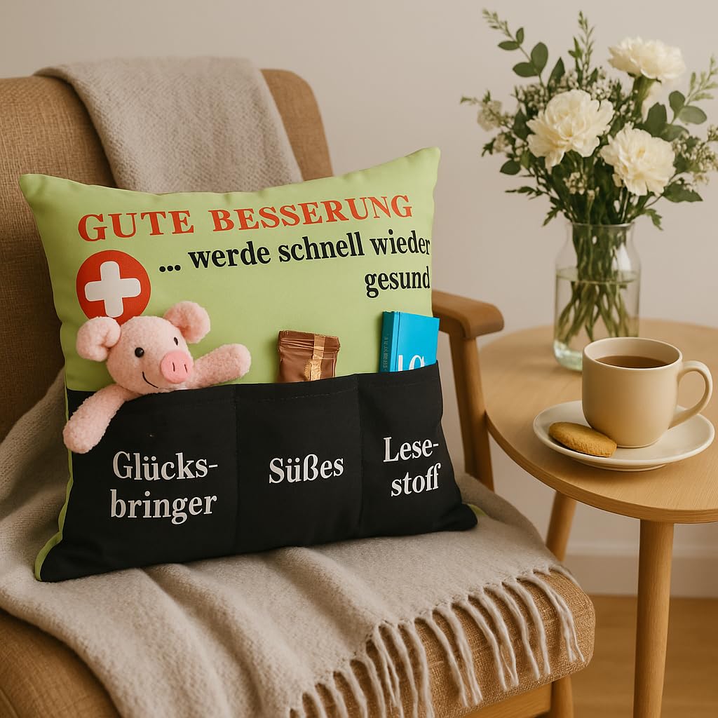 KAMACA Originelles Dekokissen Kissen mit 3 Taschen zum selber Befüllen Grösse 43x43 cm tolles Geschenk (Gute Besserung)