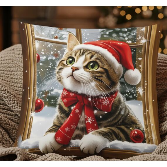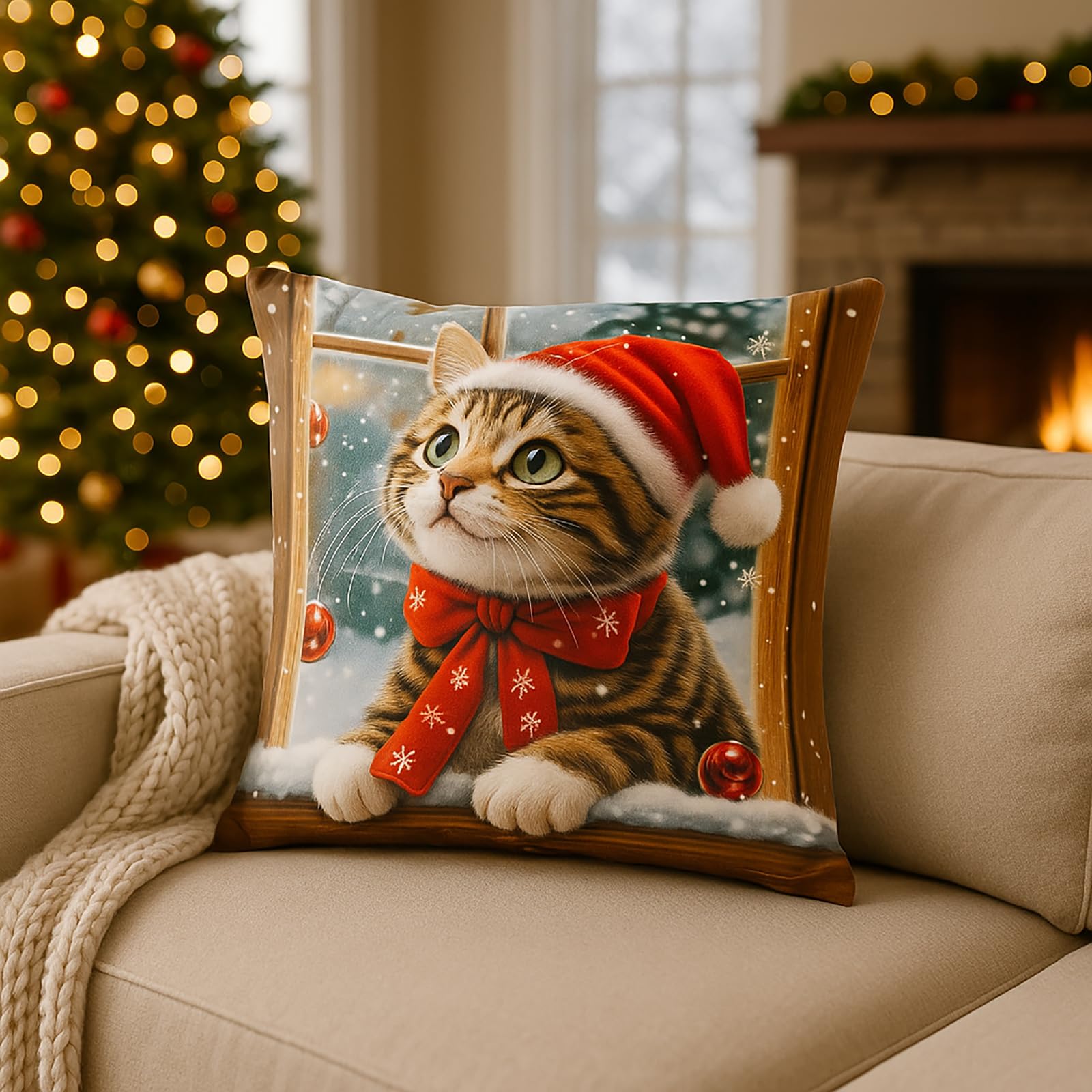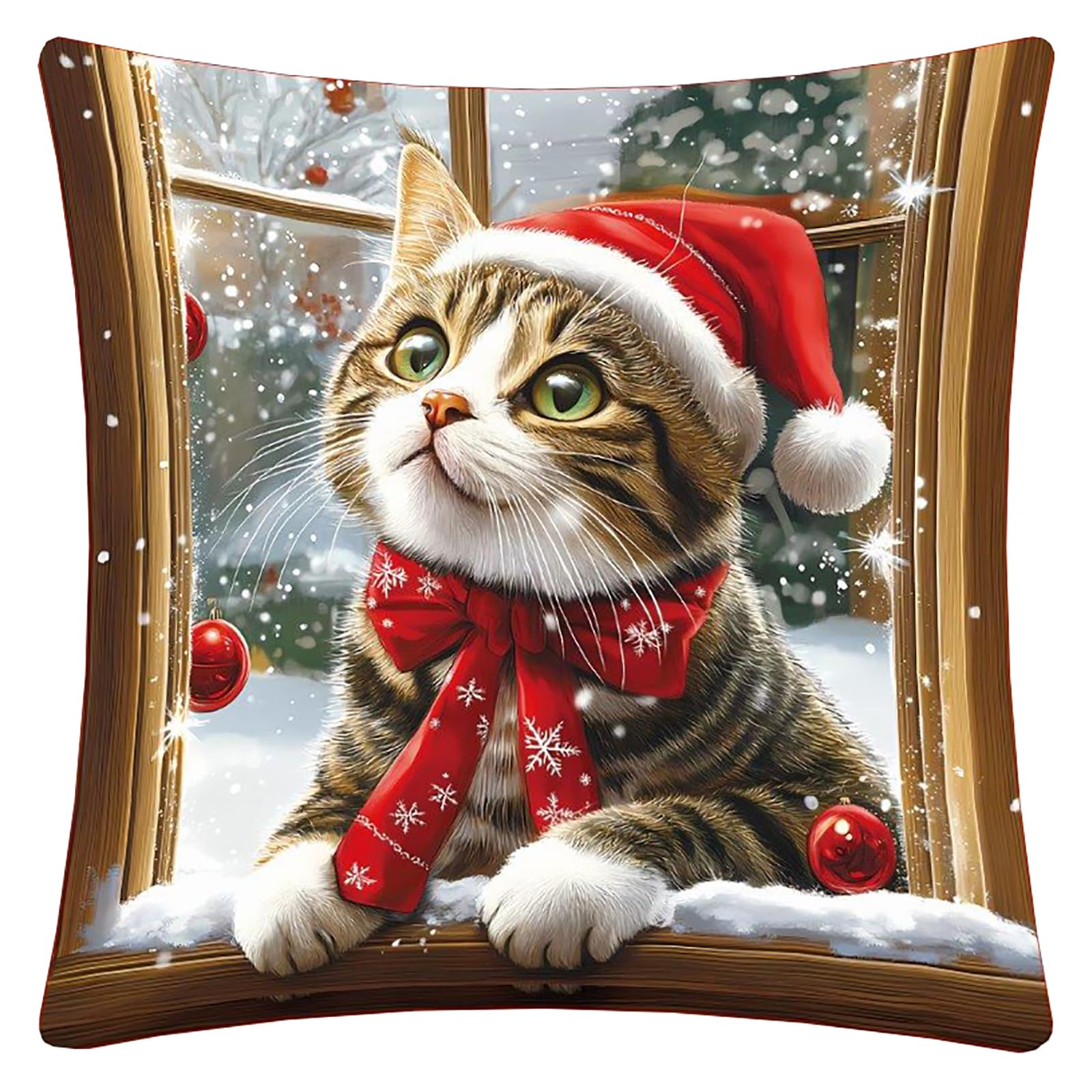 KAMACA Weihnachtskissen Katze 40x40 cm mit Füllung Deko-Kissen mit süssem Katzenmotiv & Reissverschluss Gefülltes Sofakissen Winter Weihnachten Kuschelig & dekorativ Geschenk (Katze am Fenster)