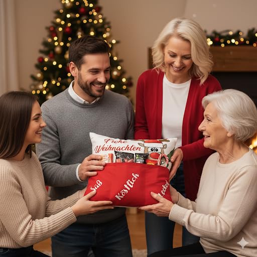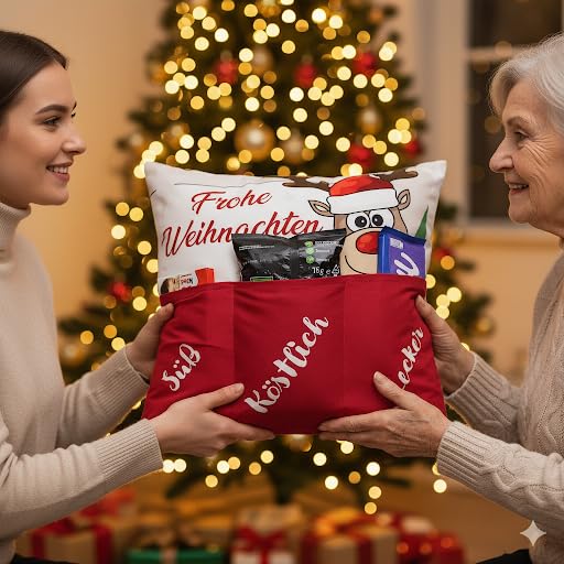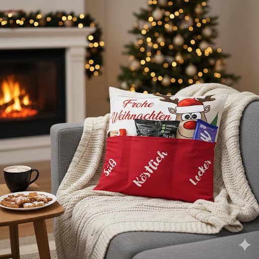 Dieses festliche Weihnachtskissen mit Kissenfüllung und drei praktischen Taschen ist die perfekte Kombination aus Dekoration und Geschenkidee. Mit seinem liebevollen Design („Frohe Weihnachten“ mit Rentier-Motiv) und den drei separaten Taschen ist es nicht nur ein Blickfang in jedem Wohnzimmer, sondern auch ein echtes Highlight für die Feiertage.Die Taschen können ganz individuell befüllt werden – mit Schokolade, Lebkuchen, kleinen Geschenken, Grusskarten oder Glücksbringern. So entsteht ein persönliches Präsent, das gleichzeitig für Gemütlichkeit sorgt und in jedem festlich geschmückten Zuhause zum Hingucker wird.Ob als originelle Geschenkidee für Familie und Freunde oder als dekoratives Wohnaccessoire – dieses Kissen schenkt Freude, Wärme und weihnachtliche Stimmung.Das Foto dient als Dekorationsbeispiel, Lieferung ohne Befüllung Bitte beachten Sie auch die anderen Angebote im KAMACA-SHOPNur hier in Ihrem KAMACA-SHOP finden Sie eine breite Auswahl von uns ausgesuchter Artikel zu einem ausgezeichneten Preis-/Leistungsverhältnis.