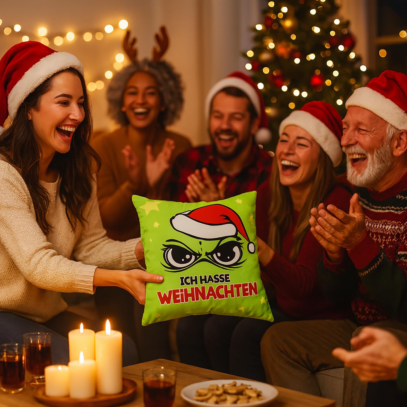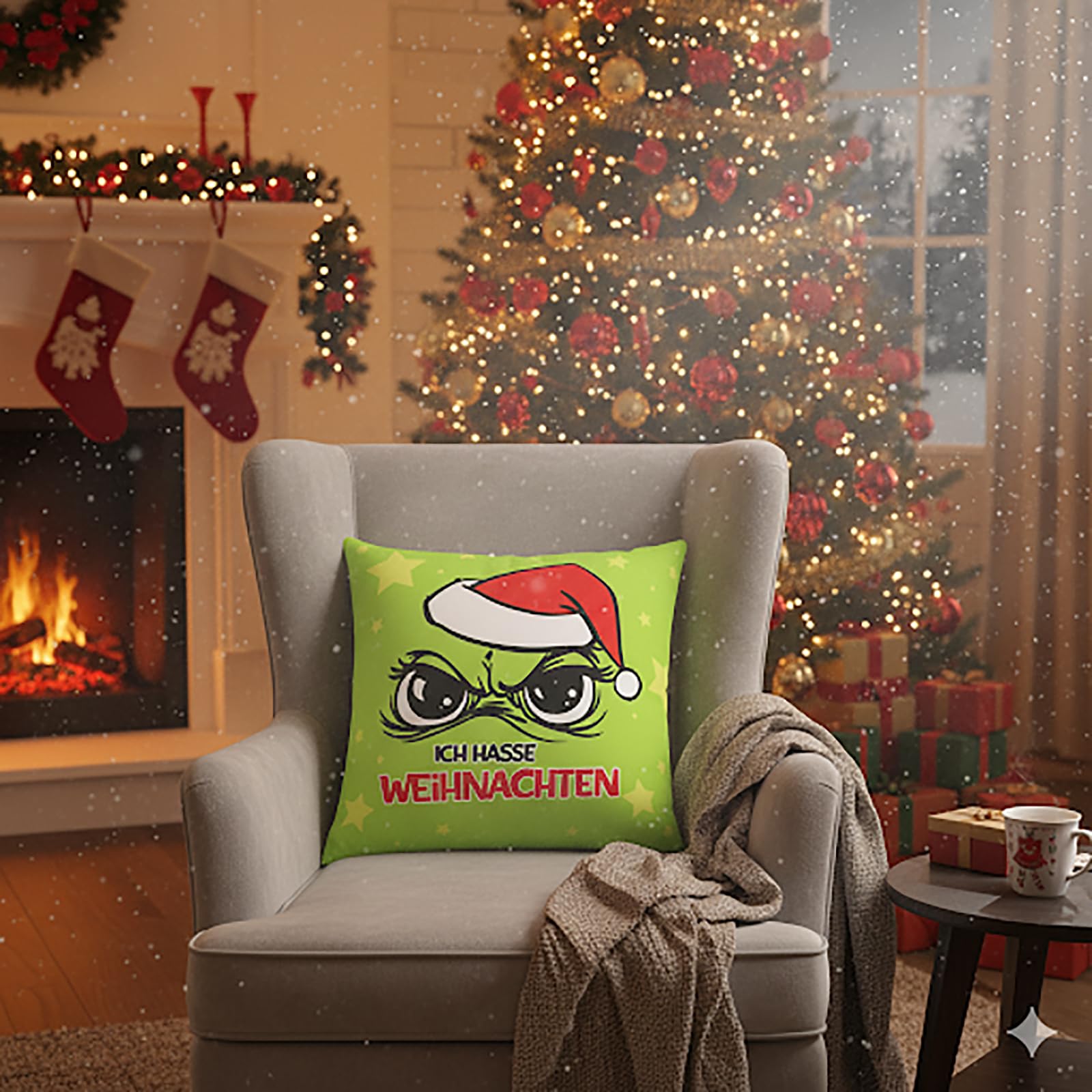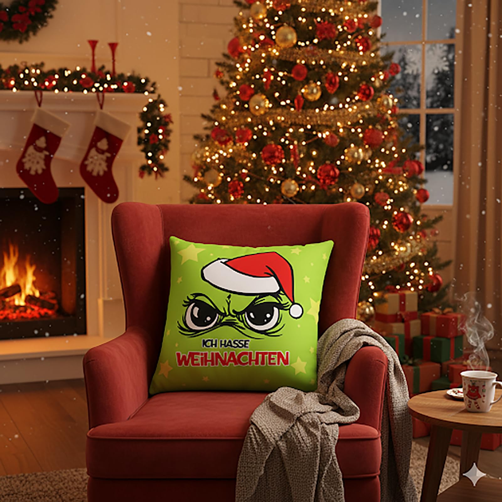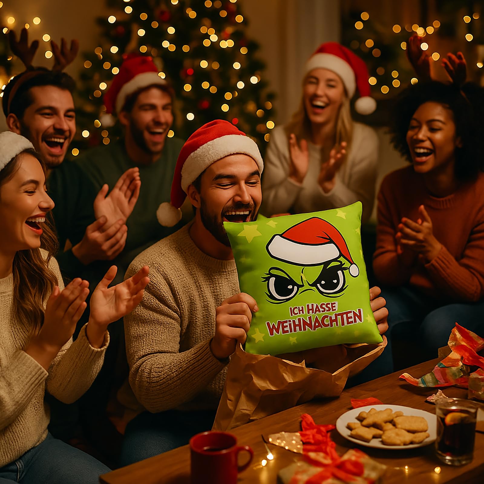 Sind Sie es leid, schon im Oktober Lebkuchen zu sehen? Bekommen Sie Ausschlag bei "Last Christmas"? Und der Gedanke an fröhliche Weihnachtslieder treibt Sie in den Wahnsinn? Dann sagen Sie es klar und deutlich – und zwar mit Stil! Unser Kissen „Ich hasse Weihnachten“ ist mehr als nur eine weiche Unterlage für Ihr gestresstes Haupt. Es ist ein Statement! Mit dem unverkennbaren, mürrischen Blick aus unter einer roten Mütze und der unmissverständlichen Botschaft "ICH HASSE WEIHNACHTEN" (natürlich mit einer Prise festlicher Sterndekoration, damit es nicht ganz so mürrisch aussieht), zeigen Sie jedem Besucher, wo die Bescherung aufhört. Warum Sie dieses Kissen lieben werden (oder zumindest nicht hassen): Ihr persönlicher Seelenverwandter: Endlich ein Kissen, das Ihre wahren Gefühle versteht und für Sie zum Ausdruck bringt. Schluss mit dem vorweihnachtlichen Smalltalk – dieses Kissen sorgt für Lacher. Der ultimative Eisbrecher (oder Rausschmeisser): Perfekt, um Gespräche zu beginnen... oder zu beenden. Je nachdem, wie Sie es platzieren! Das Wende-Design ist dafür übrigens genial: Seite A zeigt Ihre maximale Ehrlichkeit, und Seite B (schlicht Weiss) können Sie rausholen, wenn der Besuch da ist oder Sie Frieden schliessen wollen. Samtig-flauschig für gemütlichen Widerstand: Dieses Komplettkissen aus weicher Mikrofaser ist ein Traum für Winter-Nickerchen, Serien-Marathons und alle „Ich-bleib-hier“-Momente. Egal, ob Sie den Festtagsfilmen entfliehen oder einfach nur eine Pause brauchen, hier liegen Sie richtig! Schön gross & farbstark bedruckt: Mit 45x45 cm ist es nicht nur schön gross fürs Sofa und stützt perfekt den Nacken beim Keksetest, sondern der konturscharfe, leuchtende Druck bleibt auch nach vielen Adventsabenden ein Blickfang. Formschön & praktisch: Der verdeckte Reissverschluss sorgt für eine makellose Optik und der Bezug lässt sich blitzschnell abnehmen. Keine Zipper-Beule, nur saubere Kanten! Also, wenn Sie die Feiertage mit einem Augenzwinkern überstehen und gleichzeitig zeigen wollen, dass nicht jeder ein "Weihnachtswunder" braucht, dann holen Sie sich jetzt Ihr "Ich hasse Weihnachten"-Kissen. Und wer weiss, vielleicht bringt es Sie ja doch zum Schmunzeln... ganz heimlich natürlich.