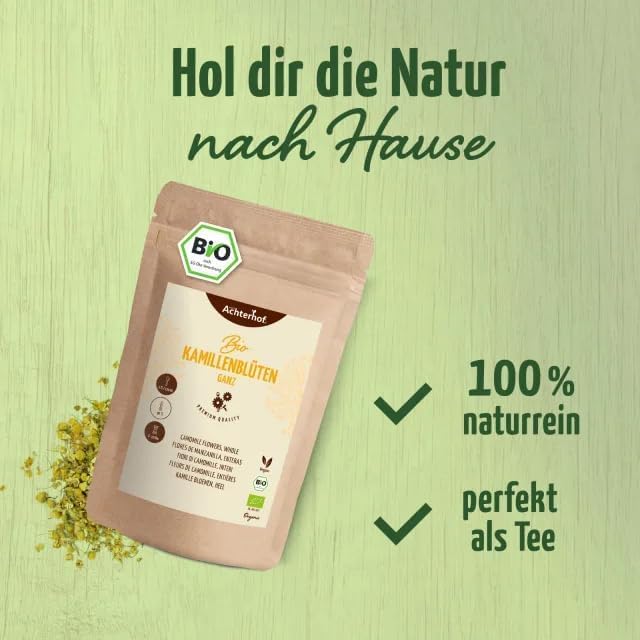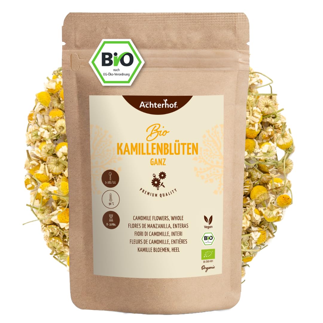 Kamillenblüten getrocknet Bio lose 500g | ganze Kamillenblüten getrocknet | in Bio-Qualität | Kamillentee aus Blüten-Köpfe | 100% naturürlich | leicht bitterer und milder Geschmack | vom Achterhof