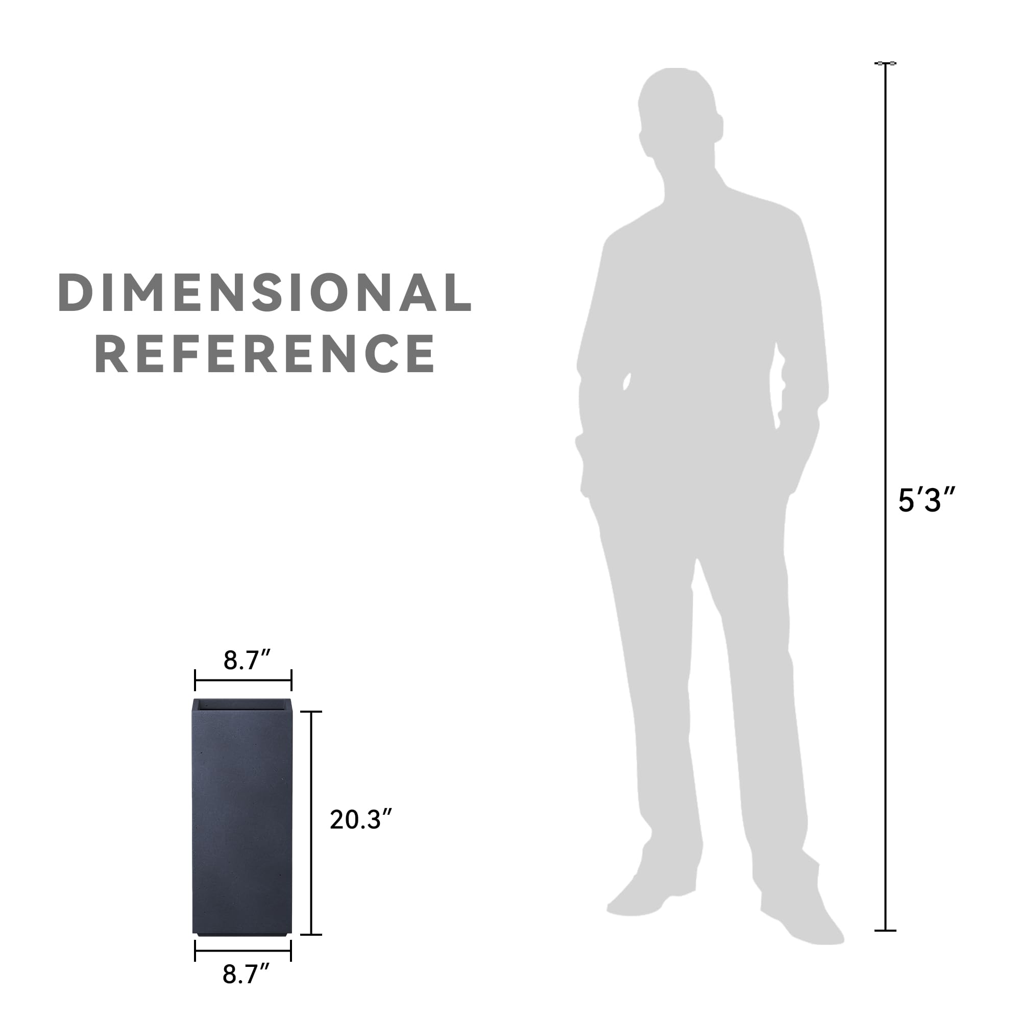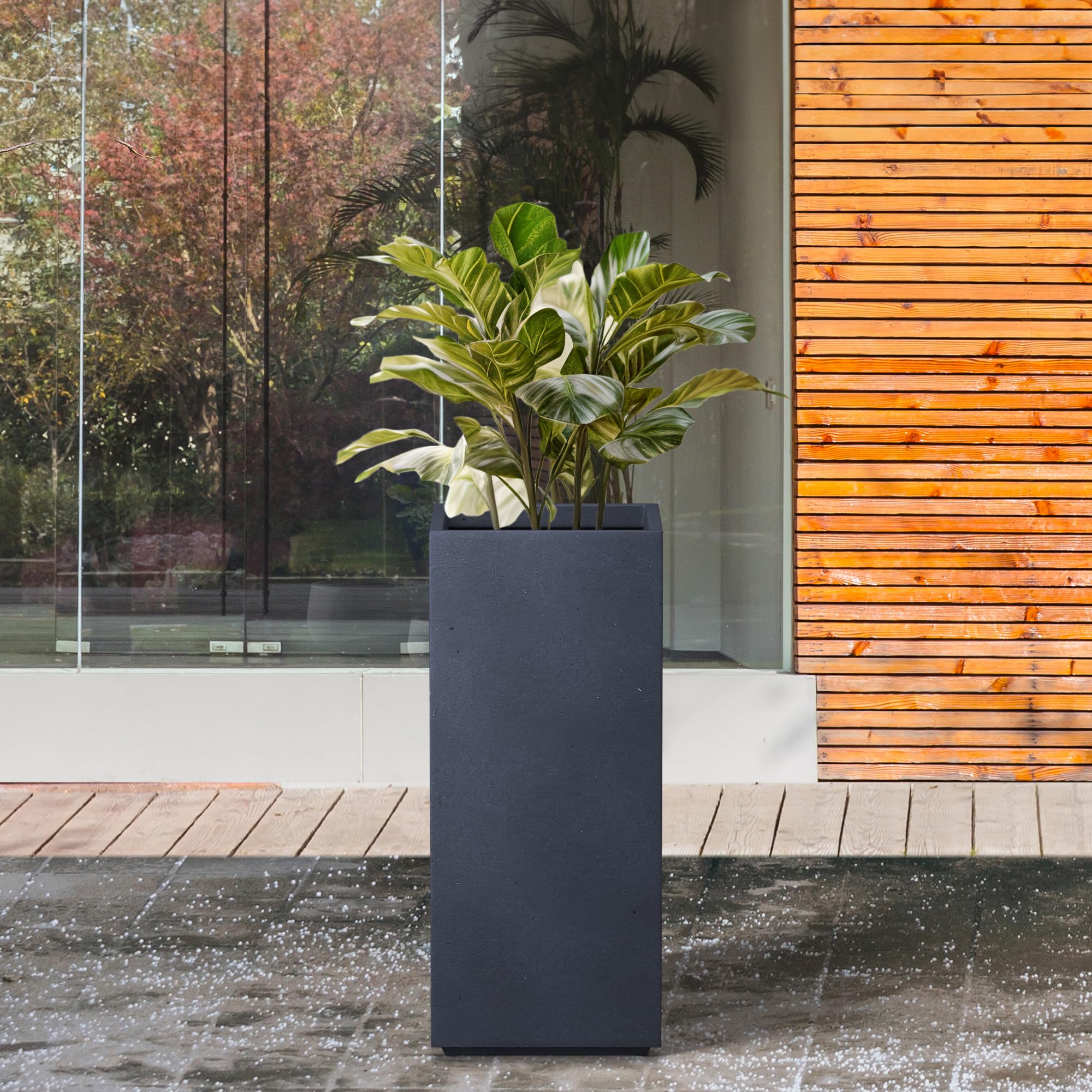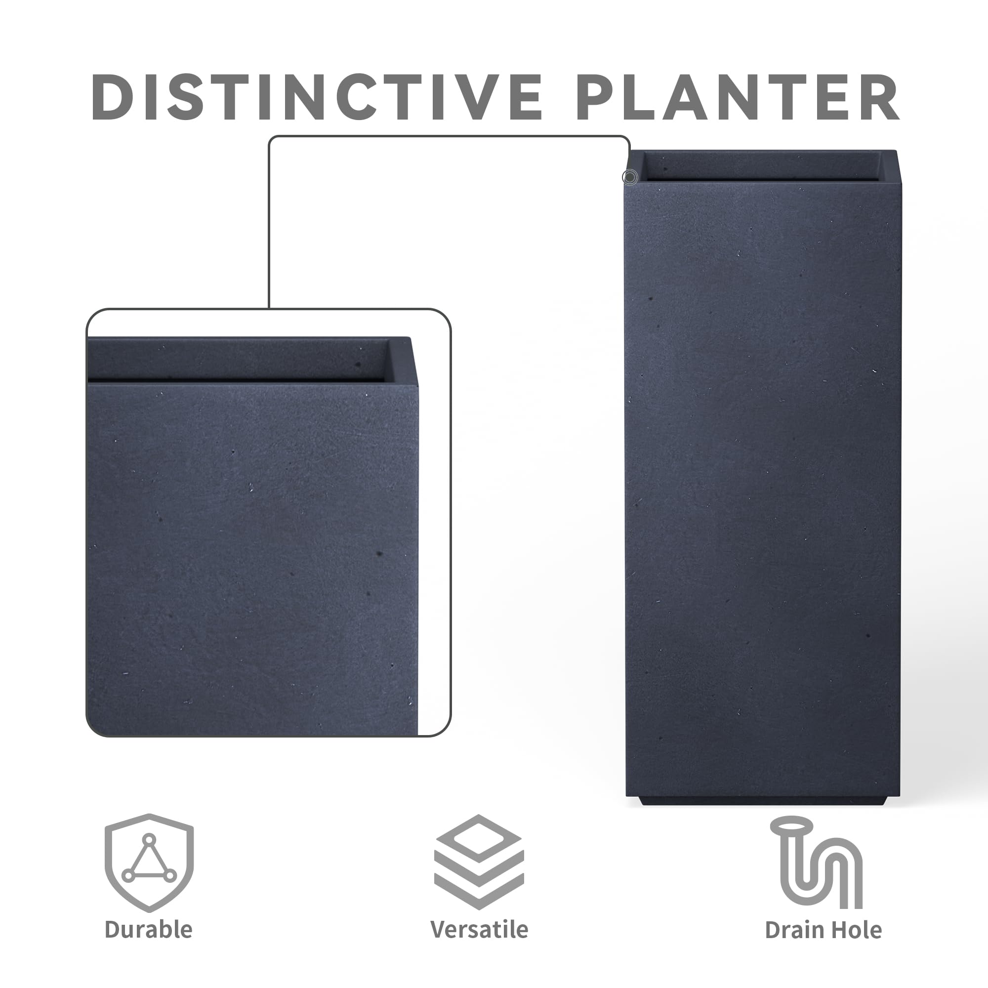 Diese eleganten, quadratischen Pflanzgefässe haben eine authentische Betonoberfläche mit sichtbaren Poren und machen sie zu schönen, modernen Stücken. Die Optik und Haptik ist echter Beton, wiegt aber wesentlich weniger als es aussieht. Es hat auch eine sehr glatte Oberfläche anstelle von rauen Betontöpfern, die Sie vielleicht gewohnt sind. Die Grösse ist sehr grosszügig und kann eine gute Menge an Pflanzen aufnehmen, ohne überfüllt auszusehen. Es hat ein moderneres Gefühl, da es gerade Linien und Beton ist. Sieht toll aus auf dem Balkon oder der grossen Terrasse im Hinterhof. Diese hohen Pflanzgefässe aus Beton passen am besten zu modernen Designs. Sie verfügen über saubere Winkel und eine reine Zementoberfläche, die Ihrem Lieblingsraum Raffinesse verleiht. Verwenden Sie sie mit hohen Pflanzen für einen dimensionalen Effekt. Hergestellt aus Leichtbeton durch ein Herstellungsverfahren. Dieses Verbundmaterial hat kein Gummi, Kunststoff und Stahl. Dieses Material hat alle Vorteile von Beton wie Festigkeit, Haltbarkeit, Wetter- und Schadensbeständigkeit. Materialien bestehen aus Zement und witterungsbeständigem Fiberglas. Dieses Material hat eine starke UV-beständige Fähigkeit und bleibt gut in Wind, Regen, Hitze und Kälte. Durch das Hinzufügen von Fiberclay Material ist der Pflanztopf aufgrund seines leichteren Gewichts viel einfacher zu bewegen.