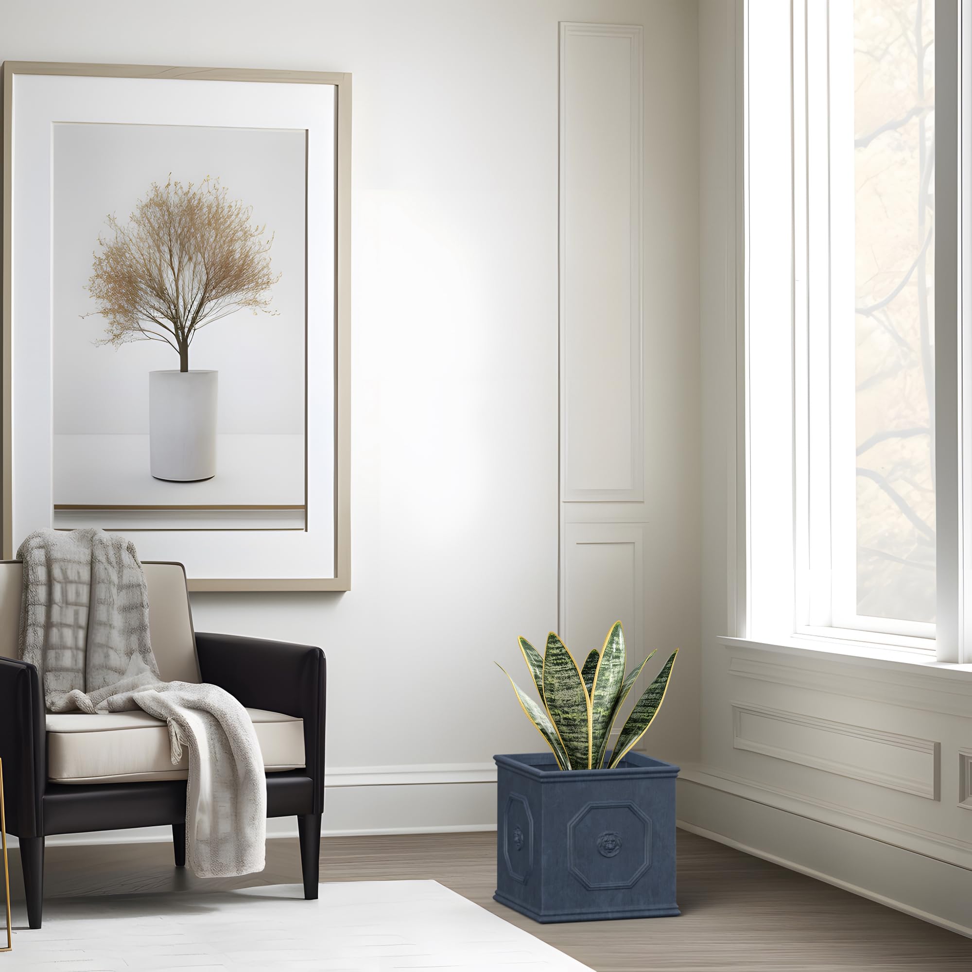 Kante Quadratischer Übertopf aus Beton mit Löwenkopf, 32,5 cm grosser Blumentopf mit Drianage, modernes Dekor im englischen Stil für Zuhause, Terrasse, Garten, antikgrauer, eleganter Beton-Übertopf – Entdecken Sie ein modernes Design mit glatten, fliessenden Kurven und einer natürlich verwitterten Oberfläche, die zeitlose Attraktivität ausstrahlt. Mit Sorgfalt gefertigt, verbindet dieses Statement-Stück nahtlos zeitgenössischen Stil mit organischer Textur, mit subtilen Poren, die seine Authentizität verstärken. Er verleiht verschiedenen Umgebungen einen raffinierten Hauch von Charakter. Handgefertigter Blumentopf – Hergestellt aus einer hochwertigen Betonmischung, maximiert dieser Topf Haltbarkeit, Stärke und Beständigkeit gegen Wetter und Beschädigungen. Seine dauerhafte Farbe, kombiniert mit UV-Beständigkeit, sorgt dafür, dass er sein lebendiges Aussehen unter den Bedingungen im Freien beibehält. Gross und vielseitig – ob Sie eine Pflanze im Innenbereich präsentieren oder auf der Vorderstufe, Veranda oder Terrasse positionieren, dieser grosszügig dimensionierte Übertopf wertet moderne, minimalistische und traditionelle Stile mit seinem einzigartigen Design auf. Seine Vielseitigkeit macht ihn gut geeignet für eine Vielzahl von Umgebungen. Drainagesystem: Unser Pflanztopf verfügt über Drainagelöcher für effizientes Wassermanagement, jeweils mit einem Gummistopfen für den Innen- und Aussenbereich ausgestattet. Geniessen Sie mühelose Gartenarbeit mit minimalem Pflegeaufwand und fördern Sie eine gesunde Umgebung für Ihre Pflanzen.