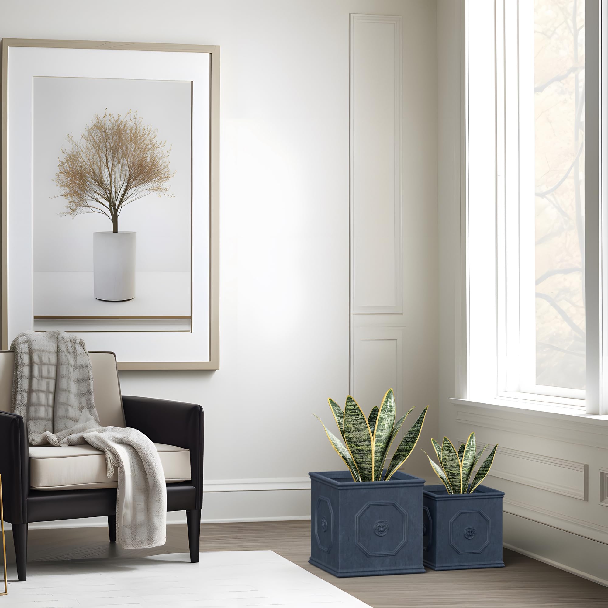 Kante Quadratischer Pflanzkübel aus Beton mit Löwenkopf, 2er-Set, 25,4 und 32,8 cm, grosser Blumentopf mit Drianage, moderner englischer Stil, Dekoration für Zuhause, Terrasse, Garten, Antikgrau