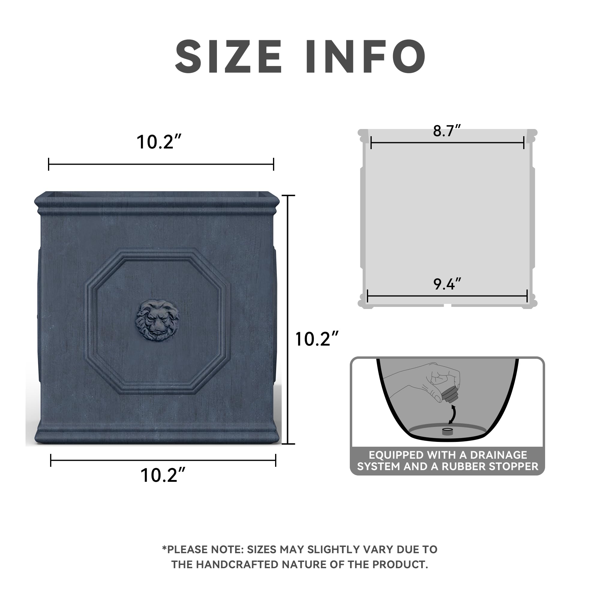 Setzen Sie ein kraftvolles Statement mit diesen quadratischen Pflanzgefässen im englischen Stil. Die Löwenkopfprägung ist ein Symbol für Stärke, Tapferkeit und Königlichkeit. Das Blei-Finish wird den Blick auf die lebendigen Farben Ihrer Pflanze lenken. Hergestellt aus Leichtbeton durch ein Herstellungsverfahren. Dieser Verbundwerkstoff hat alle Vorteile von Beton wie Festigkeit, Haltbarkeit, Wetter- und Schadensbeständigkeit, aber aufgrund seines leichteren Gewichts viel einfacher zu bewegen.