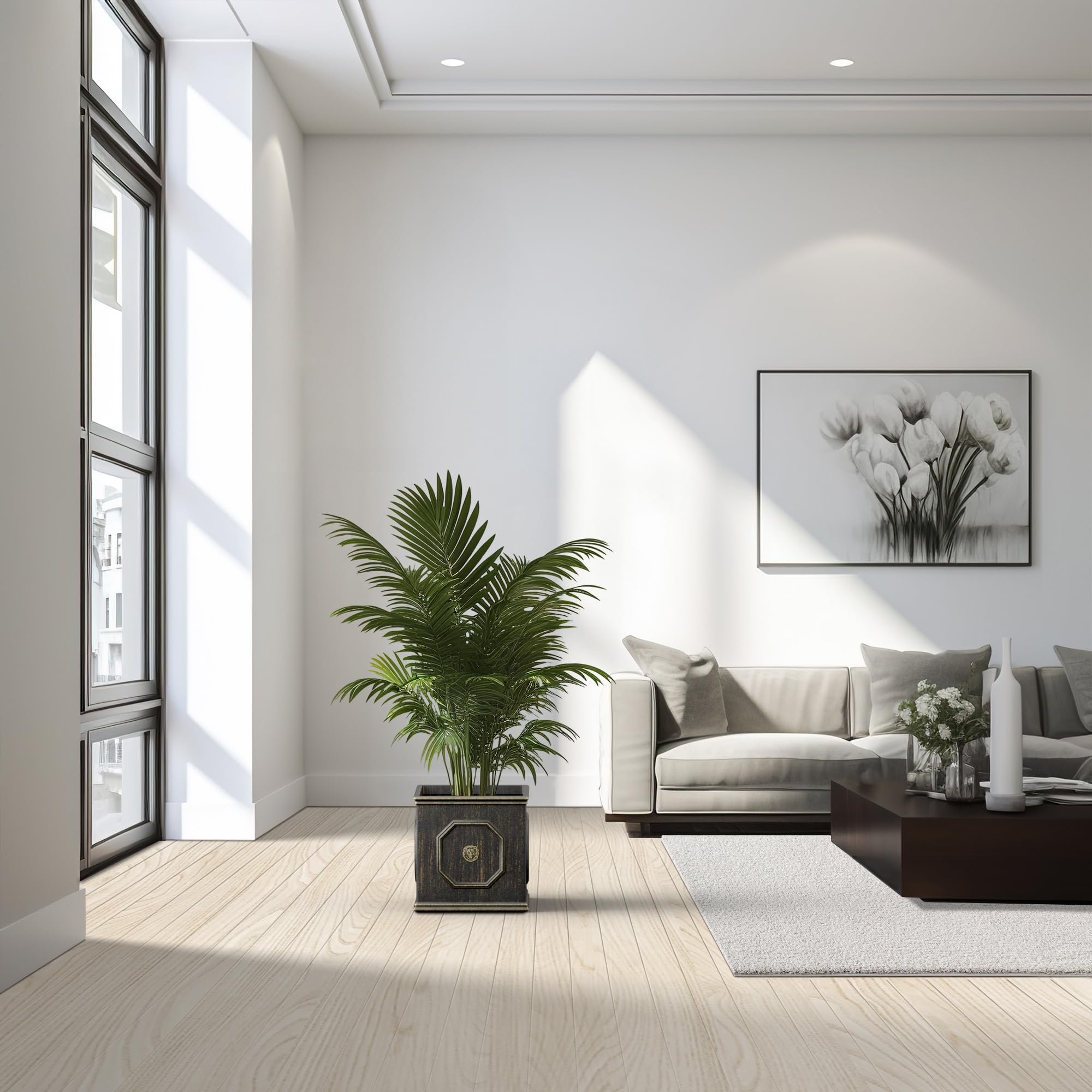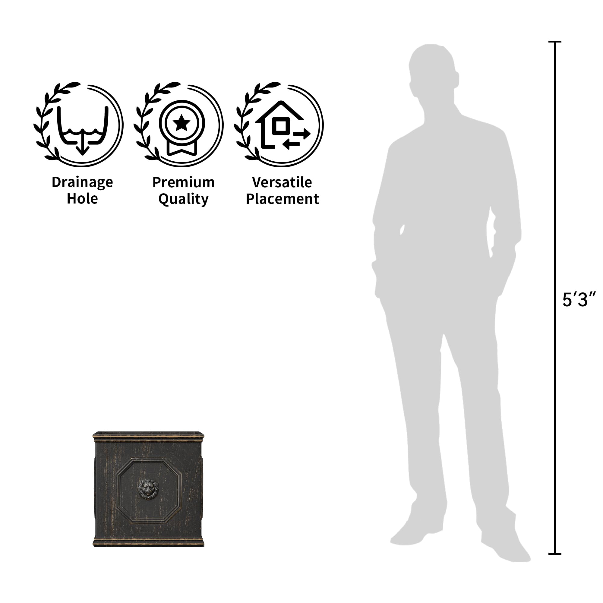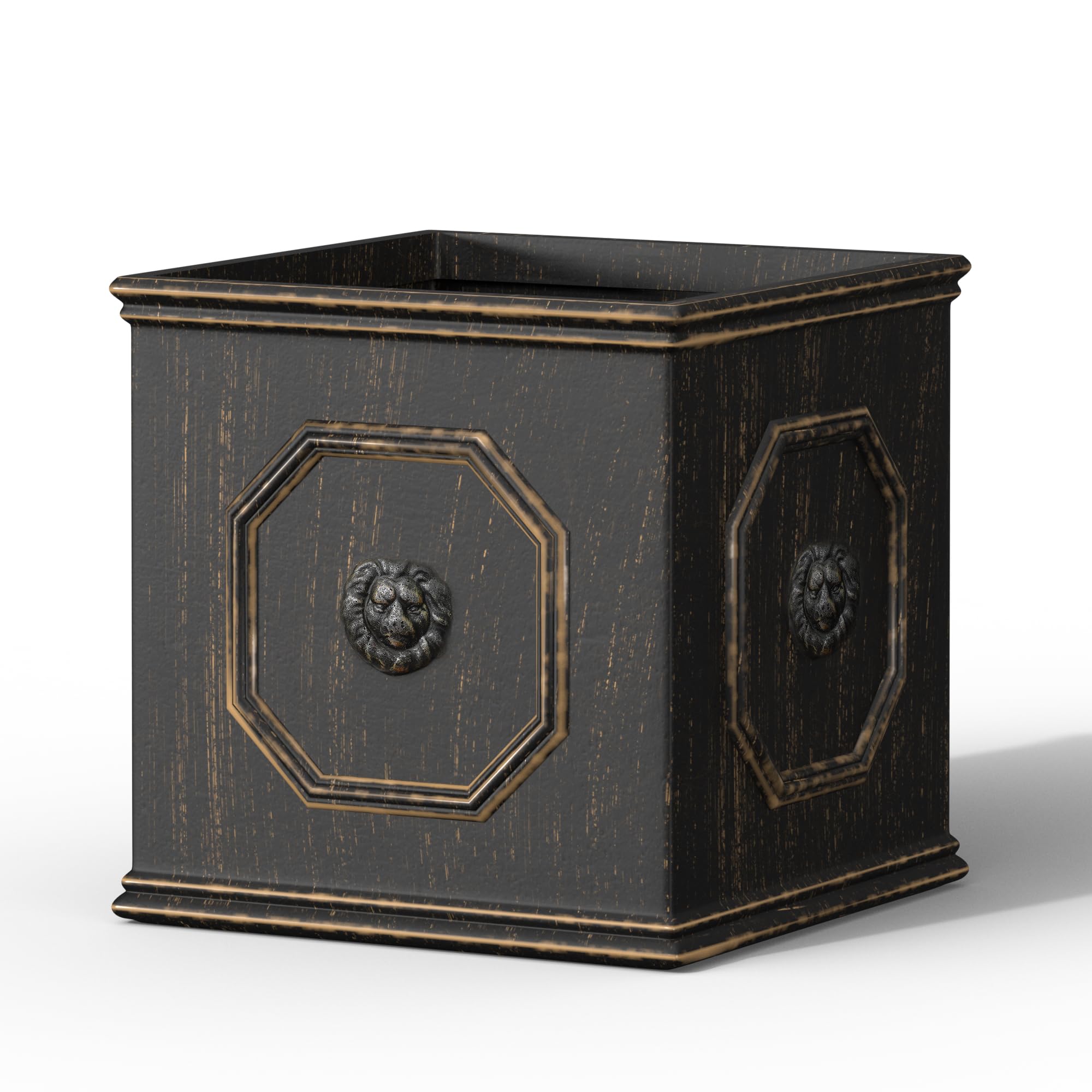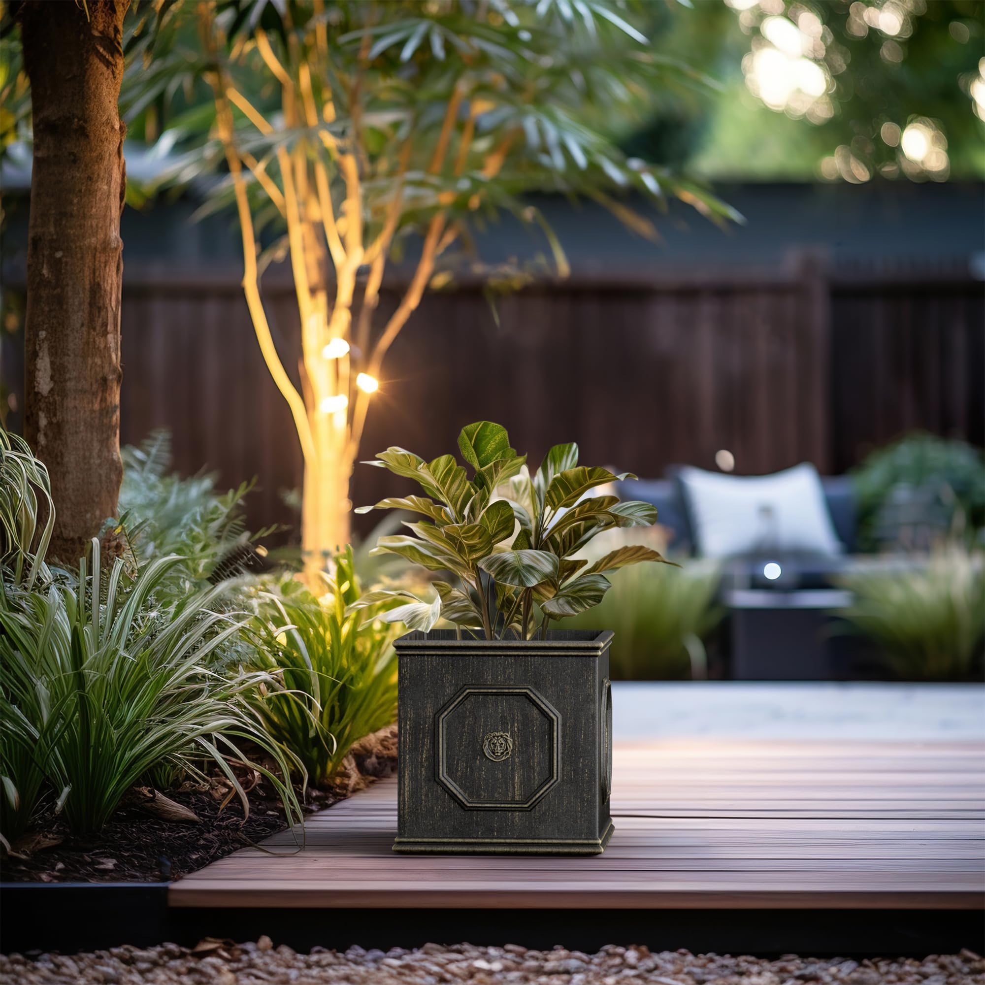 Setzen Sie ein kraftvolles Statement mit diesen quadratischen Pflanzgefässen im englischen Stil. Die Löwenkopfprägung ist ein Symbol für Stärke, Tapferkeit und Königlichkeit. Das Blei-Finish wird den Blick auf die lebendigen Farben Ihrer Pflanze lenken. Hergestellt aus Leichtbeton durch ein Herstellungsverfahren. Dieser Verbundwerkstoff hat alle Vorteile von Beton wie Festigkeit, Haltbarkeit, Wetter- und Schadensbeständigkeit, aber aufgrund seines leichteren Gewichts viel einfacher zu bewegen.