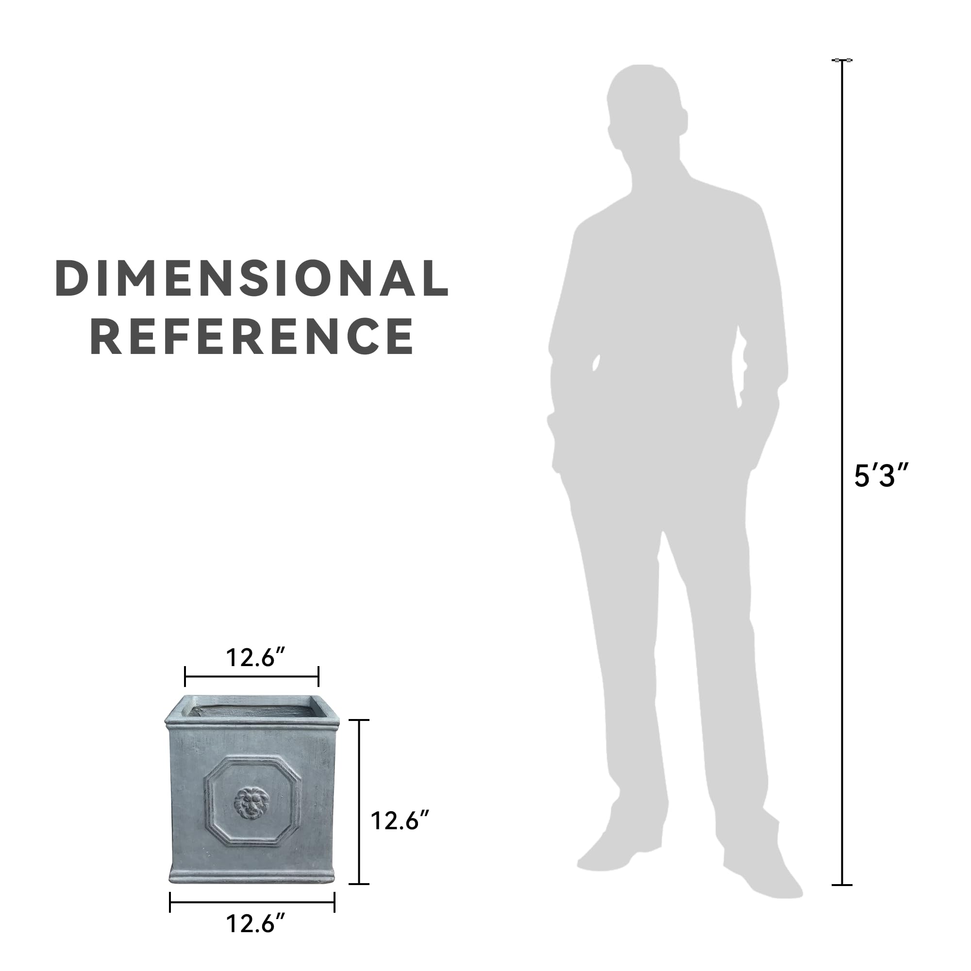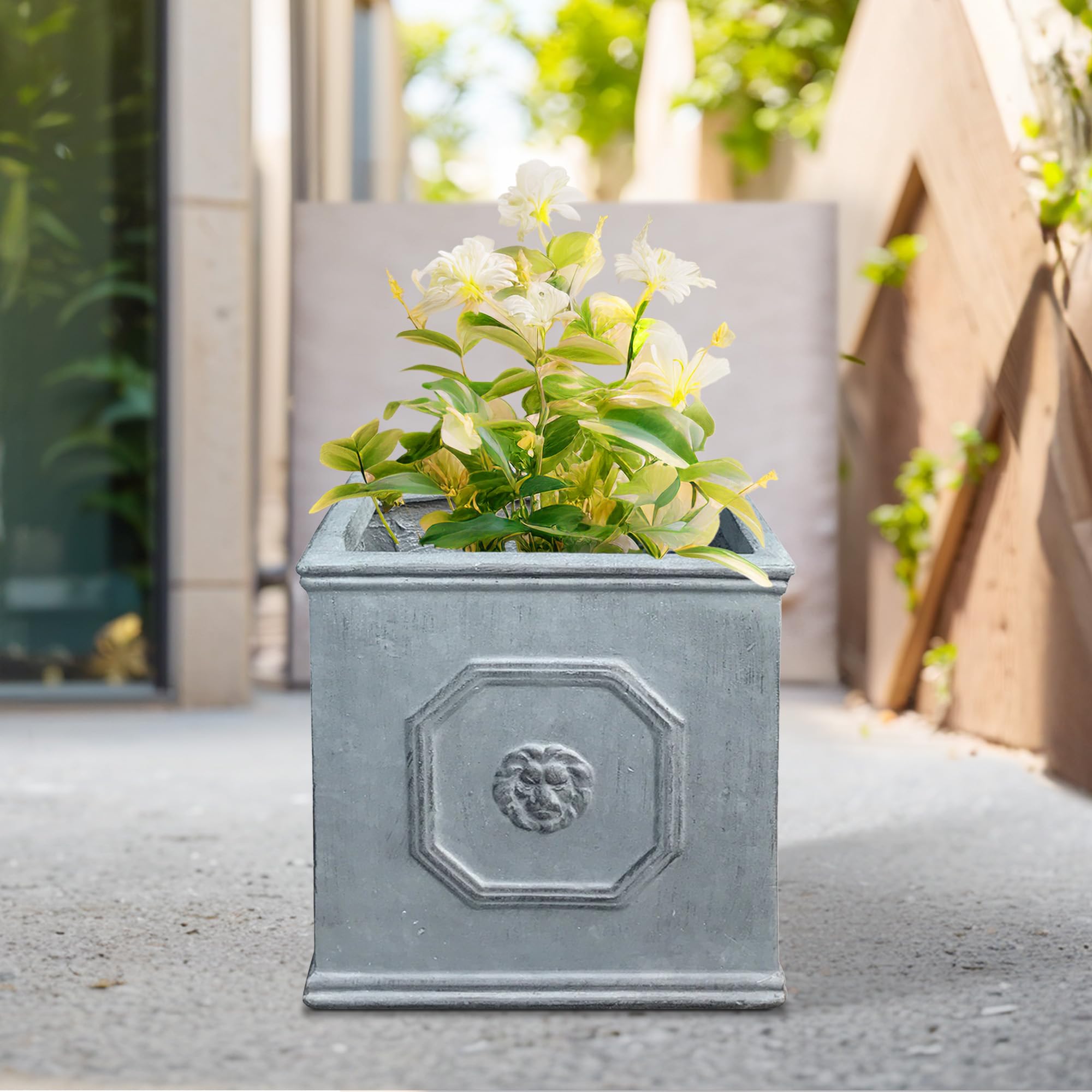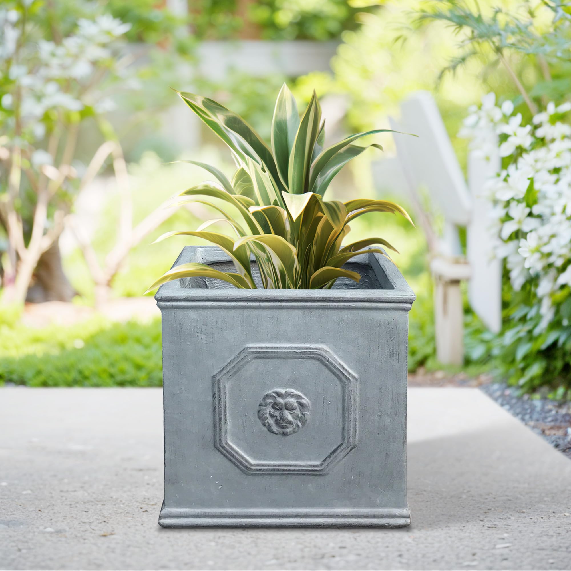 Setzen Sie ein kraftvolles Statement mit diesen quadratischen Pflanzgefässen im englischen Stil. Die Löwenkopfprägung ist ein Symbol für Stärke, Tapferkeit und Königlichkeit. Das Blei-Finish wird den Blick auf die lebendigen Farben Ihrer Pflanze lenken. Hergestellt aus Leichtbeton durch ein umweltfreundliches Herstellungsverfahren. Dieser Verbundwerkstoff hat alle Vorteile von Beton wie Festigkeit, Haltbarkeit, Wetter- und Schadensbeständigkeit, aber aufgrund seines leichteren Gewichts viel einfacher zu bewegen.