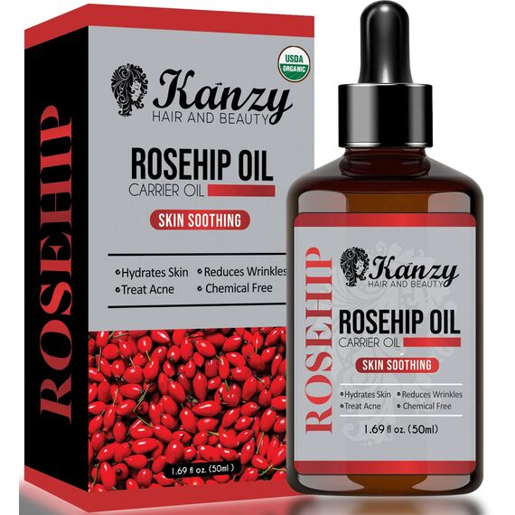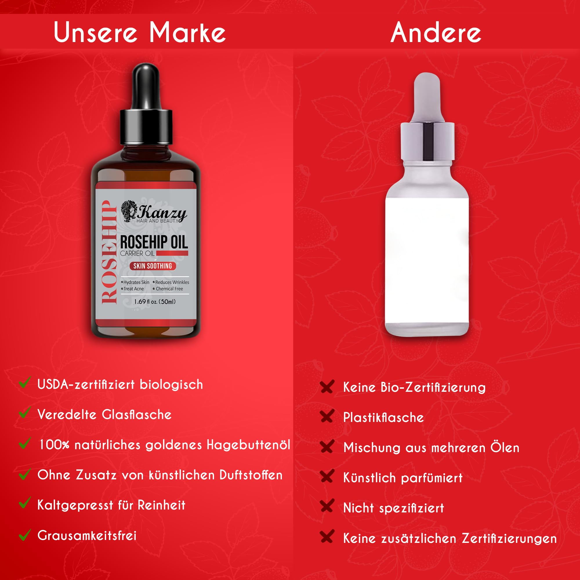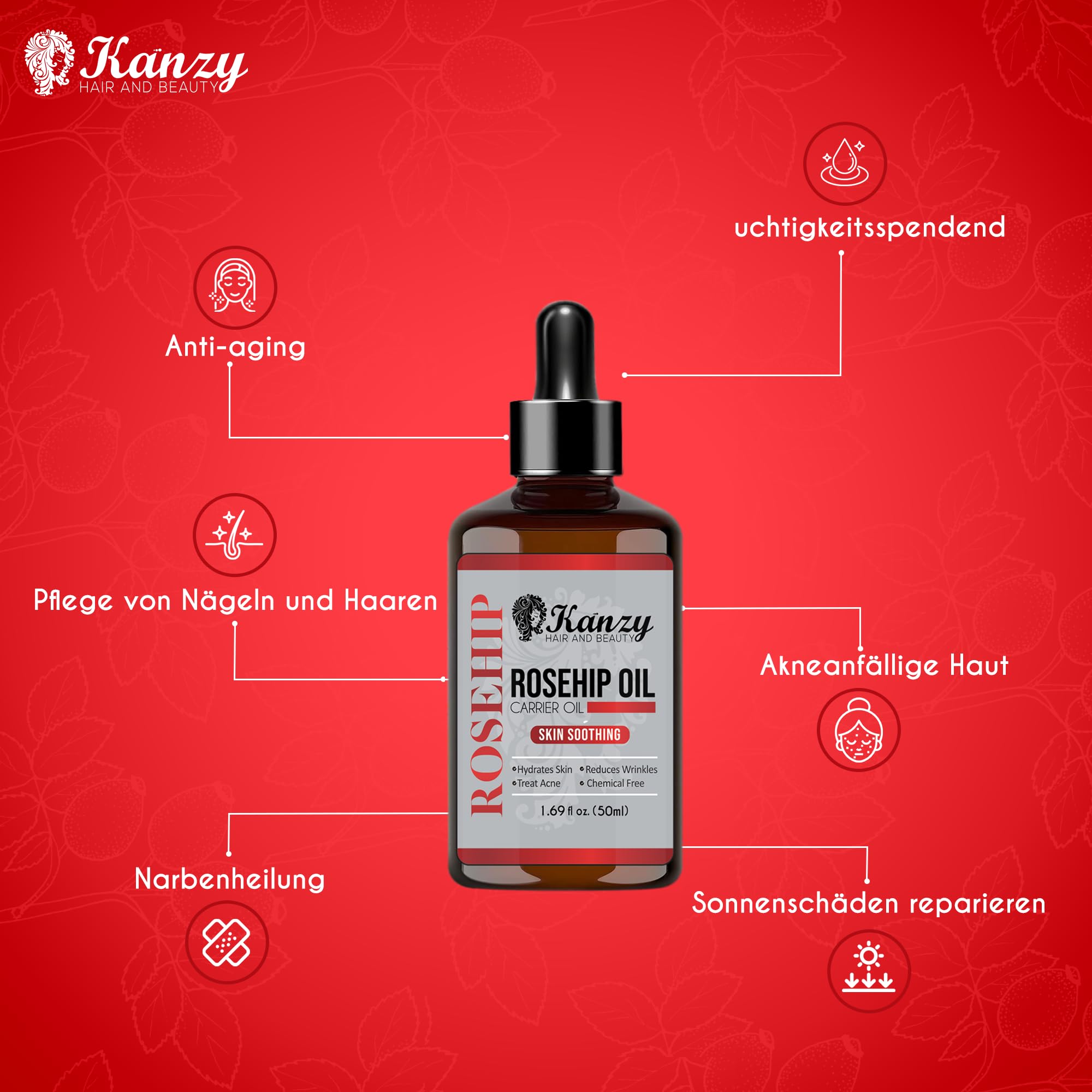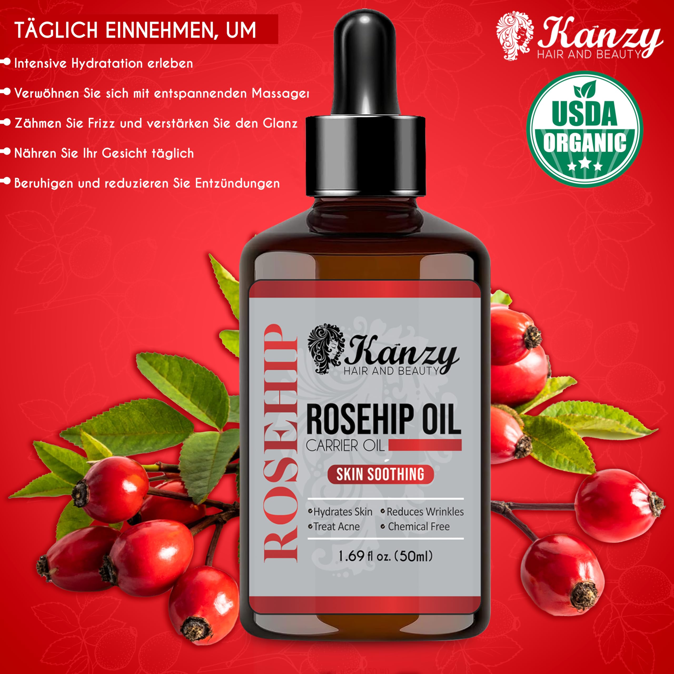 Kanzy Hagebuttenöl Bio Kaltgepresst 100% Rein 50ml Rosehip Oil Wildrosenöl für Haut Haare Nägel Gesichtsöl Körperöl Vegan Hexanfreies Hagebuttenkernöl Anti-Aging Anti-Falten Natürlich