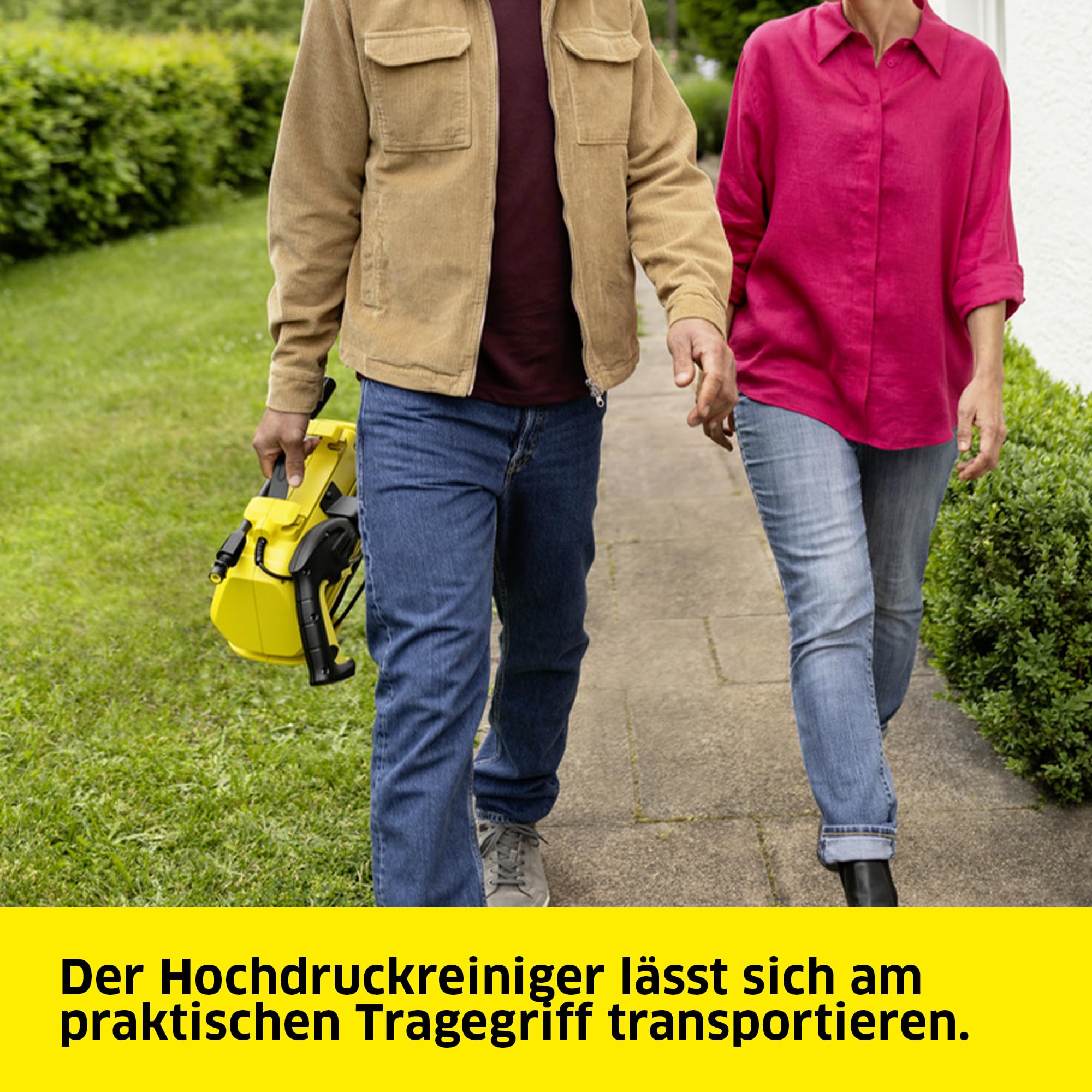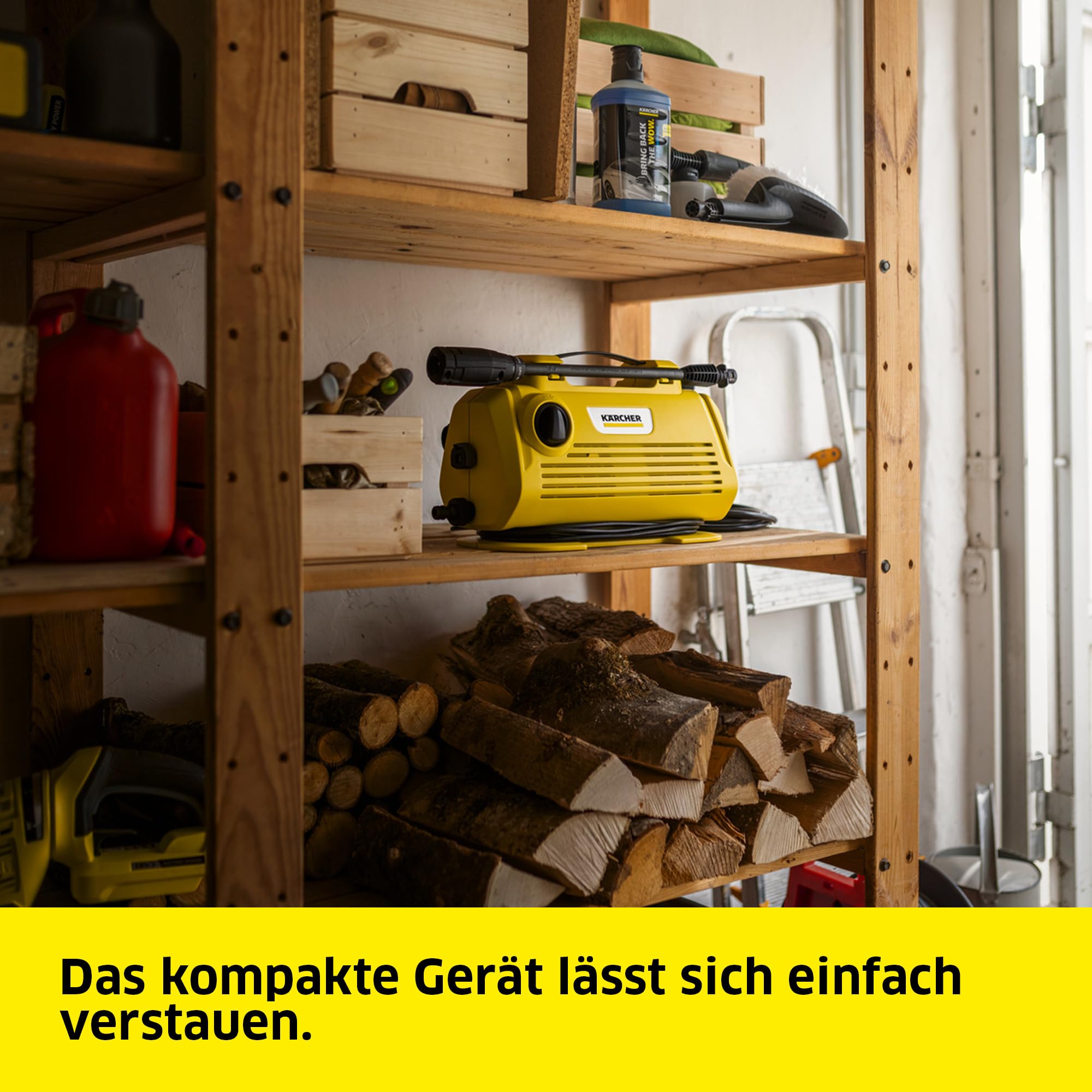 Schnelle Hochdruckreinigung für zwischendurch: Der Kärcher K 2 Horizontal VPS mit luftgekühltem Motor ist der ideale Hochdruckreiniger für den gelegentlichen Einsatz und für leichte Verschmutzungen. Mit einem Druck von maximal 110 bar säubert er zum Beispiel Gartenwerkzeuge, Outdoormöbel und kleinere Flächen. Ausserdem befreit er Fahrräder von Schlamm und Schmutz. Das Gerät hat ein Gewicht von nur 3,5 Kilogramm und kann an dem praktischen Tragegriff bequem zum Einsatzort getragen werden. Das kompakte Design erlaubt es, den Hochdruckreiniger nach der Anwendung einfach zu verstauen. Das mitgelieferte Zubehör lässt sich dafür praktisch direkt am Gerät verwahren, sodass beim nächsten Einsatz alles griffbereit ist. Der Hochdruckreiniger wird mit einer G 120 Q-Hochdruckpistole und einem Vario Power-Strahlrohr geliefert. Das Strahlrohr ist ideal für alle leichteren Verschmutzungen. Der Wasserdruck kann durch einfaches Drehen geändert werden, je nach Oberfläche und Verschmutzungsgrad. Über den integrierten Ansaugmechanismus können Kärcher Reinigungsmittel zugefügt werden, um ein noch besseres Reinigungsergebnis zu erhalten. Die Pistole lässt sich dank Quick Connect-System schnell und einfach mit dem 3 Meter langen Hochdruckschlauch verbinden. Im Lieferumfang befinden sich der Kärcher Hochdruckreiniger K 2 Horizontal VPS, ein 3 m Hochdruckschlauch, eine Hochdruckpistole und ein Vario Power-Strahlrohr.