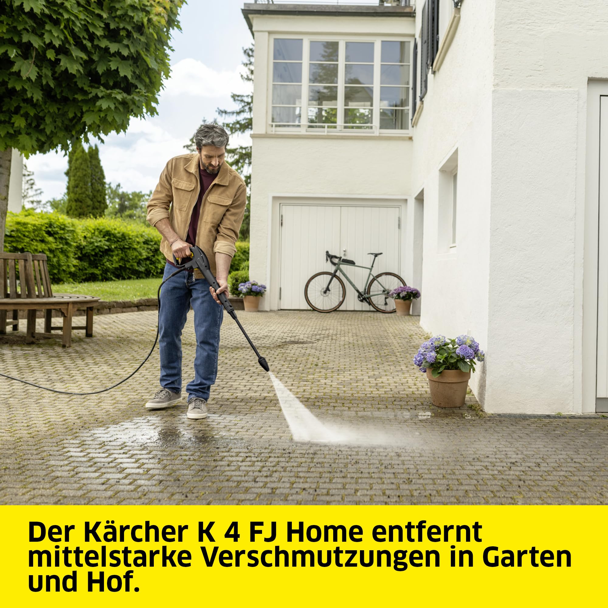 Der Kärcher K 4 FJ Home ist der ideale Hochdruckreiniger für regelmässige Einsätze. Mit einem Druck von bis zu 130 bar bietet er eine kraftvolle Reinigungsleistung und überzeugt mit einer Flächenleistung von bis zu 30 m2/h. Damit eignet er sich zum Beispiel für die Reinigung von Gartenmöbeln, Gartengeräten, Terrassen, Treppen, Gehwegen und von Fahrzeugen wie Auto, Motorrad und Fahrrad. Hochdruckschlauch und Hochdruckpistole lassen sich durch das innovative Quick Connect-System einfach zusammenstecken und sicher miteinander verbinden. Der Kärcher K 4 FJ Home wird mit zwei Strahlrohren geliefert: Das Vario Power Jet-Strahlrohr eignet sich für verschiedene Reinigungsarbeiten rund um Garten und Hof. Mit dem Dreckfräser werden hartnäckige Ablagerungen, zum Beispiel von Treppen und Mauern, entfernt. Die Schaumdüse lässt sich mit Reinigungsmittel befüllen und bringt dieses als feinen, kraftvollen Schaum aus. Das Home Kit beinhaltet ausserdem einen T 5 Flächenreiniger, mit dem die Bodenreinigung schnell, effektiv und spritzfrei funktioniert. Durch das praktische Design des Hochdruckreinigers können Zubehörteile wie die Strahlrohre, die Hochdruckpistole und der Hochdruckschlauch platzsparend am Gerät untergebracht werden. Der fixierte Griff sorgt zudem für ein einfaches und angenehmes Manövrieren. Der Lieferumfang beinhaltet den Kärcher Hochdruckreiniger K 4 FJ Home, einen 6-m-Hochdruckschlauch, eine G 180 Q Hochdruckpistole, ein Vario Power Jet-Strahlrohr, einen Dreckfräser, eine Schaumdüse, einen T 5 Flächenreiniger sowie die Reinigungsmittel Autoshampoo RM 562 und „Patio & Deck“ (je 500 ml).