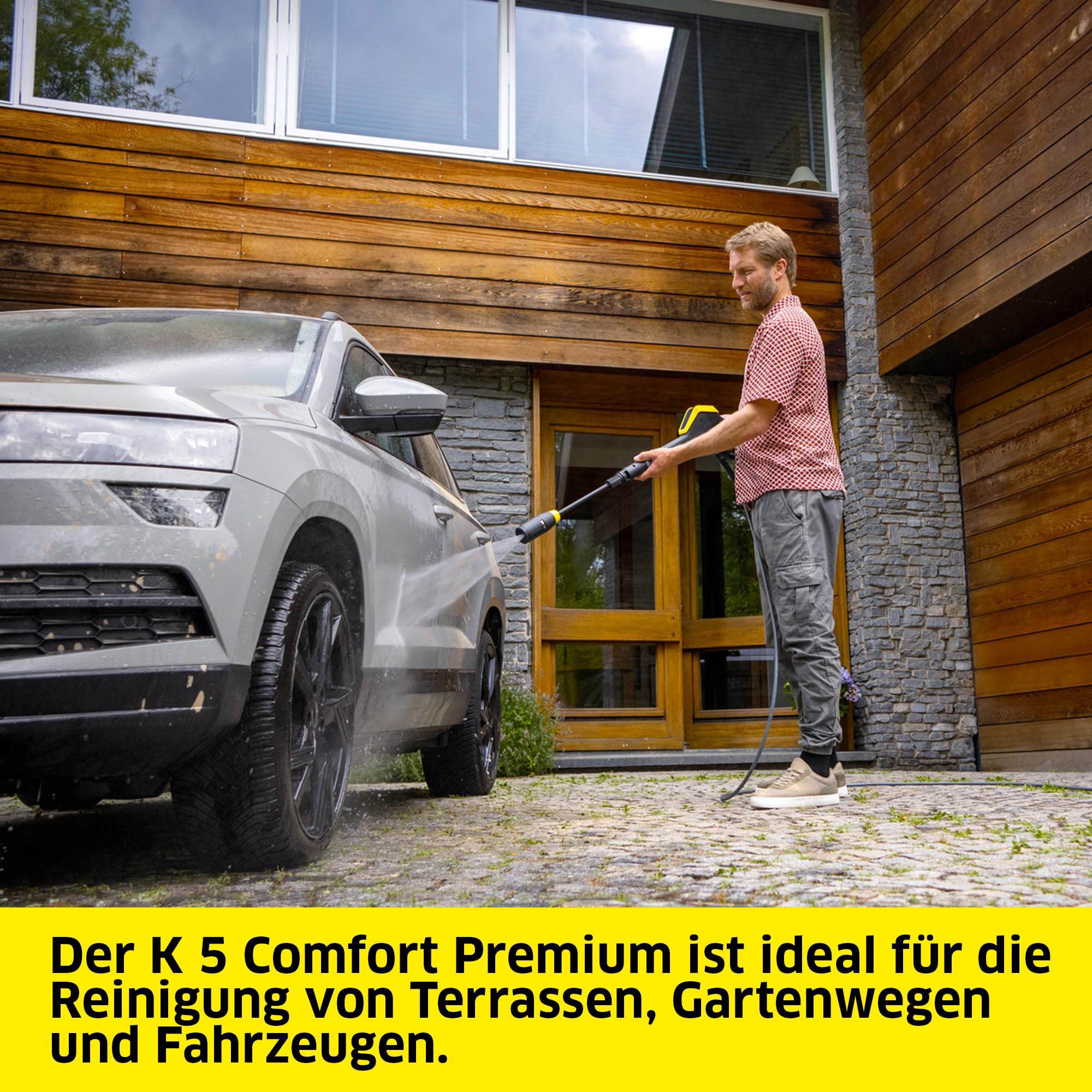 Der Kärcher Hochdruckreiniger K 5 Comfort Premium mit einem Druck von bis zu 145 bar und einer Fördermenge von bis zu 500 l/h beseitigt Schmutz von Terrassen und Gartenwegen, Outdoormöbeln und Werkzeugen sowie Fahrzeugen gründlich und schonend. Die Hochdruckpistole Comfort macht die Reinigung besonders einfach, indem sie die Haltekräfte dank dem COMFORT!Hold reduziert. Am 4-in-1 Multi Jet Strahlrohr lassen sich durch Drehen vier Strahlarten für verschiedene Reinigungssituationen einstellen: Dreckfräser, Flachstrahl, breiter und druckreduzierter Flachstrahl sowie ein Reinigungsmittelstrahl. Zum Aufbringen von Reinigungsmitteln gibt es dank des 2-in-1-Konzepts zwei Möglichkeiten - entweder direkt über das Gerät und Multi Jet oder über die Hochdruckpistole als Schaumdüse, wodurch mehr Schaum entsteht. Der 10 Meter lange Hochdruckschlauch ist besonders flexibel und verknotet nicht. Er lässt sich bequem mit der integrierten Schlauchtrommel auf- und abwickeln. Der Schlauchanschluss befindet sich zudem auf der einen Geräteseite, während sich Gartenschlauchanschluss und Stromkabel auf der anderen befinden. So können sich Schläuche und Kabel nicht ineinander verheddern. Weitere Features wie die grossen Transporträder, der arretierbare Teleskopgriff, der zusätzliche Tragegriff an der Gerätevorderseite und die Zubehörhalterungen machen die Nutzung des Hochdruckreinigers besonders komfortabel. Der K 5 Comfort Premium wird von der Kärcher Home & Garden App unterstützt. Darin finden sich viele nützliche Tipps zur Reinigung mit dem Hochdruckreiniger. Lieferumfang: Kärcher Hochdruckreiniger K 5 Comfort Premium, Hochdruckpistole Comfort, 4-in-1 Multi Jet Strahlrohr, extra flexibler Hochdruckschlauch (10 m), Universalreiniger RM 626 (1 l).