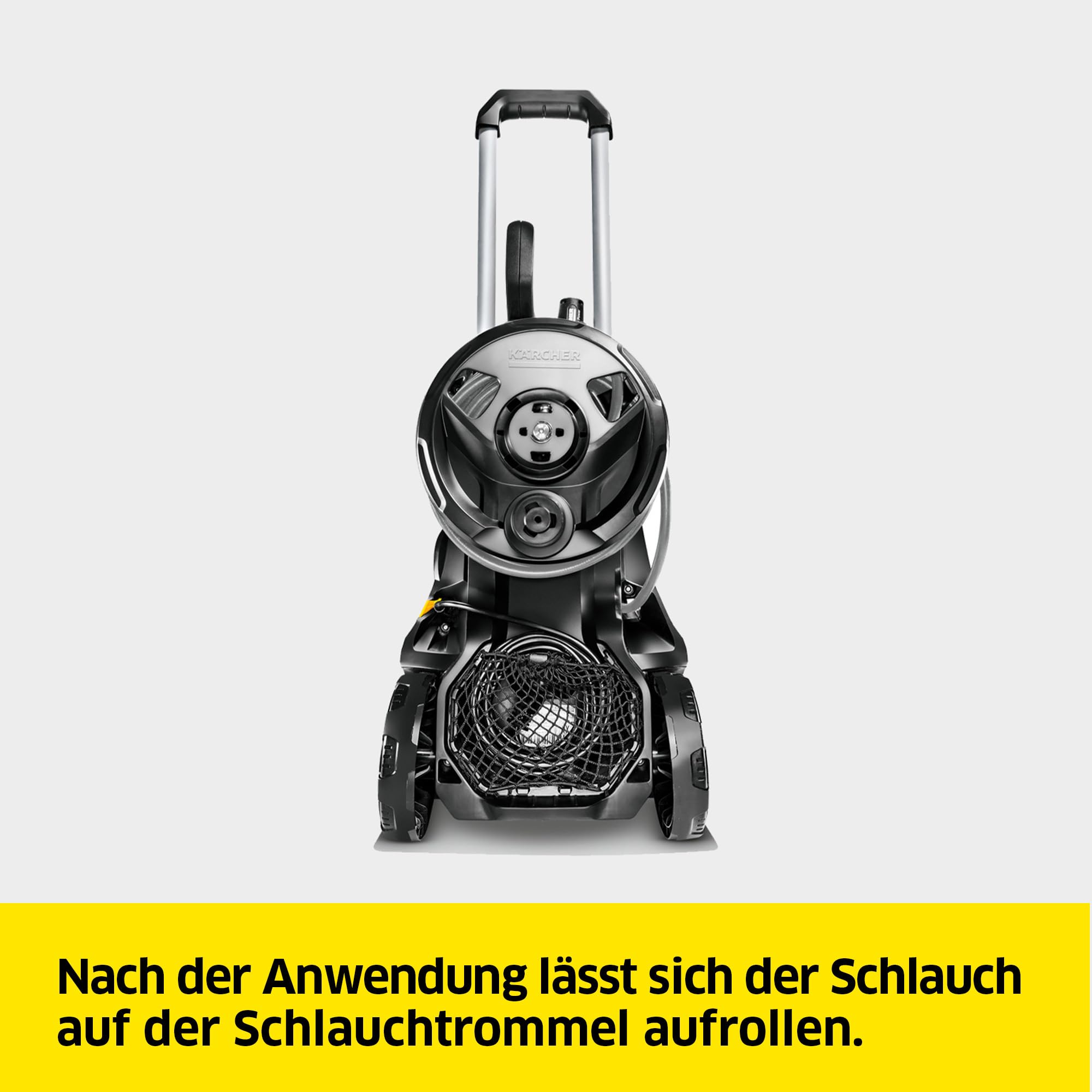Smarte Reinigung leicht gemacht: Der Hochdruckreiniger K 7 Premium Smart Control Flex mit wassergekühltem Motor ist nicht nur besonders leistungsstark, sondern lässt sich auch ganz einfach verwenden. Mit einem Druck von bis zu 180 bar reinigt der Kärcher Hochdruckreiniger eine Fläche von bis zu 60 m² pro Stunde. Er ist zum Beispiel für das Säubern von Autos, Wohnmobilen, Fahrrädern, Motorrädern, Gartenmöbeln und -geräten, Zäunen, Gartenwegen, Terrassen, Aussentreppen und Mauern geeignet. Im Anwendungsberater der Kärcher Home & Garden App gibt es Schritt-für-Schritt-Anleitungen für diverse Reinigungsaufgaben. Die richtige Druckstufe lässt sich via Bluetooth direkt auf den Hochdruckreiniger übertragen. Alternativ lassen sich die Druckstufe und die Reinigungsmitteldosierung an der G 180 Q Smart Control-Hochdruckpistole einstellen. Das LCD-Display zeigt auf einen Blick, welche Reinigungsstufe eingestellt ist. Das 3-in-1-Multi Jet-Strahlrohr verfügt über drei Strahlarten, die durch Drehen am Strahlrohr gewechselt werden können. Der Boost Mode ermöglicht eine kraftvolle Spot-Reinigung bei hartnäckigen Verschmutzungen. Mittels Plug 'n' Clean können Reinigungsmittelflaschen von Kärcher einfach in das Gerät gesteckt werden. Die Schlauchtrommel erlaubt das komfortable Auf- und Abrollen des 10 Meter langen Flex-Hochdruckschlauchs. Zubehör kann direkt am Gerät verstaut werden. Der Teleskopgriff aus Aluminium lässt sich zum Transport herauszuziehen und zum Verstauen praktisch versenken. Im Lieferumfang befinden sich der Kärcher Hochdruckreiniger K 7 Premium Smart Control Flex, ein 10 m Flex-Hochdruckschlauch, eine Hochdruckpistole und ein 3-in-1-Multi Jet-Strahlrohr.
