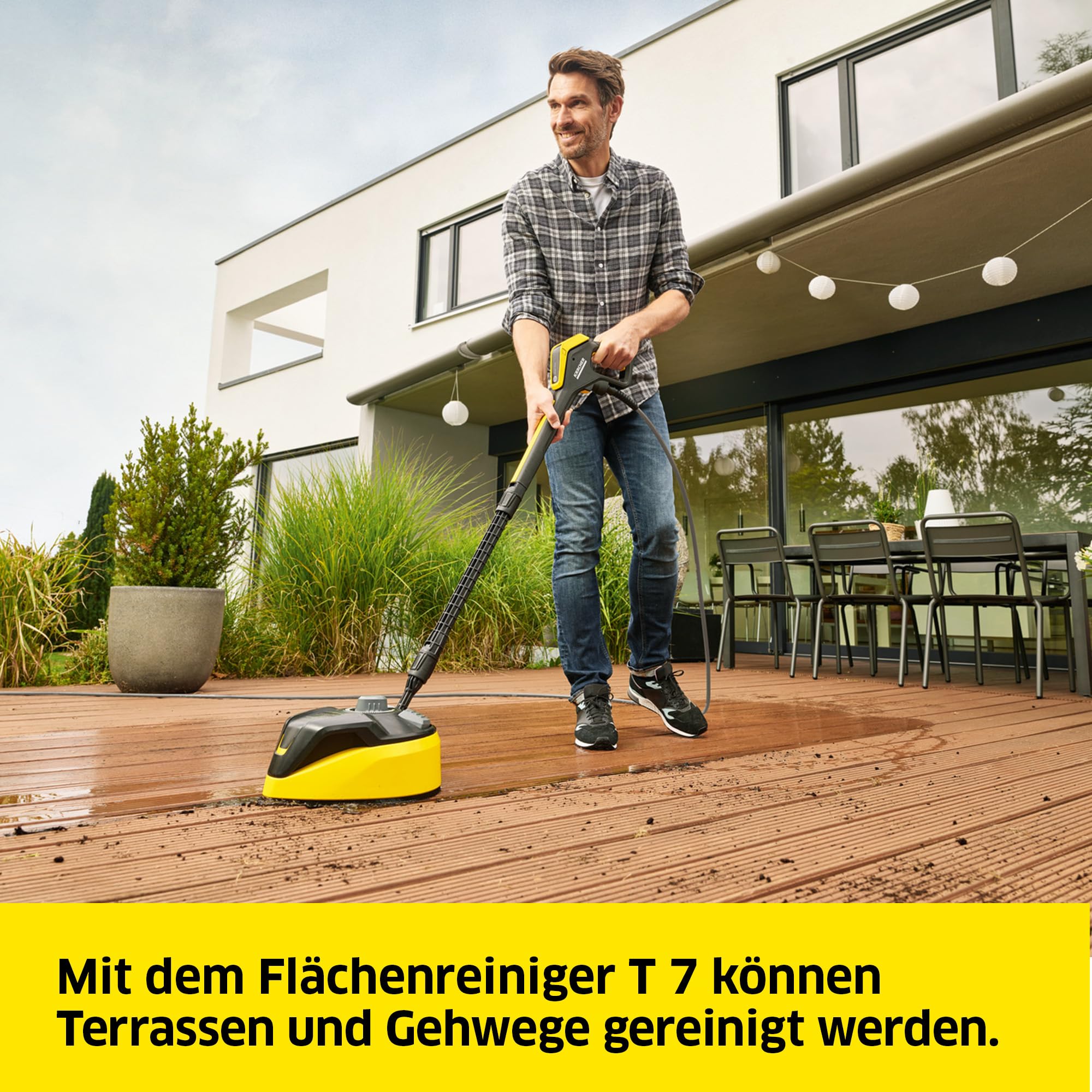 Smarte Reinigung leicht gemacht: Der Hochdruckreiniger K 7 Premium Smart Control Flex Home mit wassergekühltem Motor ist nicht nur besonders leistungsstark, sondern lässt sich auch ganz einfach verwenden. Mit einem Druck von bis zu 180 bar reinigt der Kärcher Hochdruckreiniger eine Fläche von bis zu 60 m² pro Stunde. Er ist zum Beispiel für das Säubern von Autos, Wohnmobilen, Fahrrädern, Motorrädern, Gartenmöbeln und -geräten, Zäunen, Gartenwegen, Terrassen, Aussentreppen und Mauern geeignet. Mit dem Home Kit, bestehend aus dem Flächenreiniger T 7 und dem Reinigungsmittel "Steinreiniger 3-in-1", lassen sich grosse Flächen wie Terrassen einfach säubern. Im Anwendungsberater der Kärcher Home & Garden App gibt es Schritt-für-Schritt-Anleitungen für diverse Reinigungsaufgaben. Die richtige Druckstufe lässt sich via Bluetooth direkt auf den Hochdruckreiniger übertragen. Alternativ lassen sich die Druckstufe und die Reinigungsmitteldosierung an der G 180 Q Smart Control-Hochdruckpistole einstellen. Das LCD-Display zeigt auf einen Blick, welche Reinigungsstufe eingestellt ist. Das 3-in-1-Multi Jet-Strahlrohr verfügt über drei Strahlarten, die durch Drehen am Strahlrohr gewechselt werden können. Der Boost Mode ermöglicht eine kraftvolle Spot-Reinigung bei hartnäckigen Verschmutzungen. Mittels Plug 'n' Clean können Reinigungsmittelflaschen von Kärcher einfach in das Gerät gesteckt werden. Die Schlauchtrommel erlaubt das komfortable Auf- und Abrollen des 10 Meter langen Flex-Hochdruckschlauchs. Zubehör kann direkt am Gerät verstaut werden. Der Teleskopgriff aus Aluminium lässt sich zum Transport herauszuziehen und zum Verstauen praktisch versenken. Im Lieferumfang befinden sich der Kärcher Hochdruckreiniger K 7 Premium Smart Control Flex Home, ein 10 m Flex-Hochdruckschlauch, eine Hochdruckpistole, ein 3-in-1-Multi Jet-Strahlrohr sowie das Home Kit (Flächenreiniger T 7 und Reinigungsmittel "Steinreiniger 3-in-1" (1 l)).