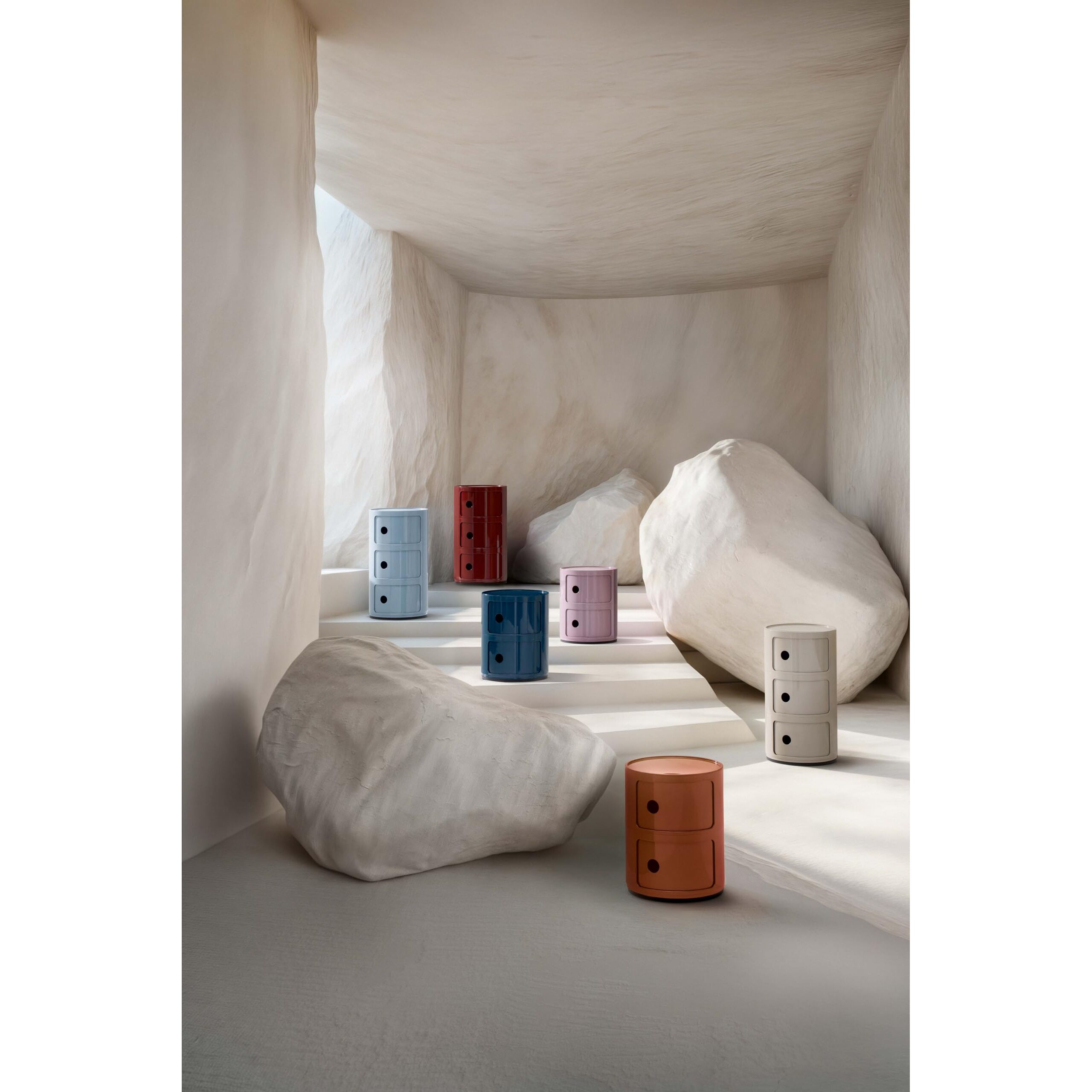 Die zusammensetzbaren Elemente wurden entwickelt, um verschiedene Verwendungsbedürfnisse zu erfüllen und in jedem Raum des Hauses verwendet werden zu können. Die Projektlösung, die das System der zusammensetzbaren Elemente animiert, ist die elementare und solide vertikale Überlagerung der einzelnen Stücke, die durch einfaches Einspannen praktische Behältermöbel zusammensetzen. Die zusammensetzbaren Elemente werden in runder und quadratischer Form angeboten und können auf Rädern liegen. Die flexiblen, zweckmässigen, praktischen zusammensetzbaren Elemente aus dem Jahr 1967 sind ein zeitloser Klassiker der Einrichtung.