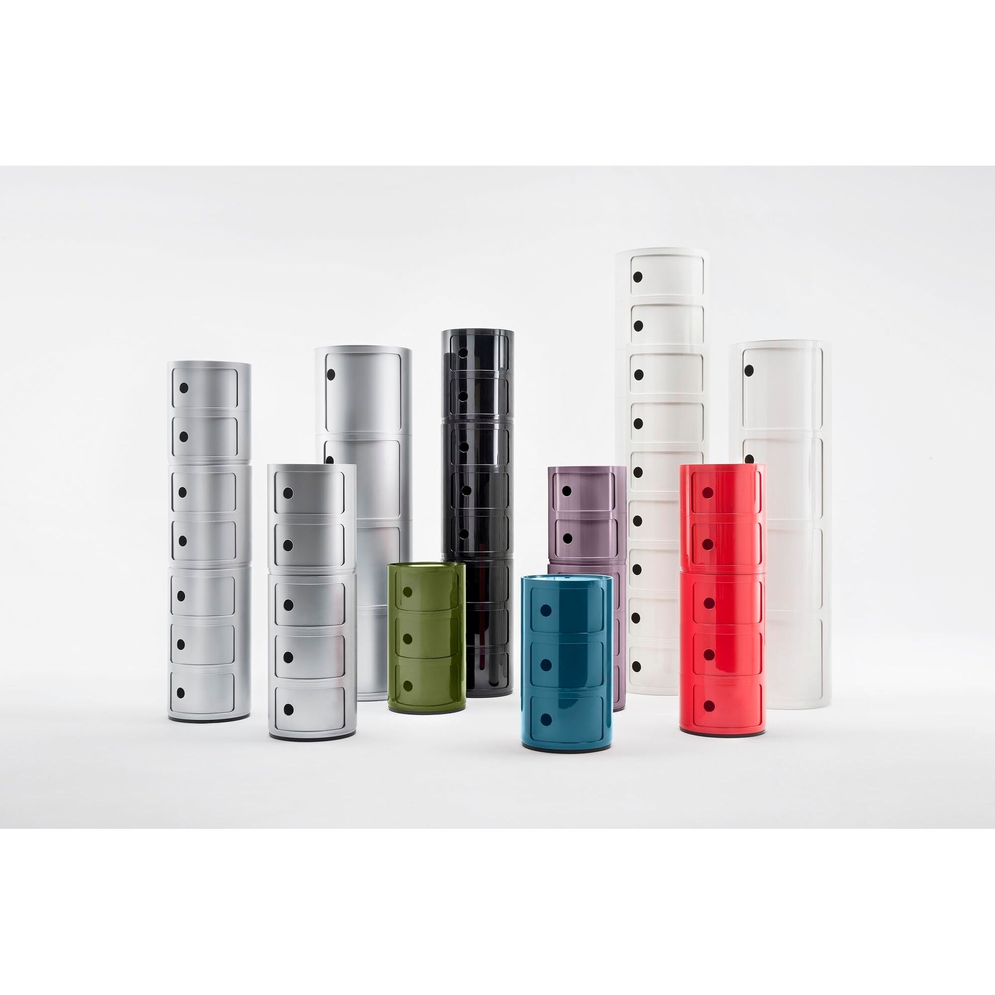Diese Baukastenelemente wurden entwickelt, um verschiedenste Verwendungsanforderungen zu schaffen: Badezimmer, Schlafzimmer, Küche und Wohnzimmer. Die Projektlösung, die hinter dem System Componibili steht, ist die elementare und gleichzeitig solide Stapelbarkeit der einzelnen Elemente durch einfaches Zusammenstecken, wodurch praktische Aufbewahrungsmöbel entstehen. Die Componibili gibt es rund und quadratisch und sie können auch auf Rollen geliefert werden. Flexibel, funktional, praktisch: Die Componibili sind ein Designklassiker mit fast vierzigjähriger Tradition, der wegen der Prägnanz und Innovation der Gestaltung viel Anerkennung erlangt hat und längst in die ständige Ausstellung des Museums of Modern Art in New York und ins Centre George Pompidou in Paris gerollt ist.