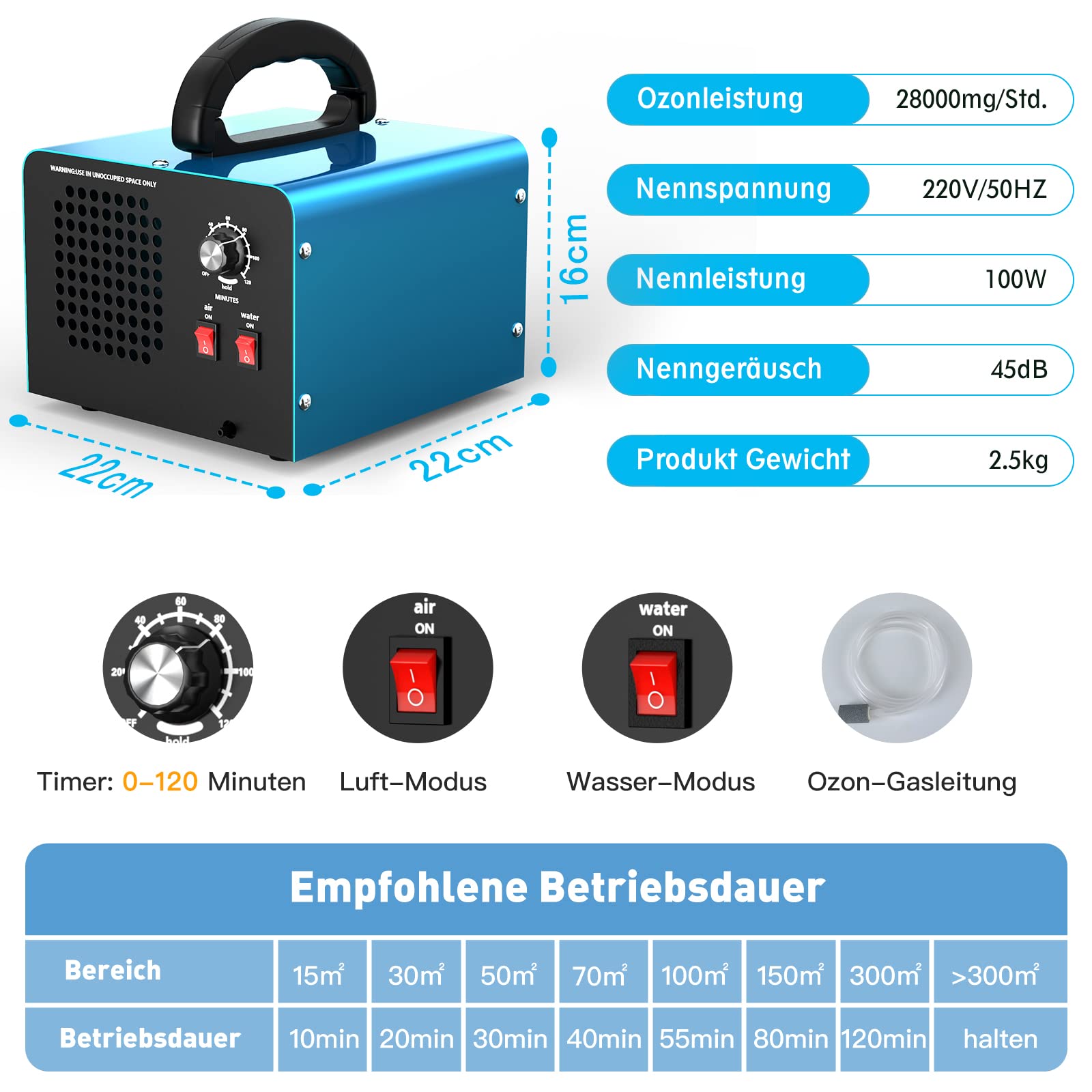 Hohe Ozonleistung von 28000mg/h, schnellere Verarbeitung von Innengerüchen.