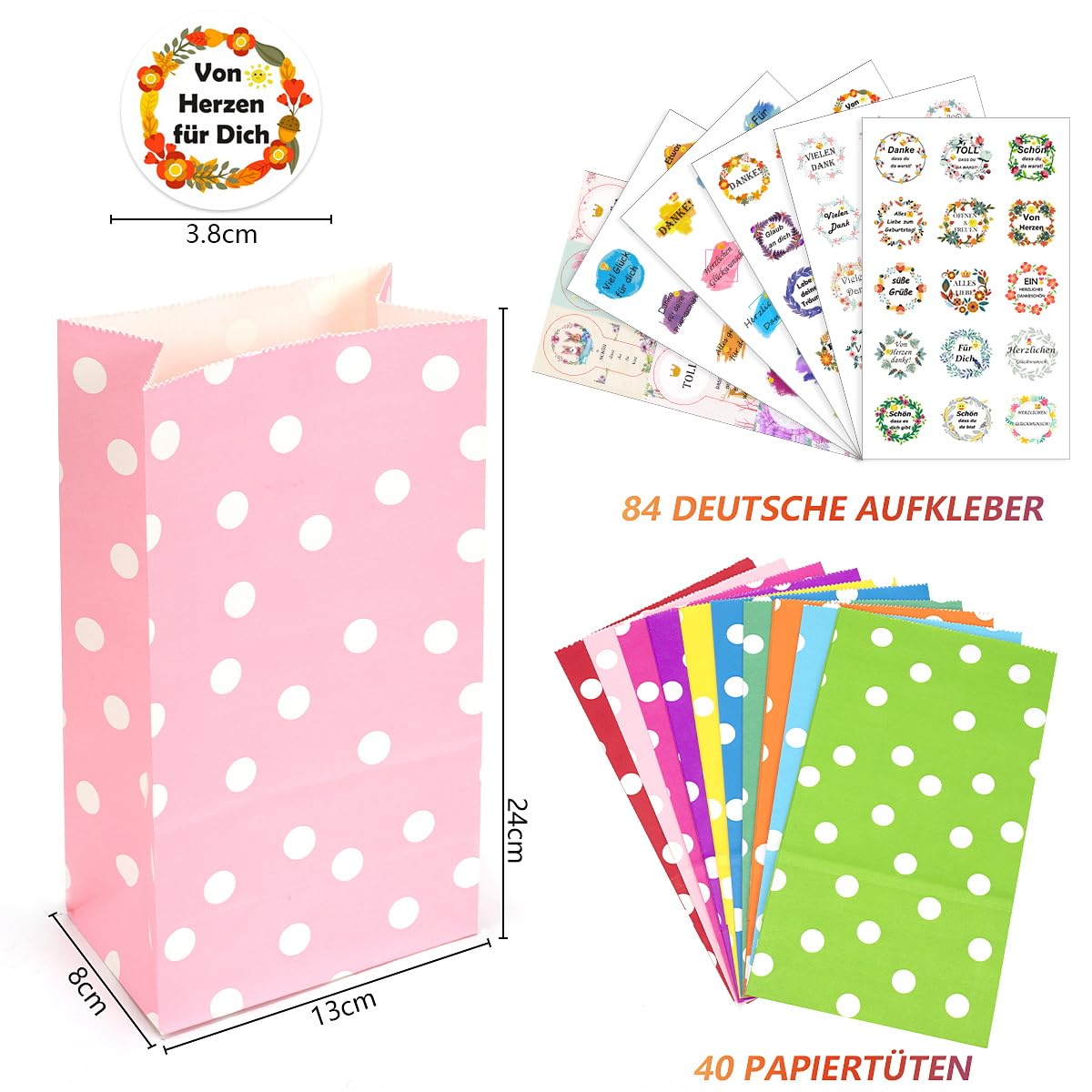 KASZOO Papiertüten, 40 Stück Bunte Geschenktütenmit 84 Aufkleber (Auf Deutsch) Candy Tüten zum Verpacken von Geschenken, Giveaways, Kindergeburtstag, Hochzeit, Party, usw